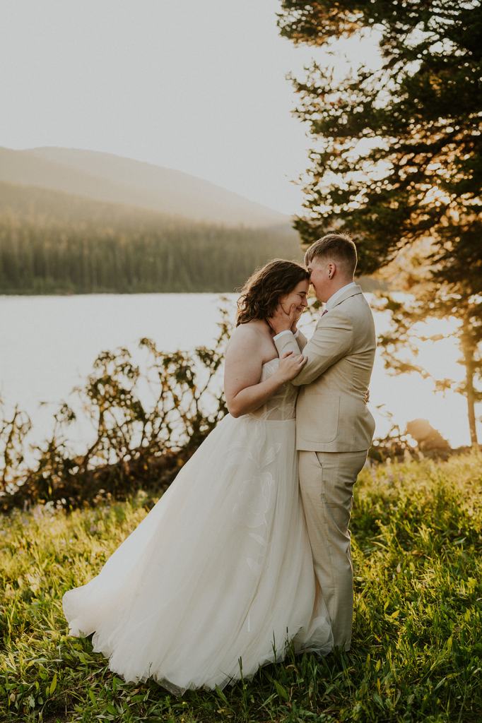 The thing I look forward to most when photographing a Glacier National Park Elopement are sunset photos. There is nothing like watching the alpen glow on the mountains or watching the reflection on the lake. After sharing vows, Erin and Olivia basked in the sunset. Olivia’s favorite flowers are lupines, and we found the perfect lupine meadow near the edge of the lake. Taking golden hour portraits felt like a dream come true in this magical place.