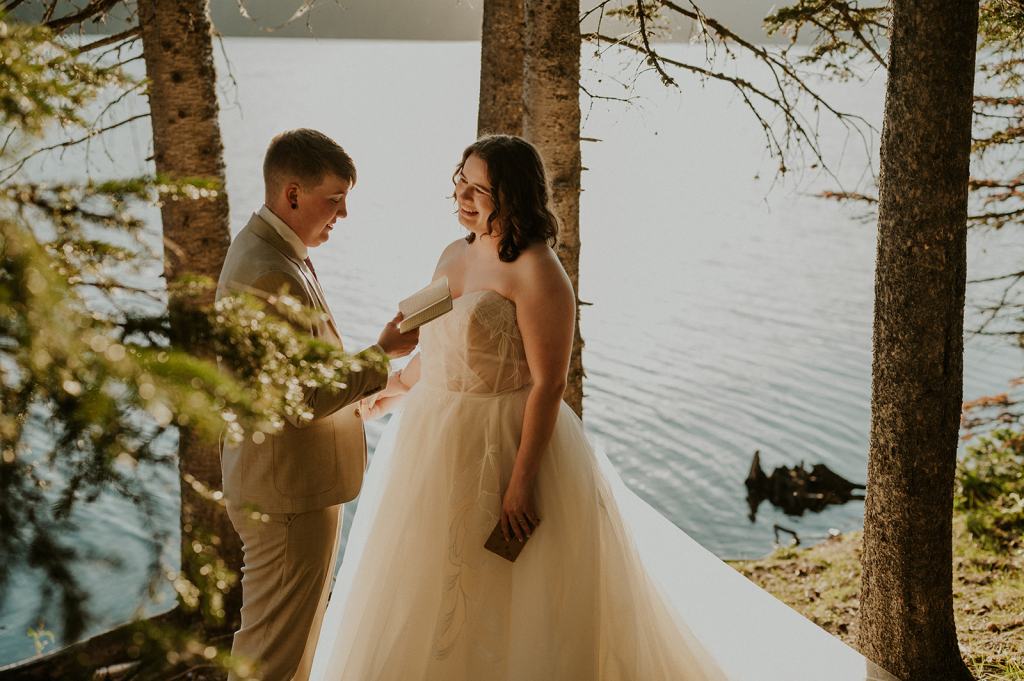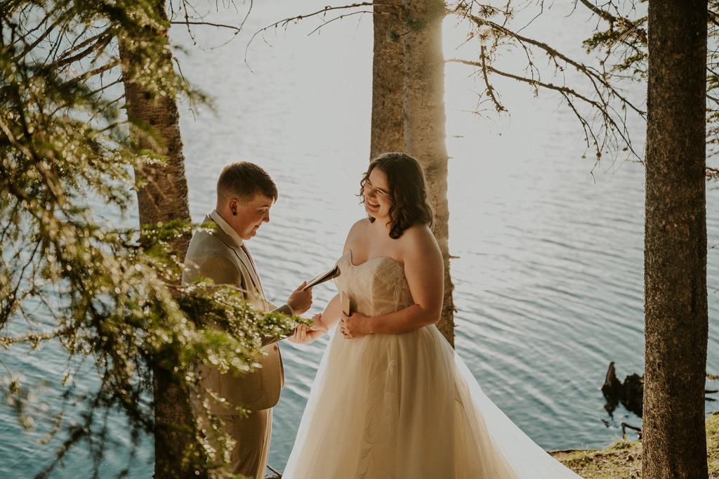 With no one else around for miles, Erin and Olivia shared personal vows alone along the lake shores. We hiked into this private beach I had scouted the night before. No one else could be seen or heard as Erin and Olivia cried and laughed their way through their vows. I kept my distance as they shared personal vows, allowing them to feel fully present without any distractions. I wanted to make sure that they were the only people who could hear one another, myself excluded. A lot of times as an elopement photographer, I will do my best to give my couples full privacy. I want couples to feel completely safe sharing their hearts with their person. Thanks to my trusty zoom lens, I can stay far back and still get great photos.