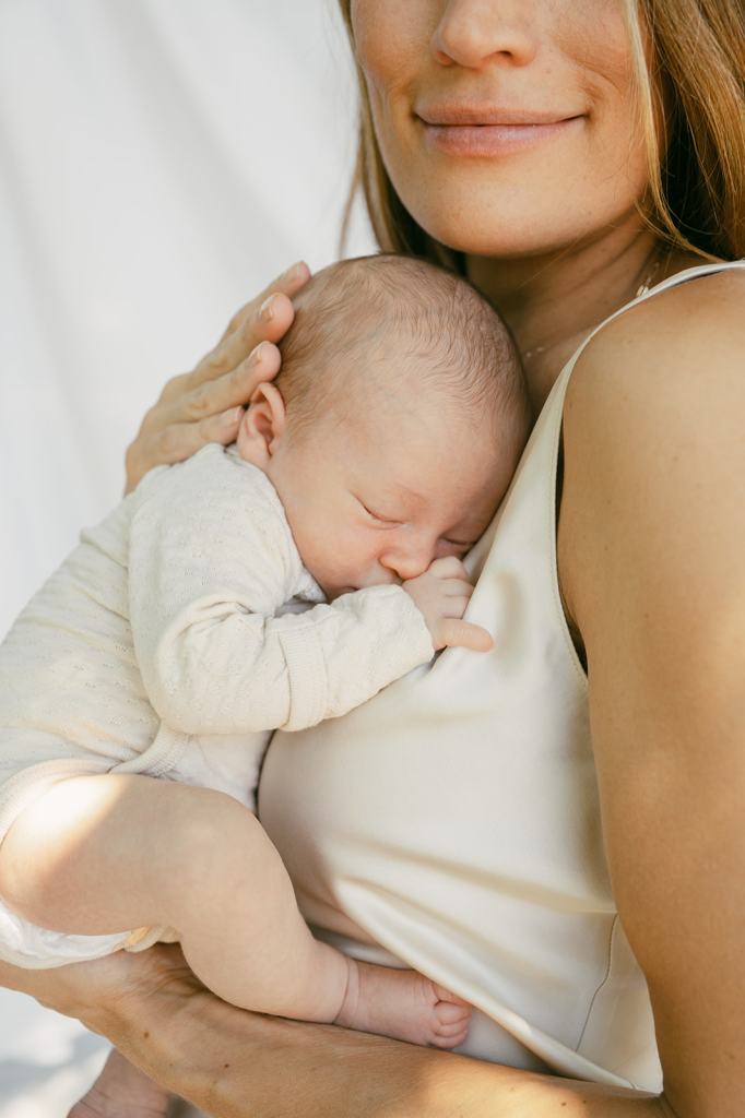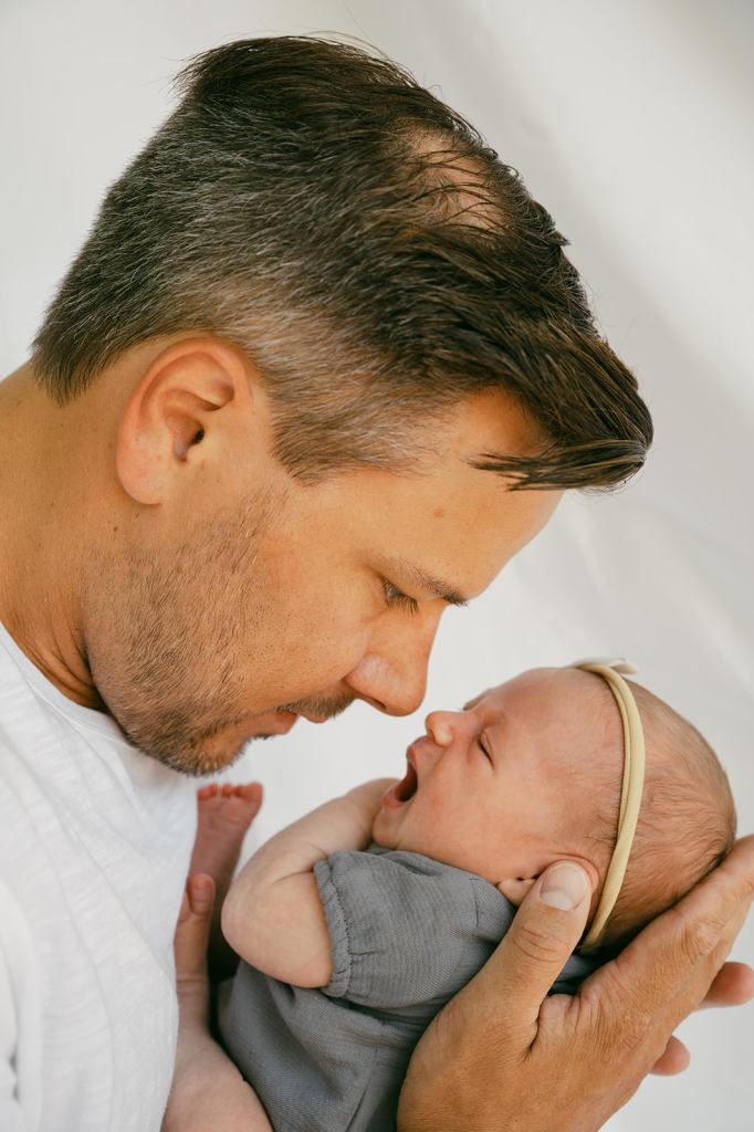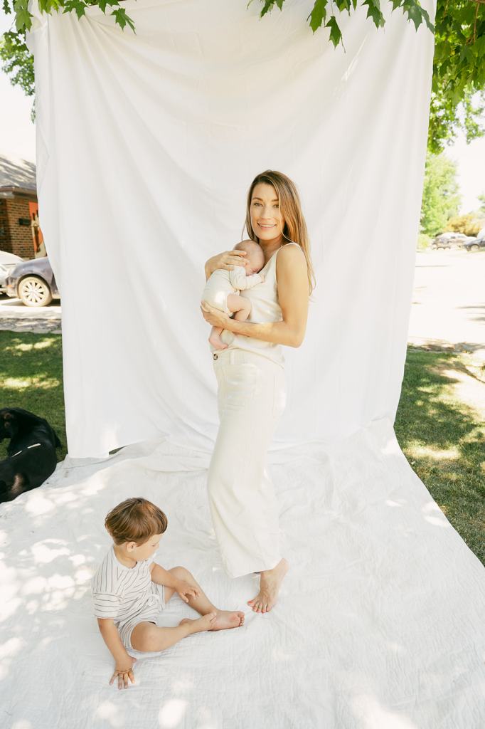 My favorite thing about working with Drew and Dexter is that they encourage me to be fully creative. I’ve photographed them over eight times and I never want to replicate the same session. For their lifestyle newborn session, I wanted to show off their favorite space in their house. Their front yard is the place they spend the most time outside. It felt natural to incorporate their front yard into their photos because most of their memories take place there. Drew told me she dreamed of clean, summery, editorial lifestyle newborn photos. We hung up a simple white sheet in their giant front yard tree and it was perfect!