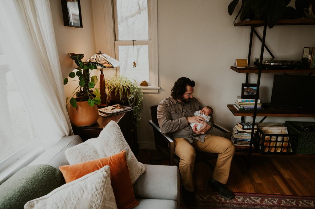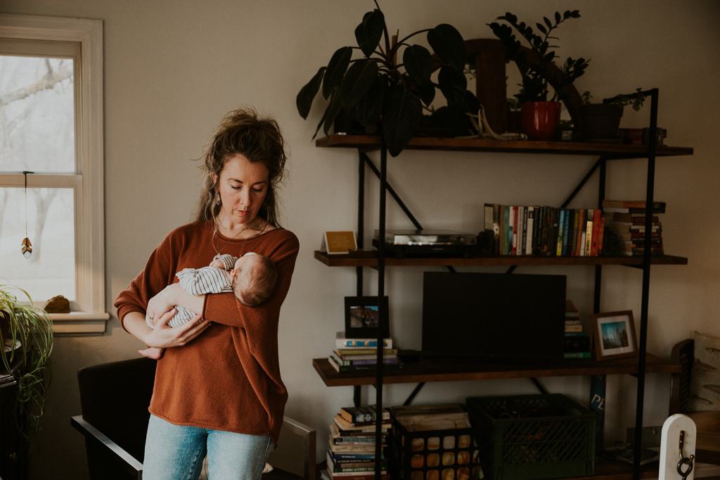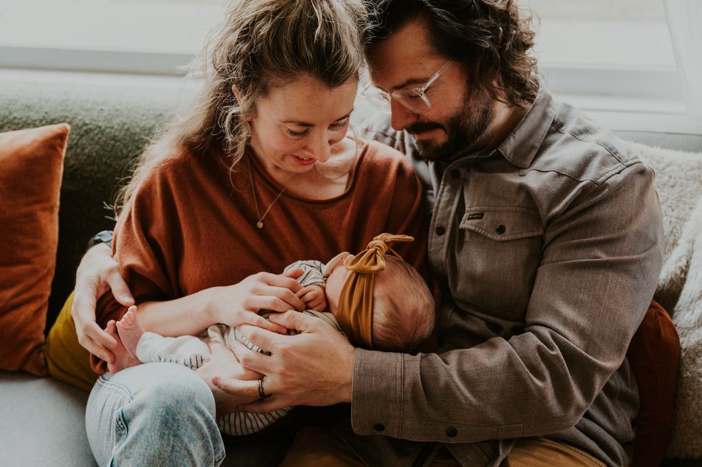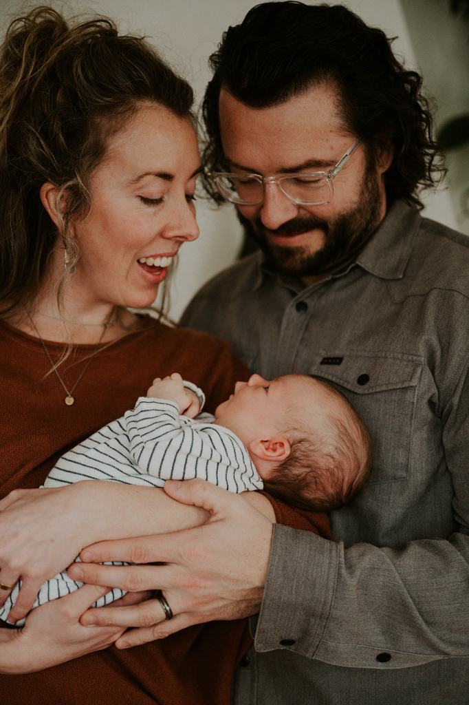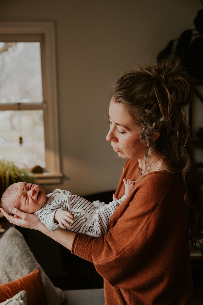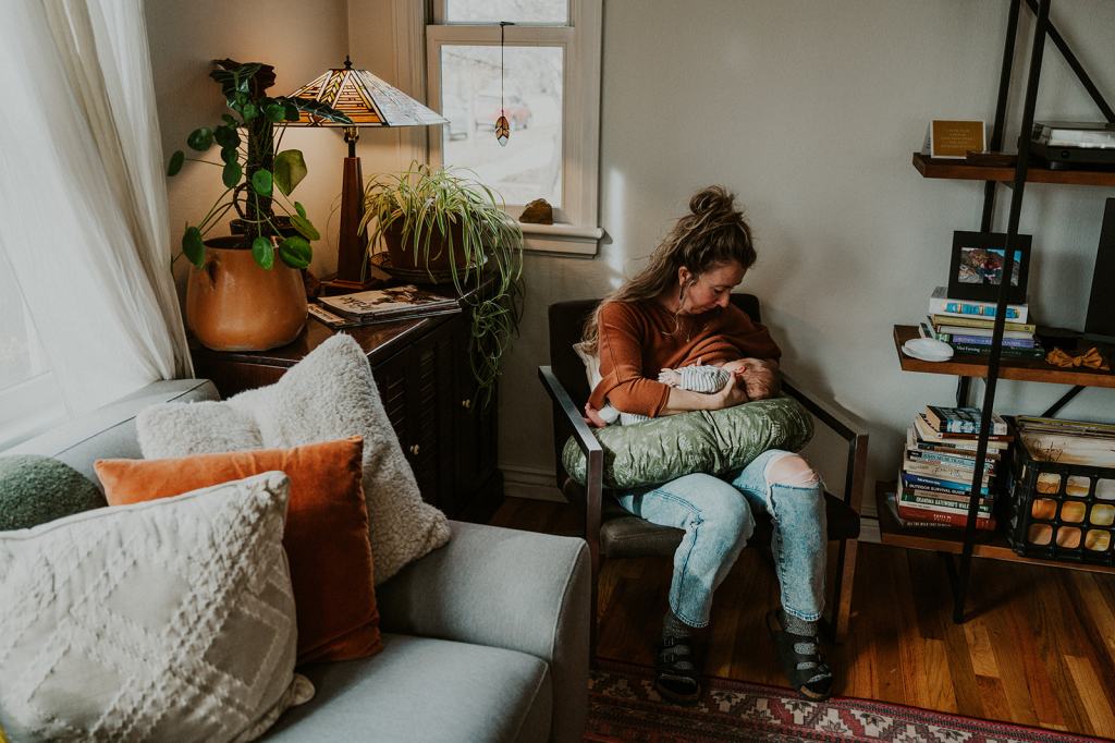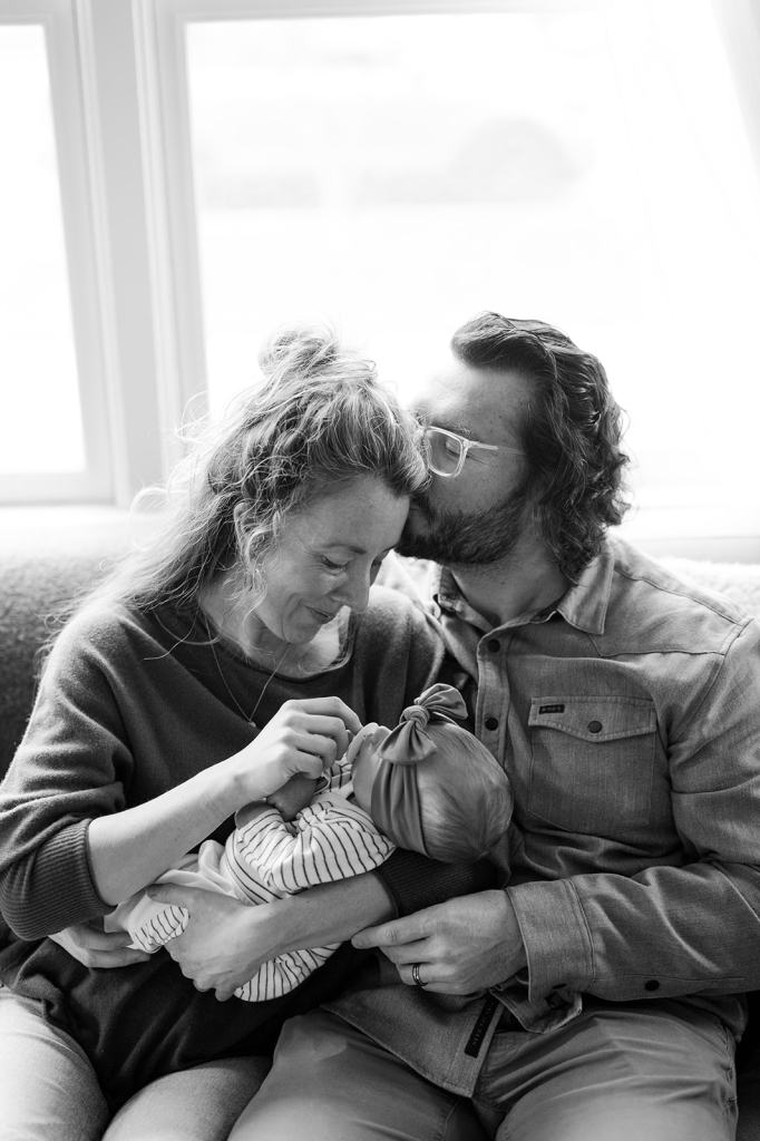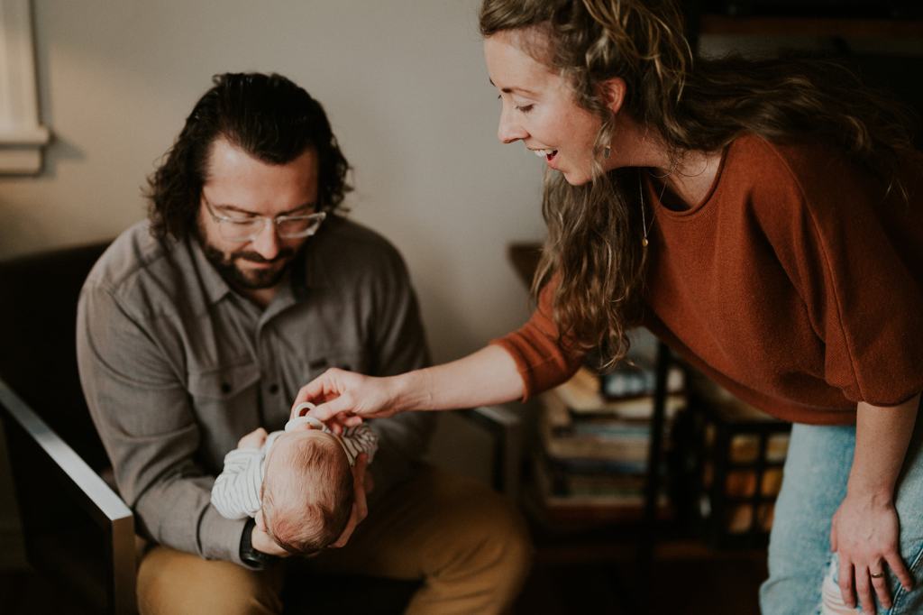 On a lovely Saturday morning, I arrived. Kyla and Roby’s home felt so peaceful and tranquil when I showed up. Kyla played soft folk music through the speakers. She had just finished nursing baby Isla Grace. I always say during lifestyle newborn photos that the baby is the boss. No matter how long it takes, I’ll stay until we get everything we need. I like it to feel as much like I’m a fly on the wall as possible. A couple times, Kyla had to pause to nurse Isla or change her. I simply documented a morning of the three of them doing what they might be doing if I wasn’t there! They cuddled on the couch. Cedar even leapt onto the couch to join them and hopped in a few photos! There were a few moments Kyla started to tear up as she stared lovingly at her baby.