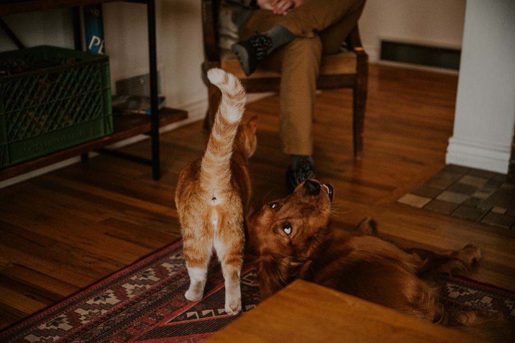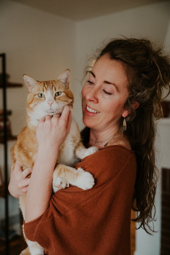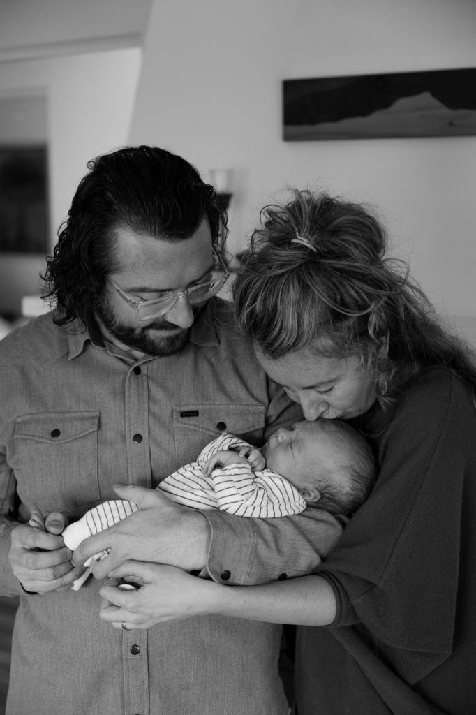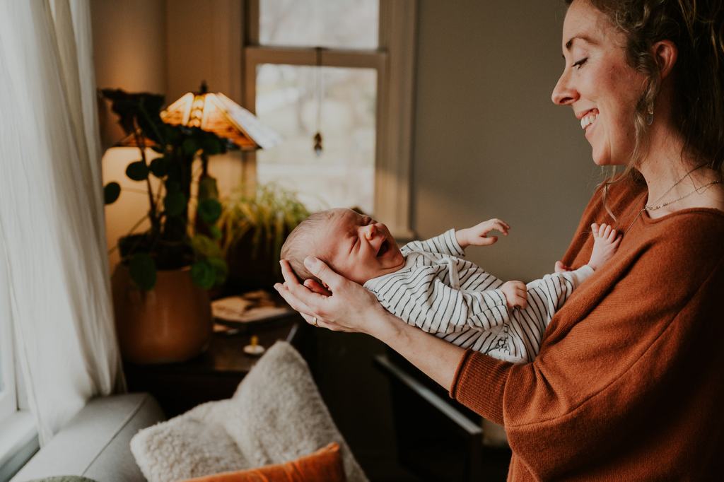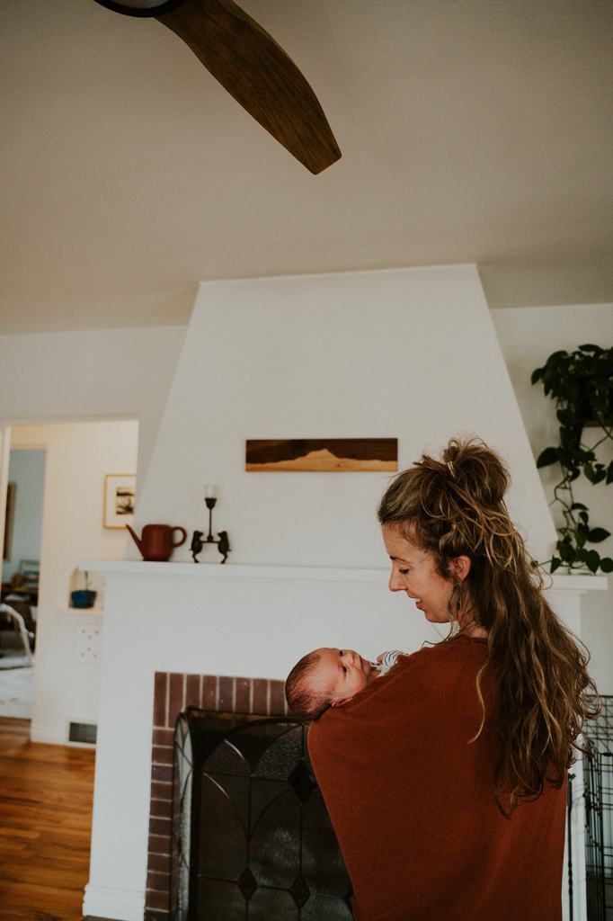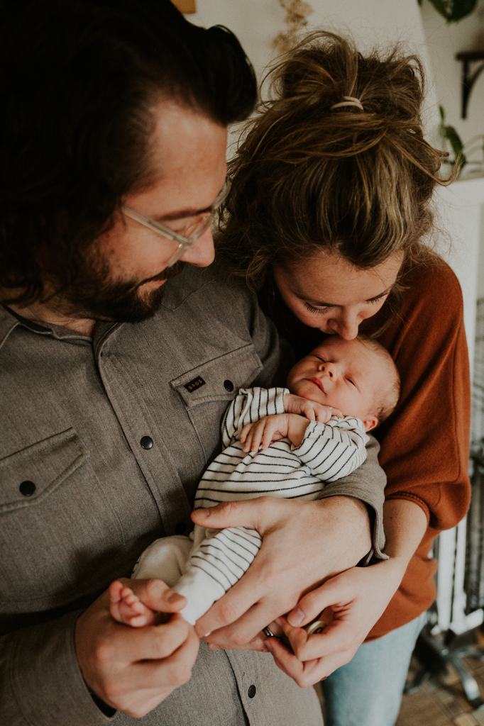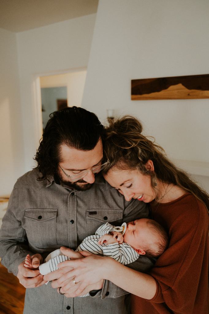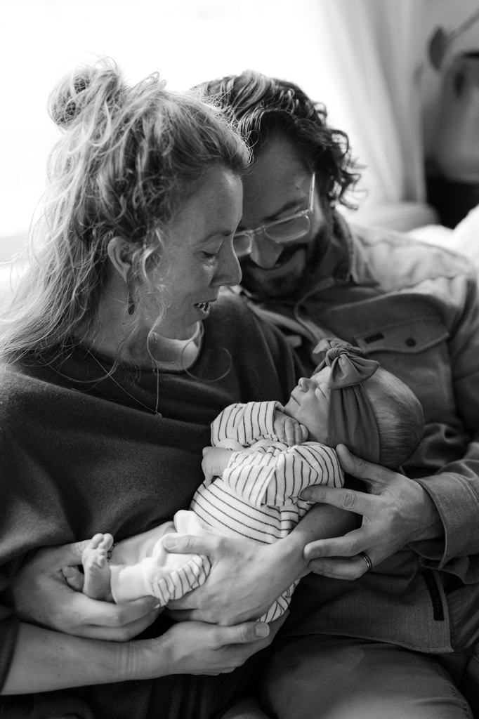 On a lovely Saturday morning, I arrived. Kyla and Roby’s home felt so peaceful and tranquil when I showed up. Kyla played soft folk music through the speakers. She had just finished nursing baby Isla Grace. I always say during lifestyle newborn photos that the baby is the boss. No matter how long it takes, I’ll stay until we get everything we need. I like it to feel as much like I’m a fly on the wall as possible. A couple times, Kyla had to pause to nurse Isla or change her. I simply documented a morning of the three of them doing what they might be doing if I wasn’t there! They cuddled on the couch. Cedar even leapt onto the couch to join them and hopped in a few photos! There were a few moments Kyla started to tear up as she stared lovingly at her baby.