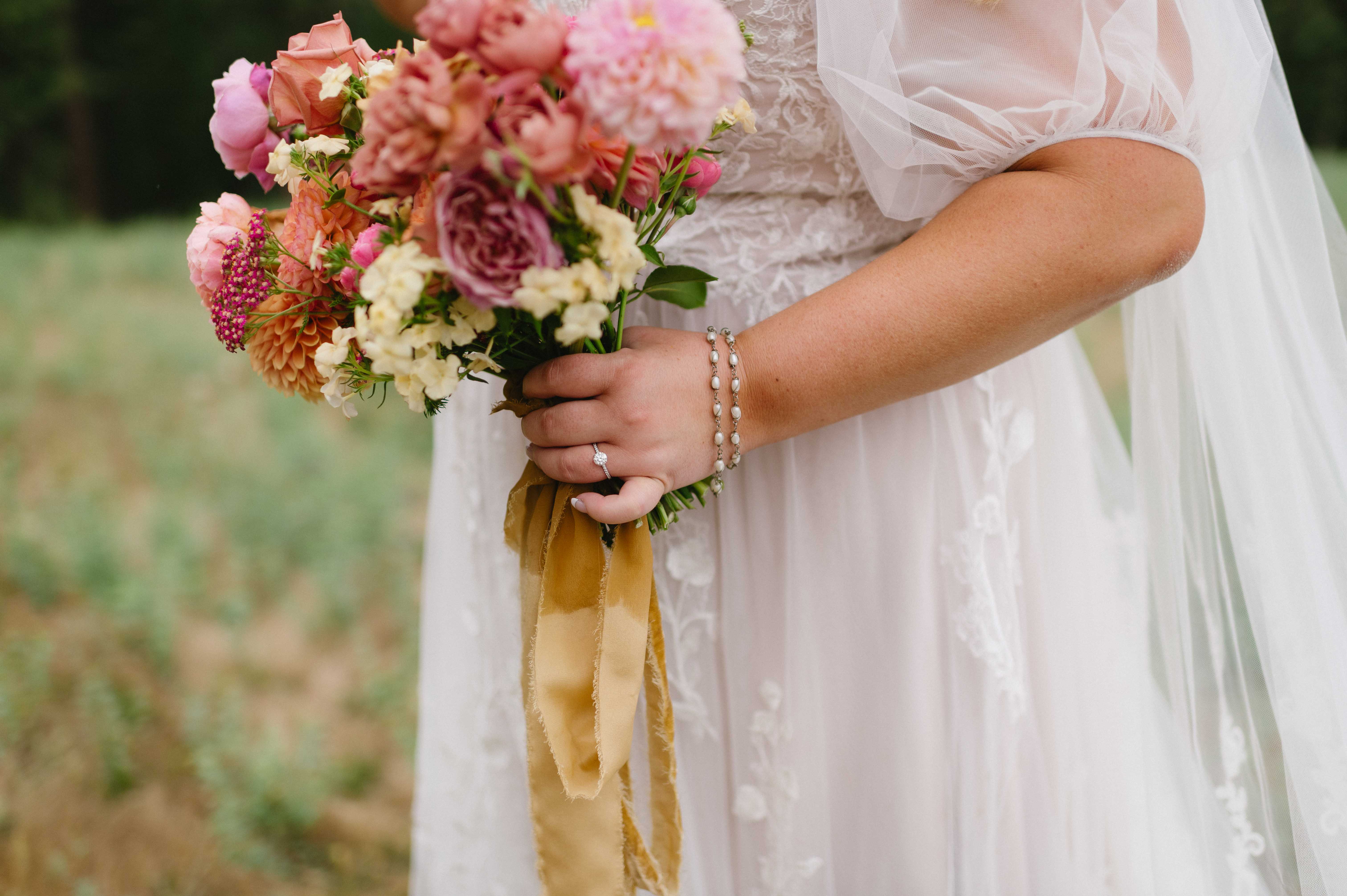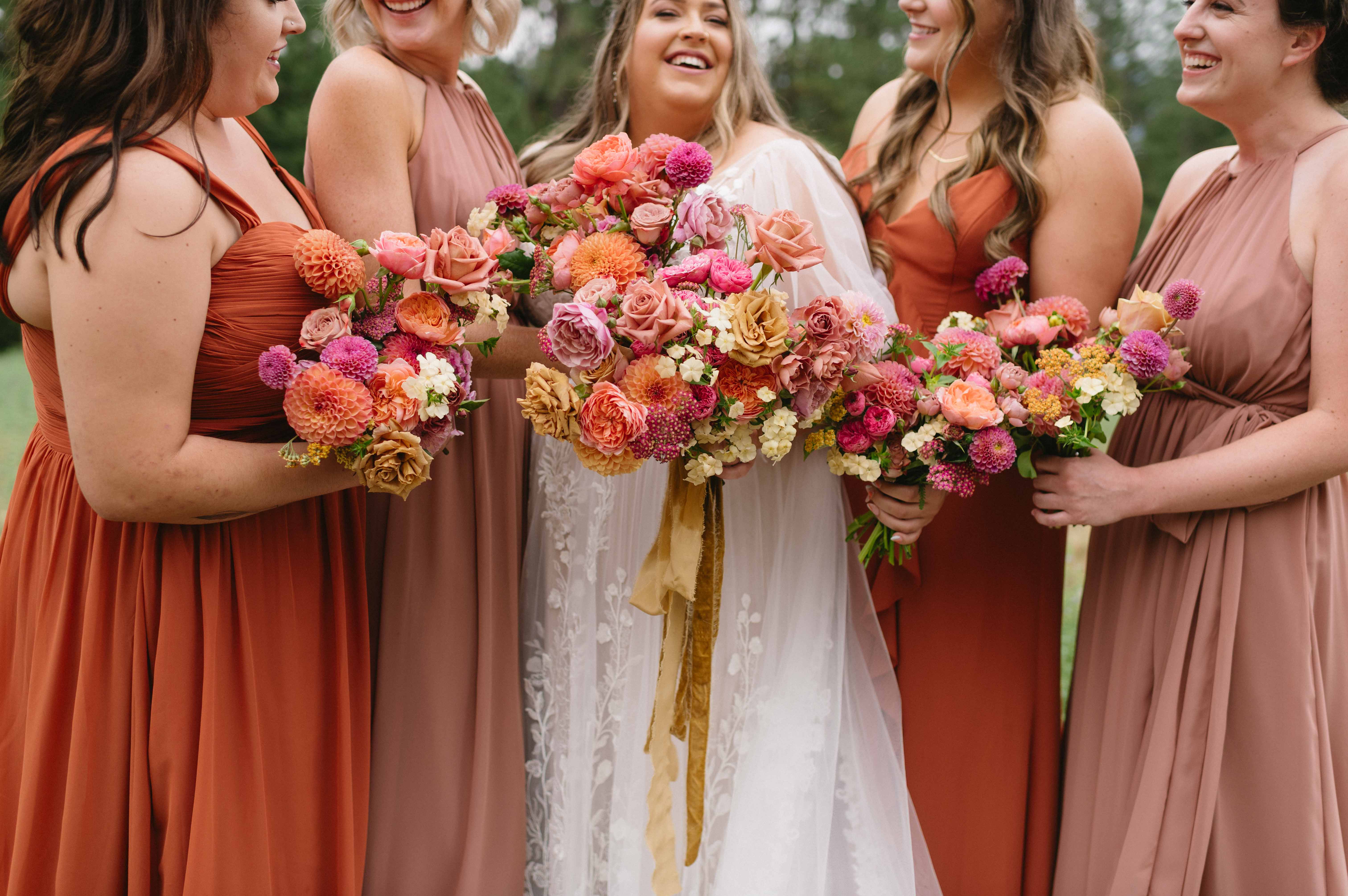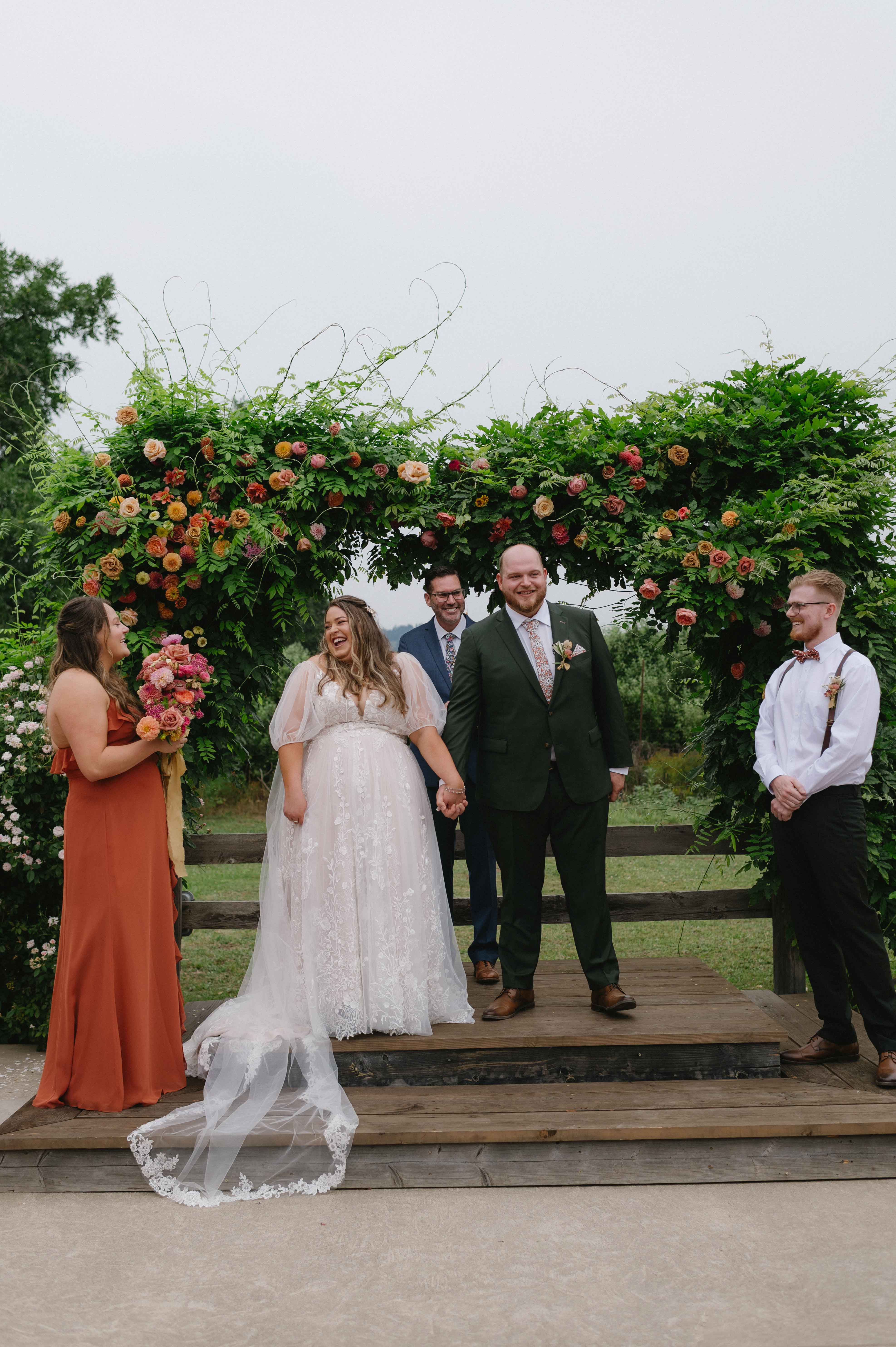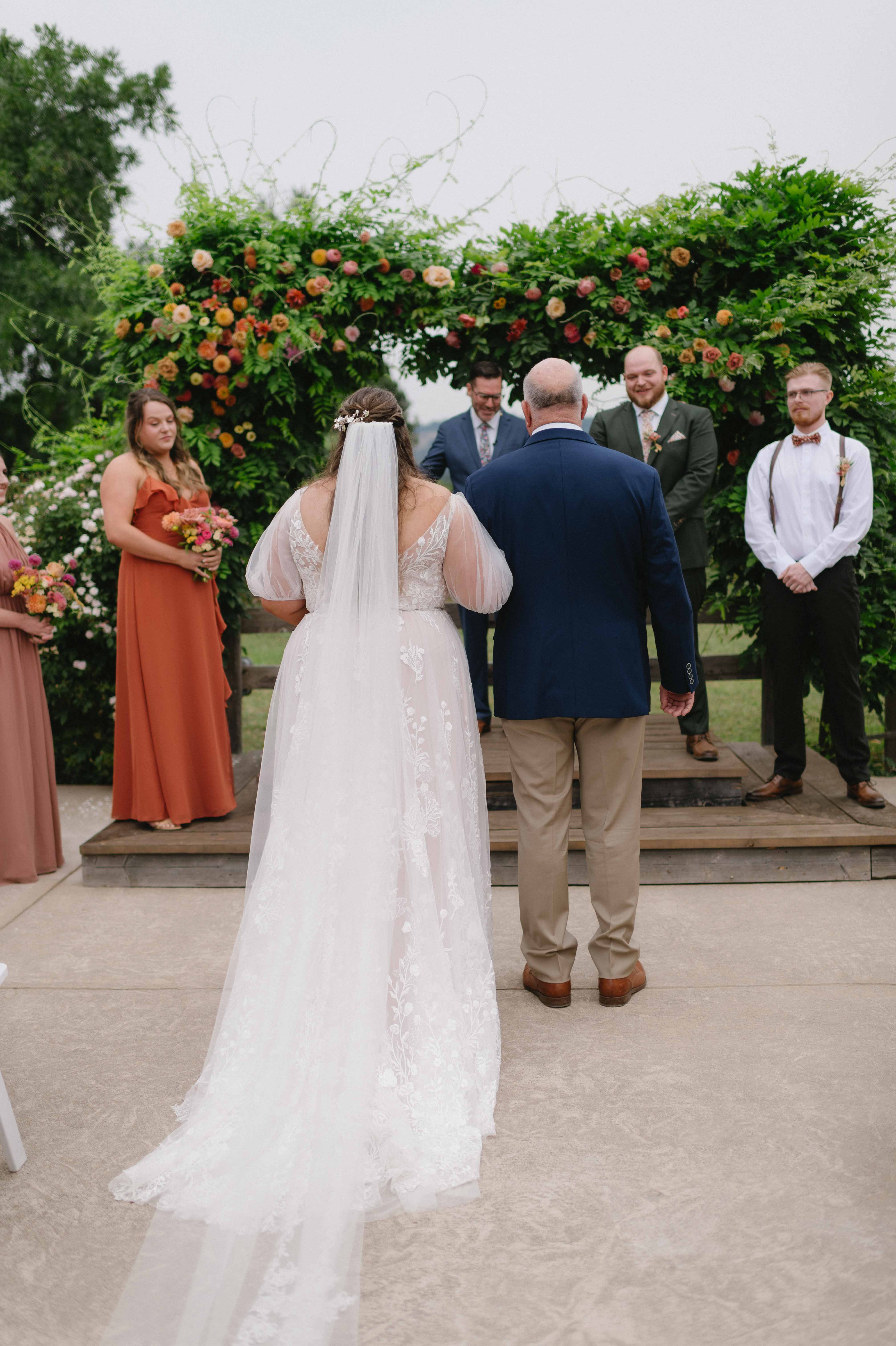 From the moment guests arrived, the vibe was unmistakable: bright pops of pink and orange everywhere. From mismatched maroon & pink bridesmaids’ dresses and hand-painted signage and paper lanterns swaying in the summer breeze, every detail was personal to them. Kelle’s stunning bouquet of wildly eclectic blooms complimented the floral adorned wedding arch full of loud blooms. The decor completely reflected them. It was fearless, fun, and full of personality. Completing their “vibe” with thrifted furniture, quirky butter yellow tabletop centerpieces, and a record player guest book made their wedding perfect.