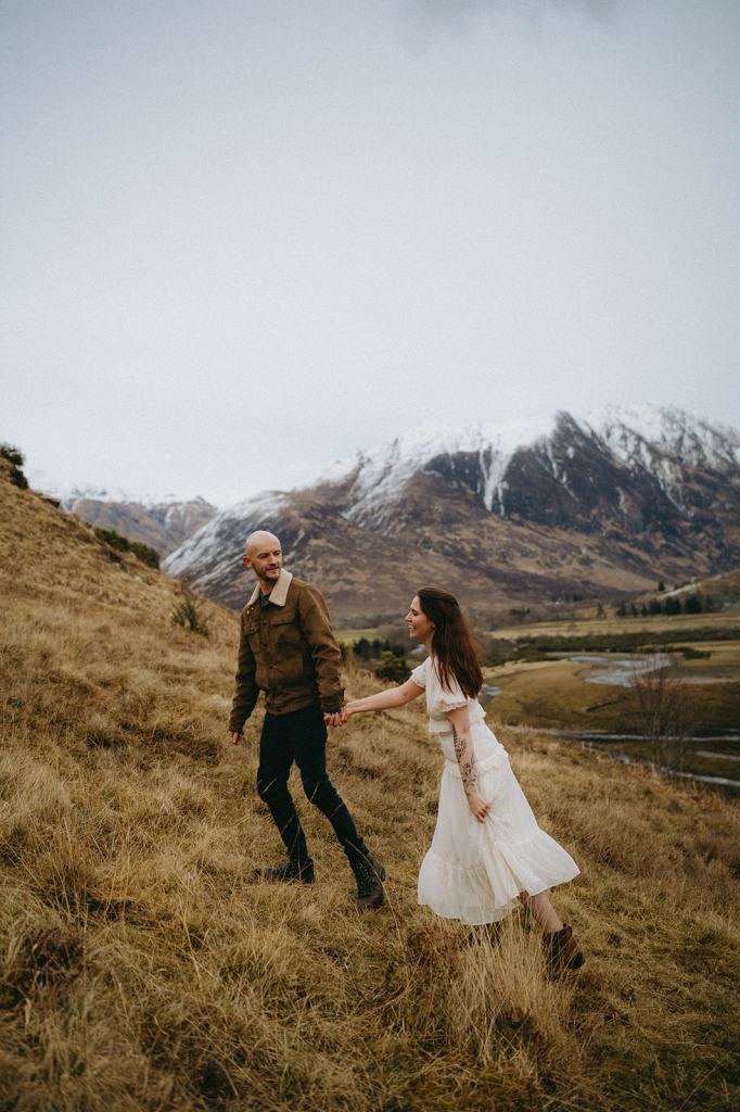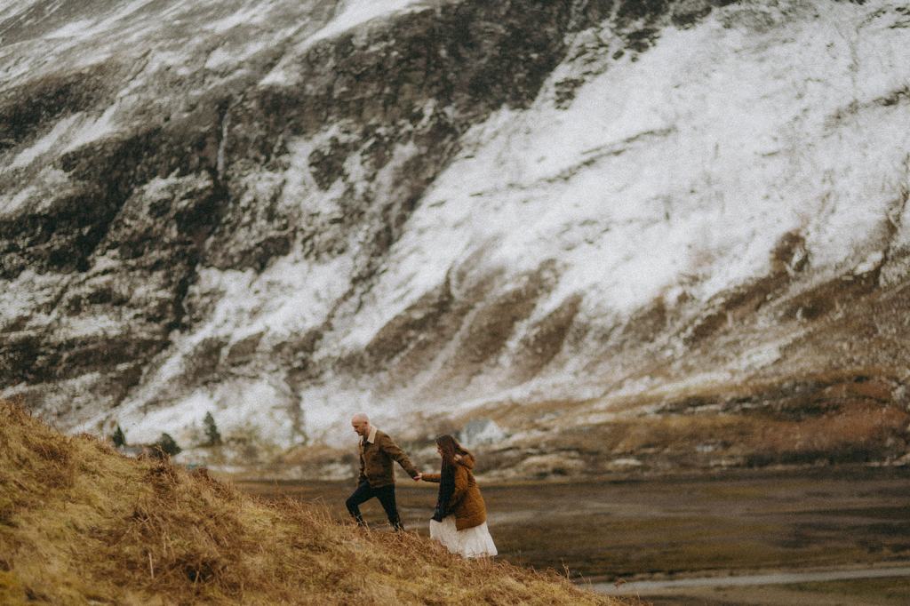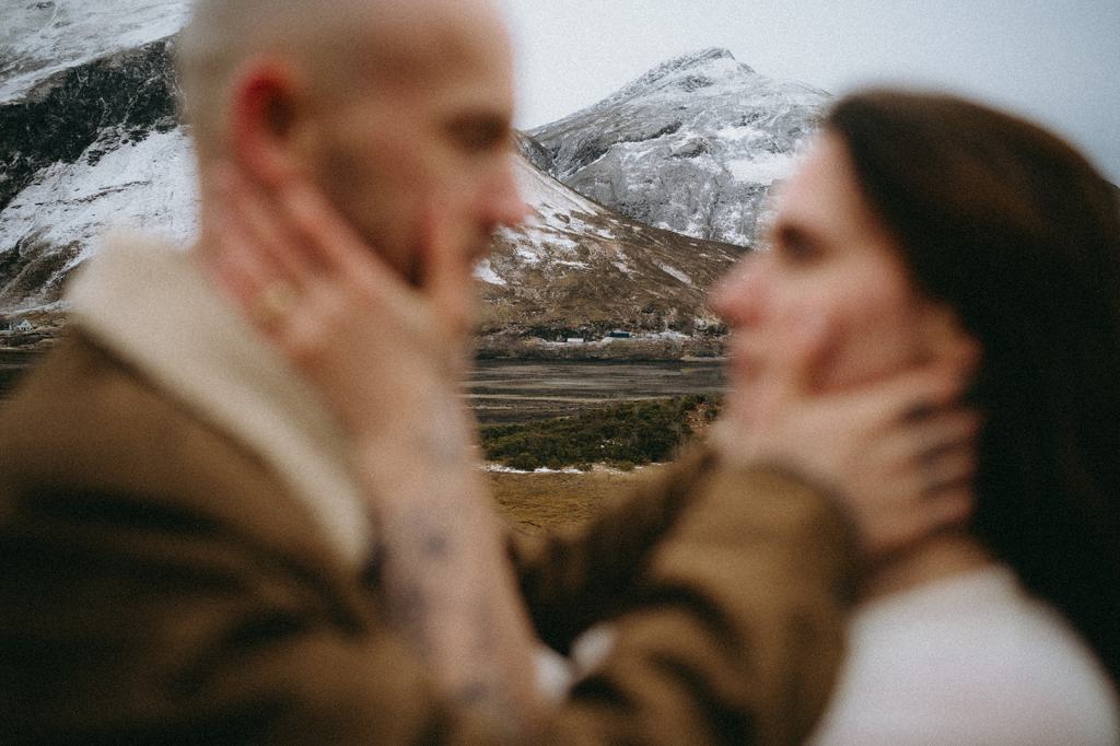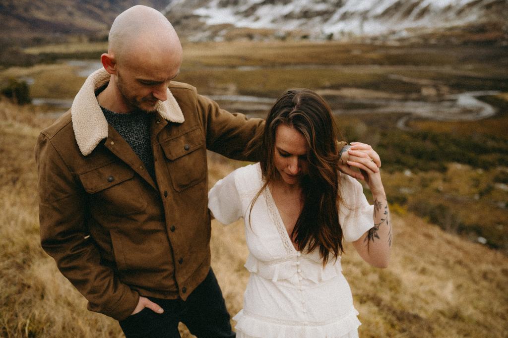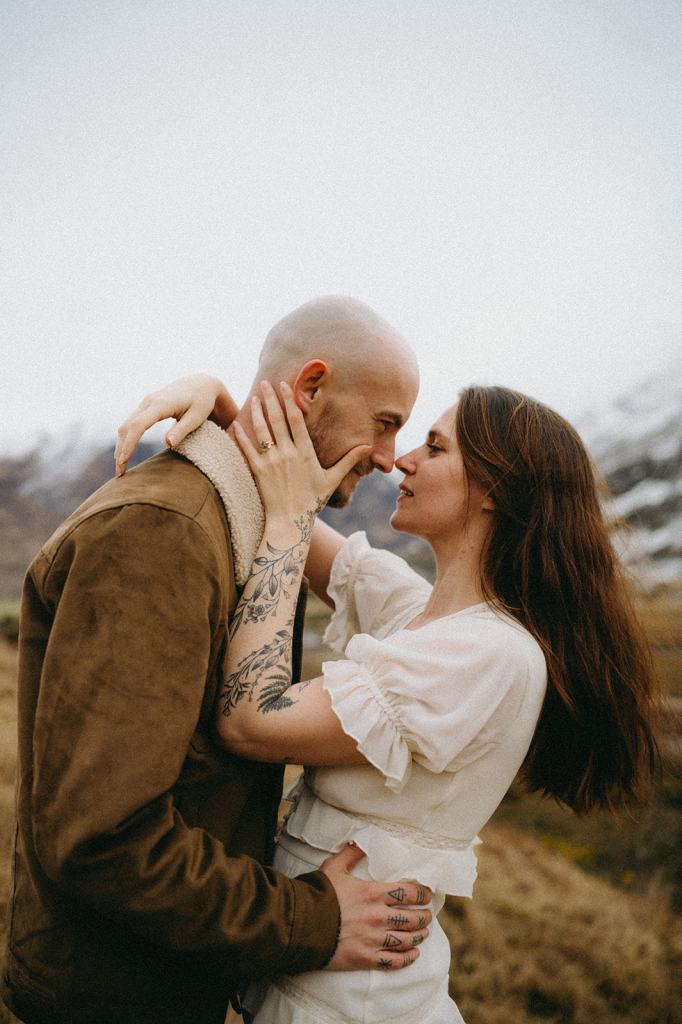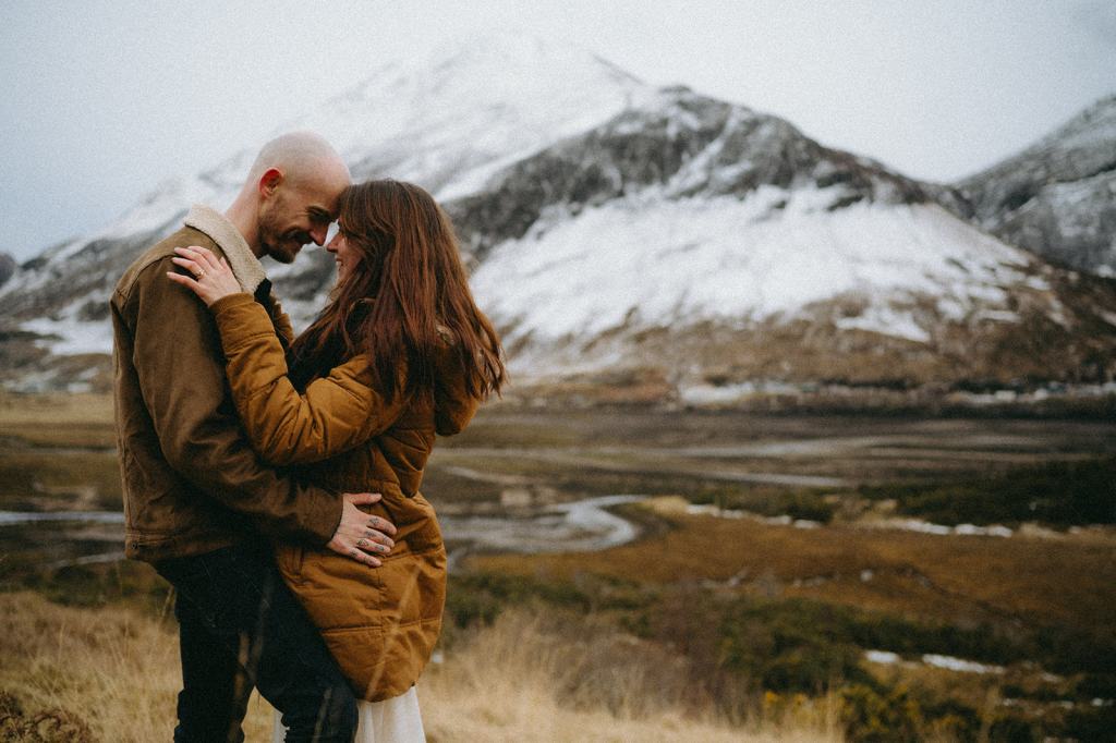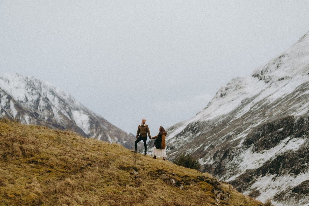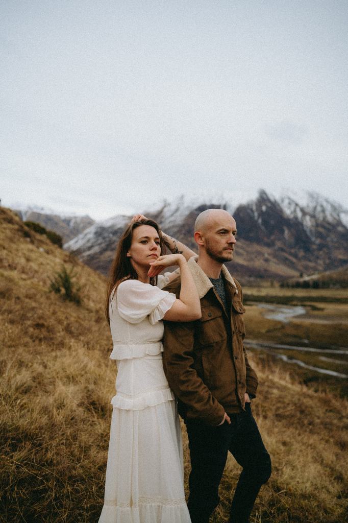 The Casson’s allowed me the honor of capturing their Glencoe Scotland Couples Photoshoot to celebrate their wedding anniversary. This stunning Scottish couple lives in Glasgow, Scotland. When my trip to Scotland coincided with their anniversary trip to the Scottish Highlands, it felt like kismet! Although we had never met before in person, they immediately won me over with their generosity and kindness. We met for the first time on the side of the road and it felt like we’d always been friends. I had a blast dreaming of how they wanted their photos to feel. Inspired by cinematic imagery, documentary photography, and film, I hoped these photos felt like stills of a movie. Shooting in Glencoe felt like floating on a cloud. Just location scouting in the area filled me with joy.