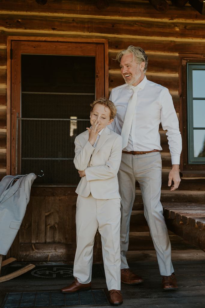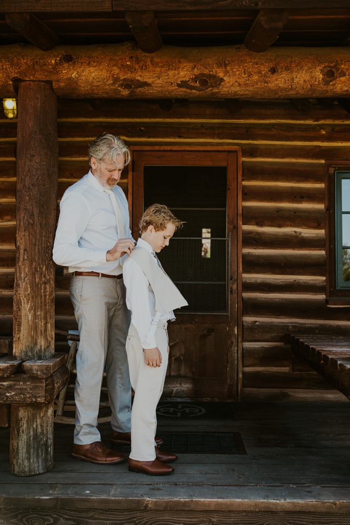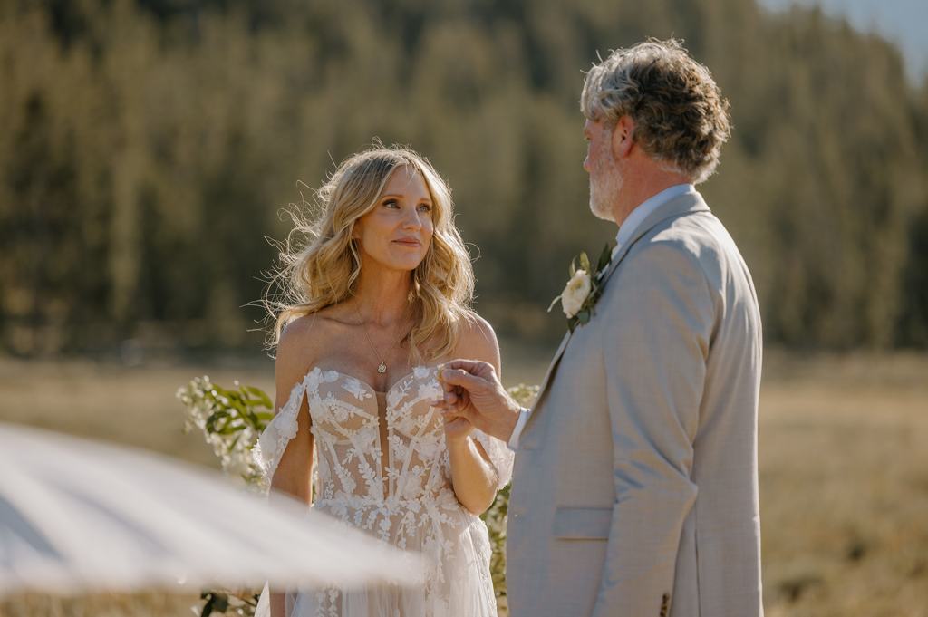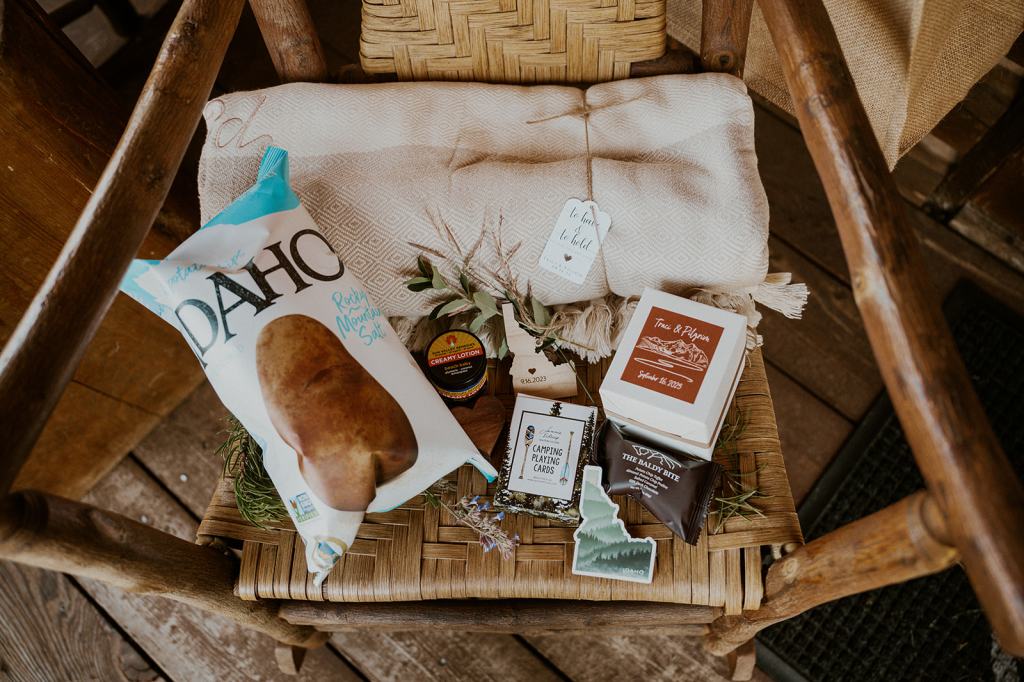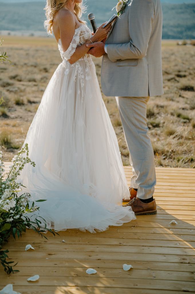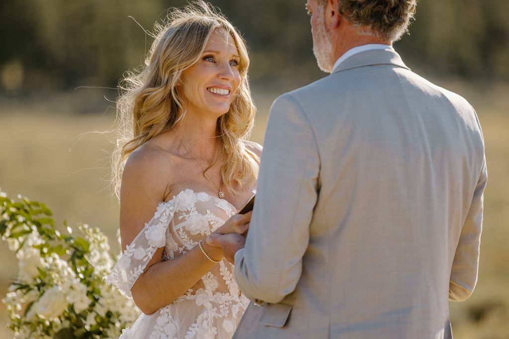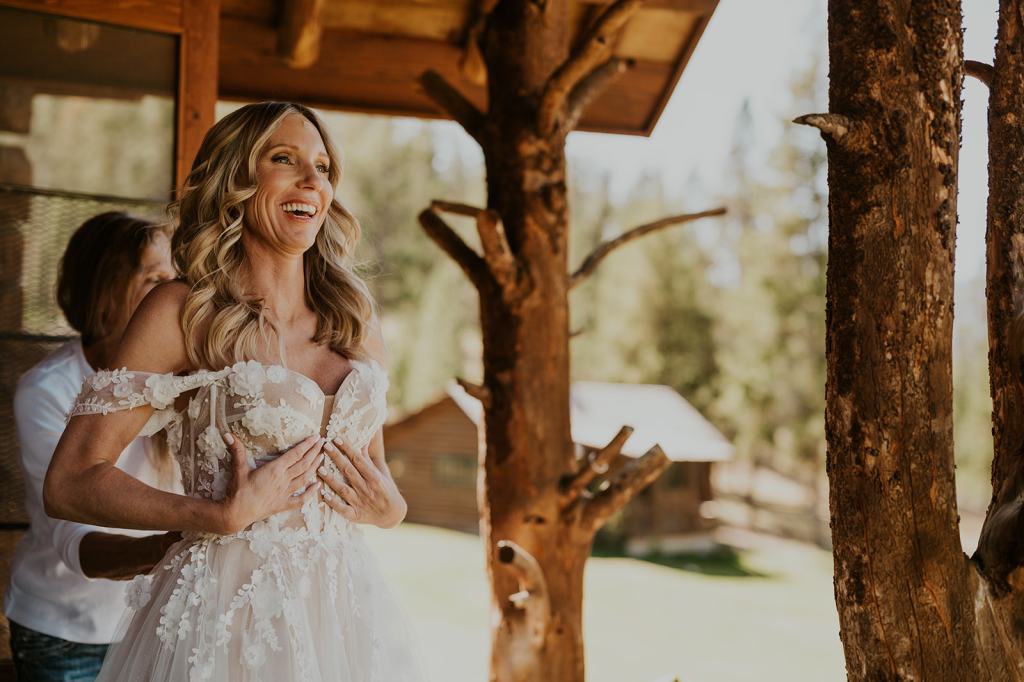 Traci and Pilgrim’s September wedding day started slowly on a perfect morning. Imagine this: your father in law is eating breakfast on the front porch with his dog sitting next to him. You are finishing your vows under the awning of your private cozy honeymoon cabin overlooking the Sawtooths. The air is crisp and feels like the start of fall. The aspen trees are starting to change colors. It’s your wedding day and everything is still except for the mountain breeze. Sounds perfect right?