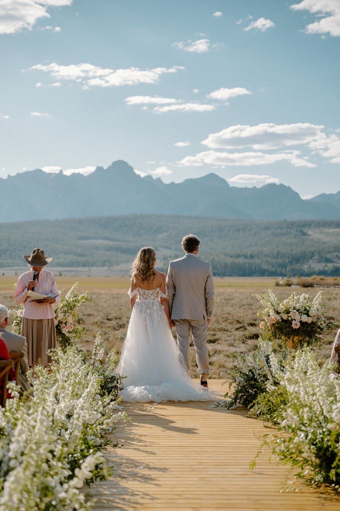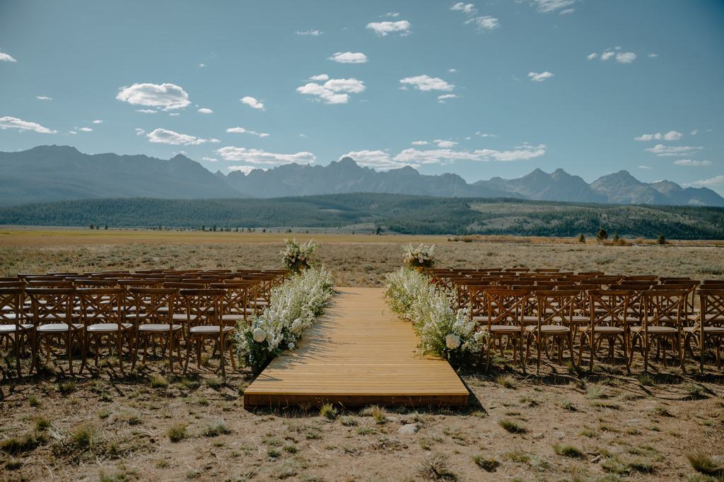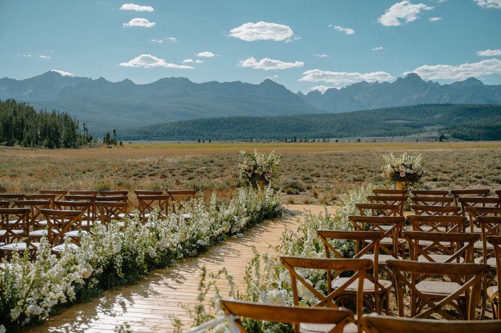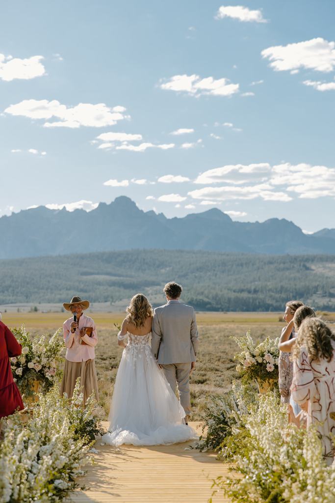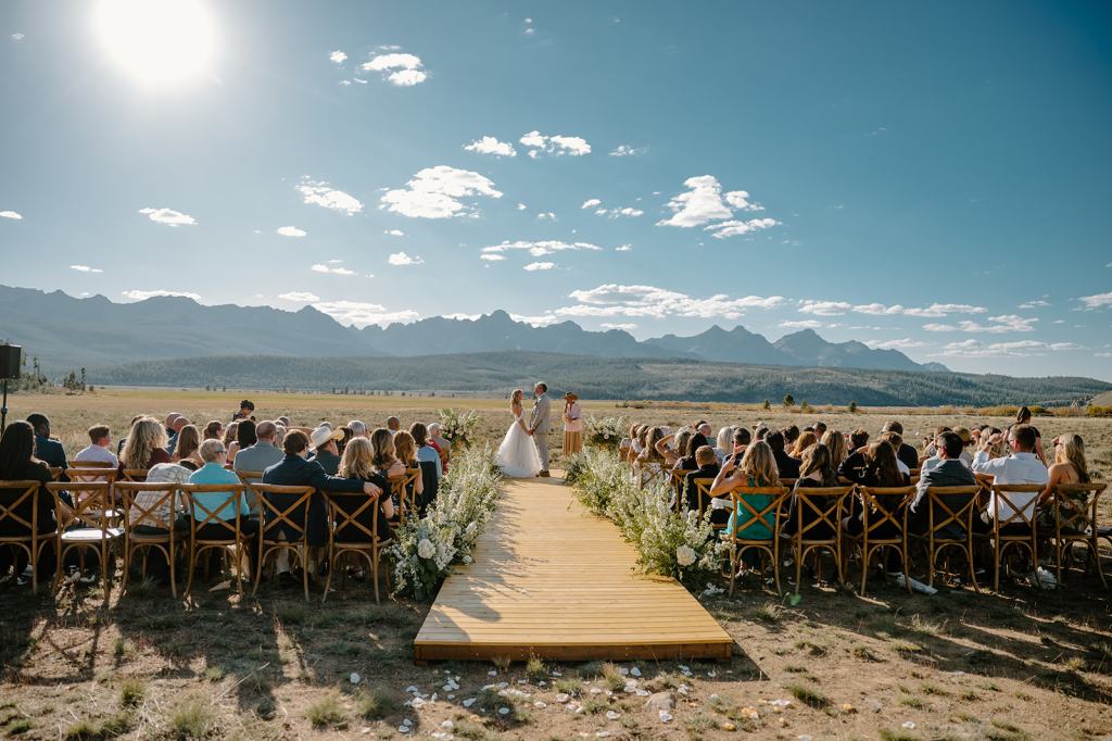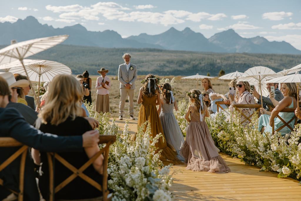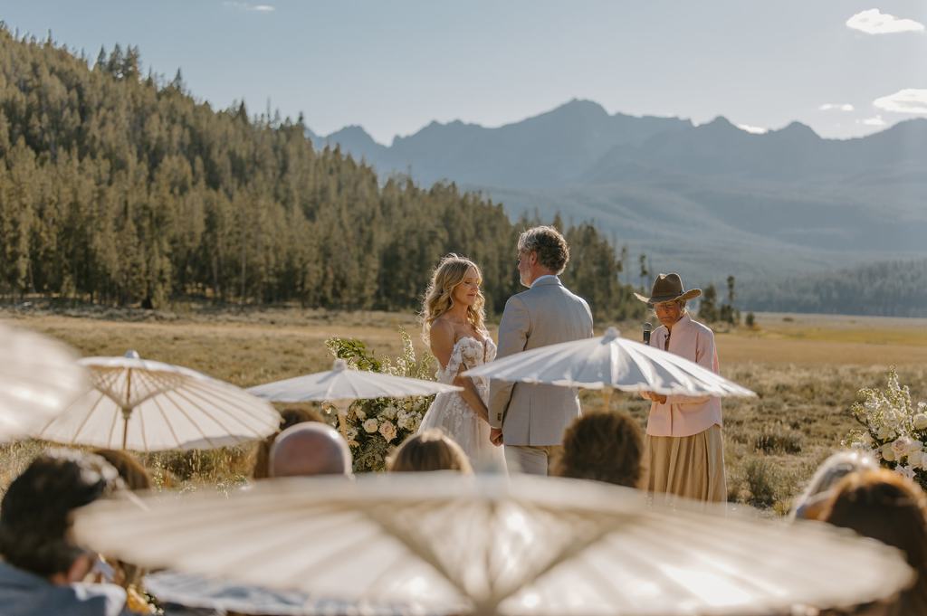 In my career, I don’t think I’ve ever seen a more stunning ceremony. Located at a secret location on the Idaho Rocky Mountain Ranch, we were transported to a magical oasis in the Sawtooths for Traci and Pilgrim’s wedding ceremony. Every guest was shuttled in blue buses to the magical location. When guests arrived, they were greeted with champagne and a white parasol.