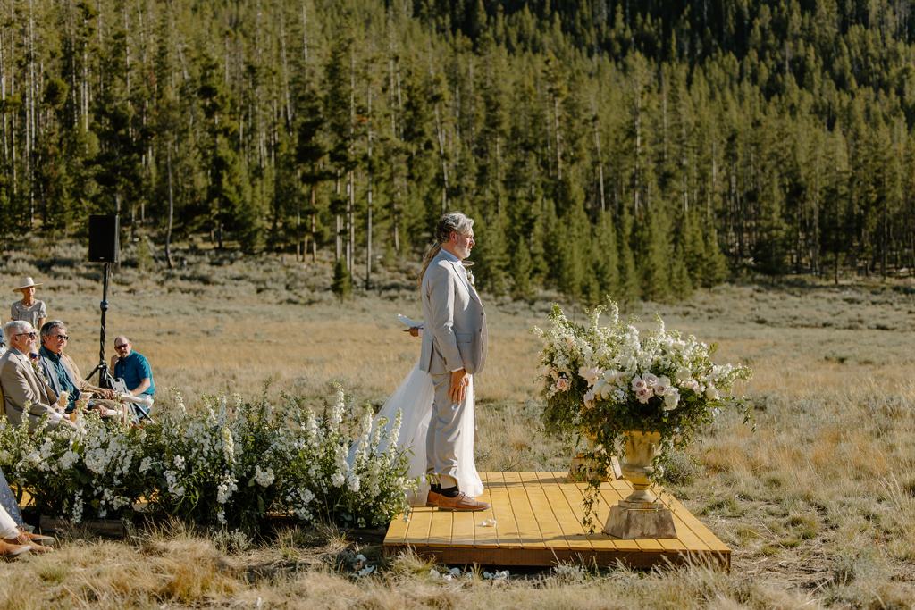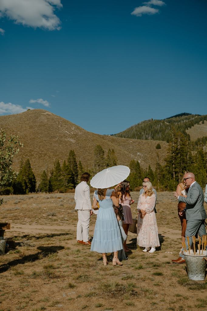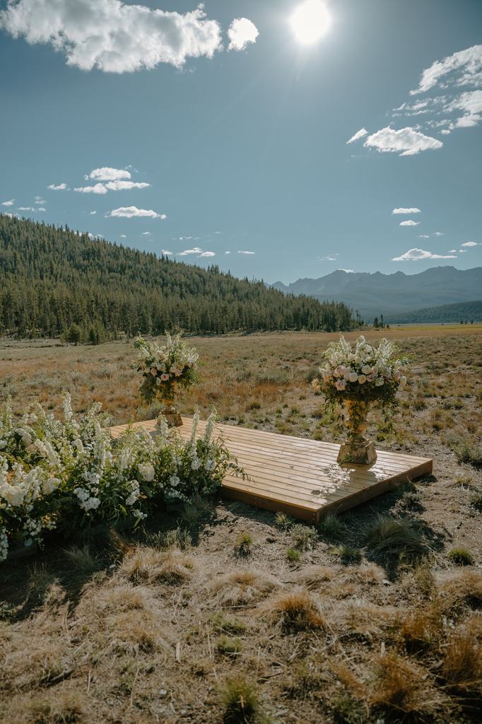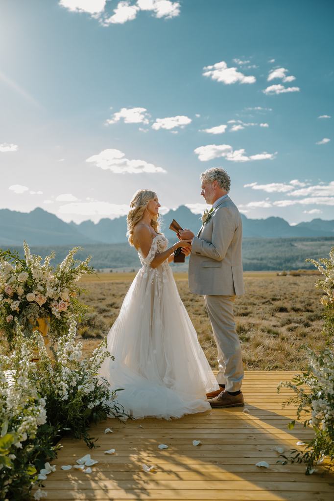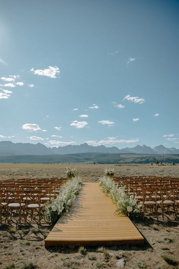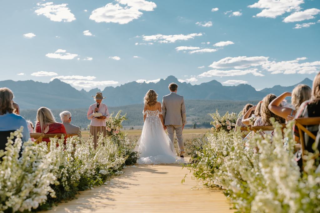 In my career, I don’t think I’ve ever seen a more stunning ceremony. Located at a secret location on the Idaho Rocky Mountain Ranch, we were transported to a magical oasis in the Sawtooths for Traci and Pilgrim’s wedding ceremony. Every guest was shuttled in blue buses to the magical location. When guests arrived, they were greeted with champagne and a white parasol.