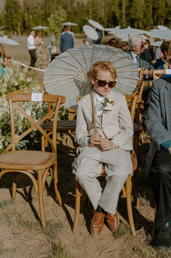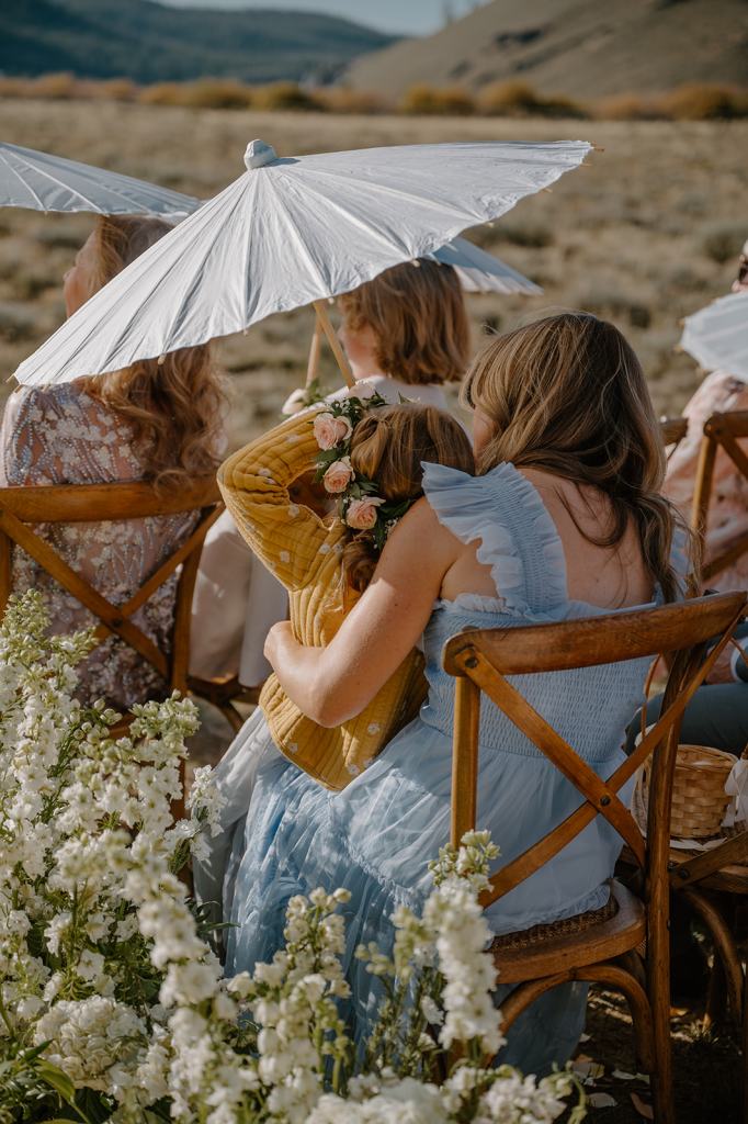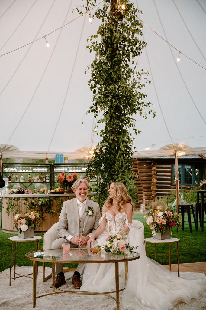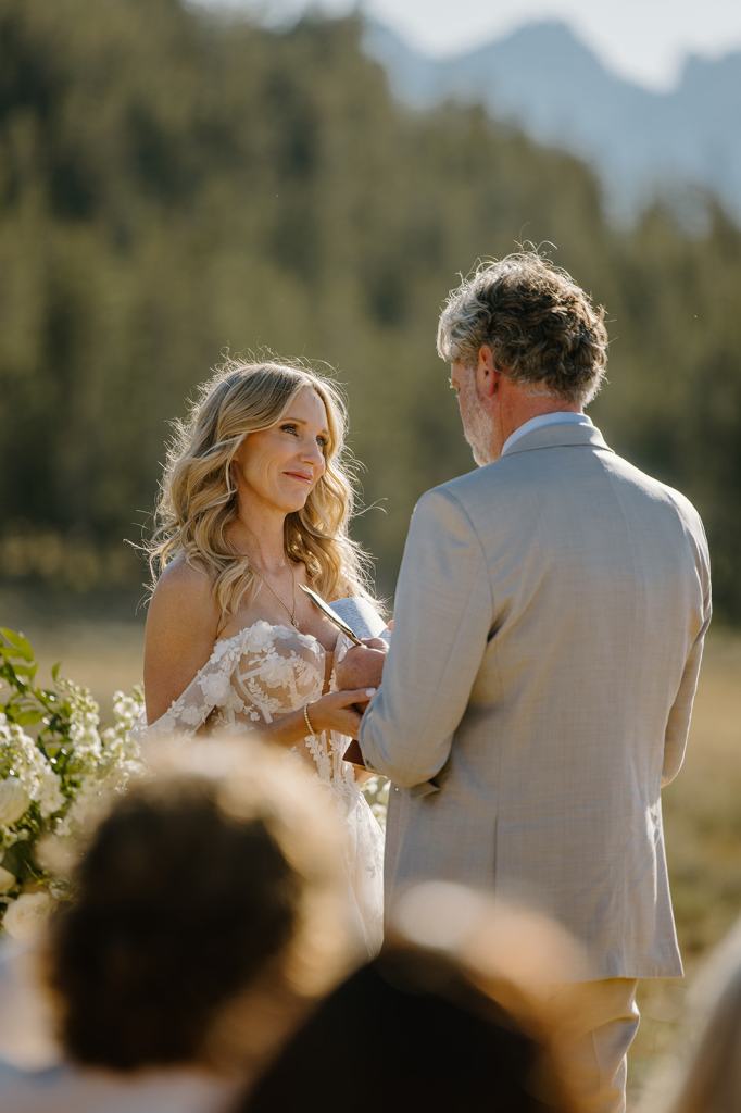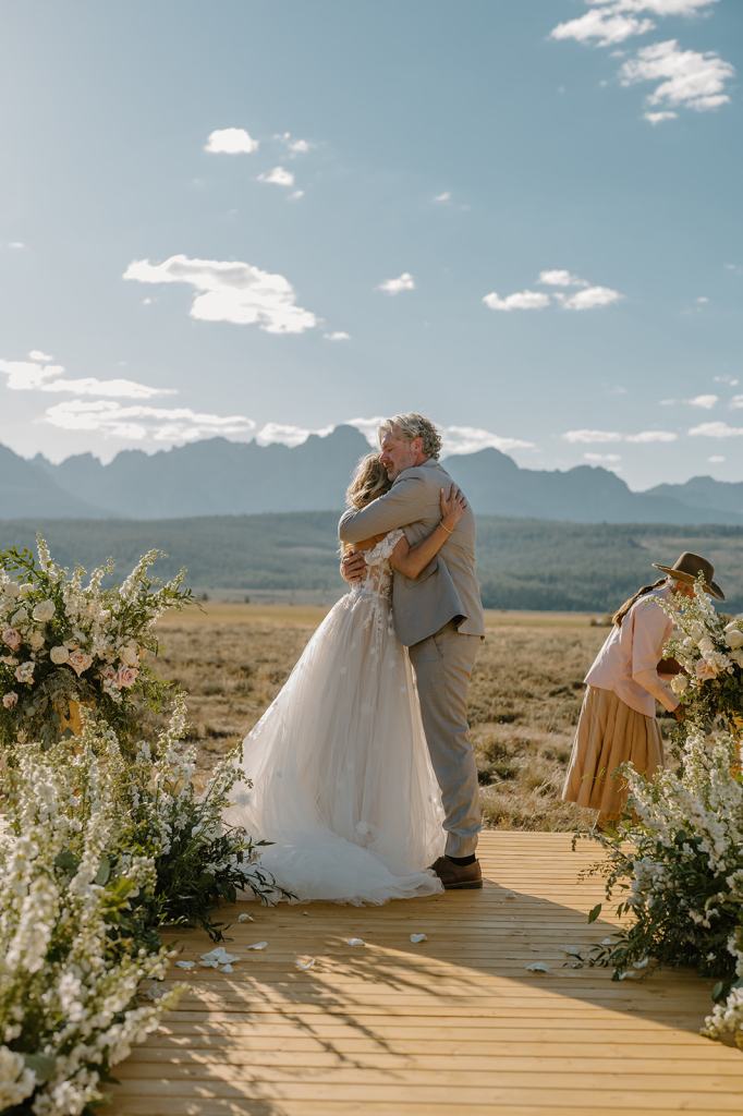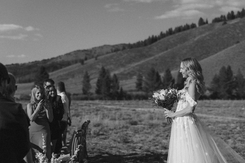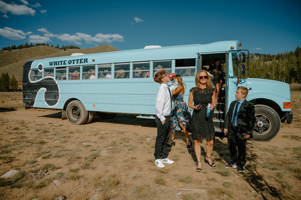 In my career, I don’t think I’ve ever seen a more stunning ceremony. Located at a secret location on the Idaho Rocky Mountain Ranch, we were transported to a magical oasis in the Sawtooths for Traci and Pilgrim’s wedding ceremony. Every guest was shuttled in blue buses to the magical location. When guests arrived, they were greeted with champagne and a white parasol.