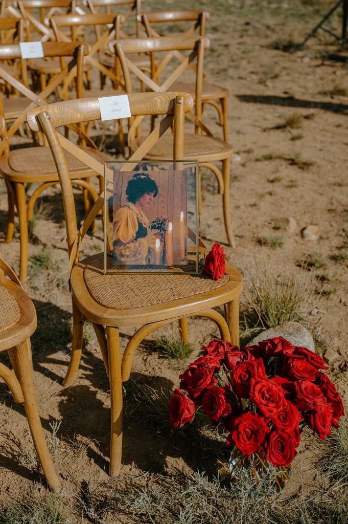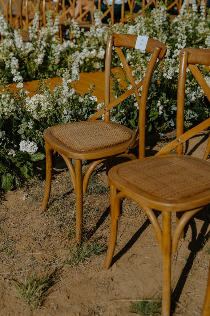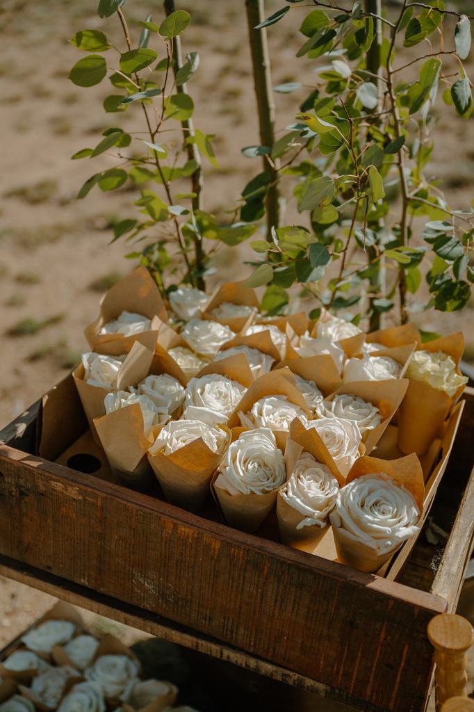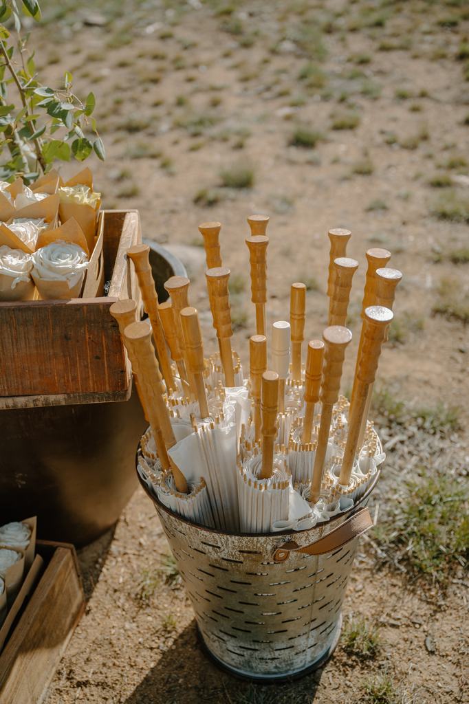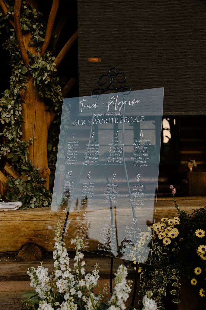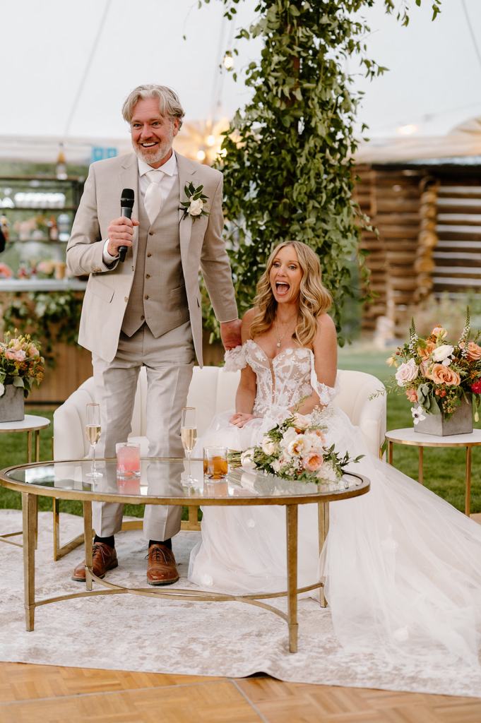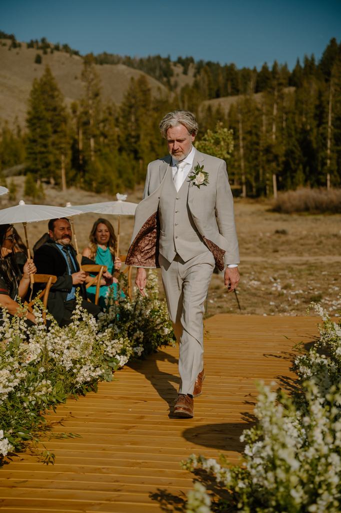 In my career, I don’t think I’ve ever seen a more stunning ceremony. Located at a secret location on the Idaho Rocky Mountain Ranch, we were transported to a magical oasis in the Sawtooths for Traci and Pilgrim’s wedding ceremony. Every guest was shuttled in blue buses to the magical location. When guests arrived, they were greeted with champagne and a white parasol.