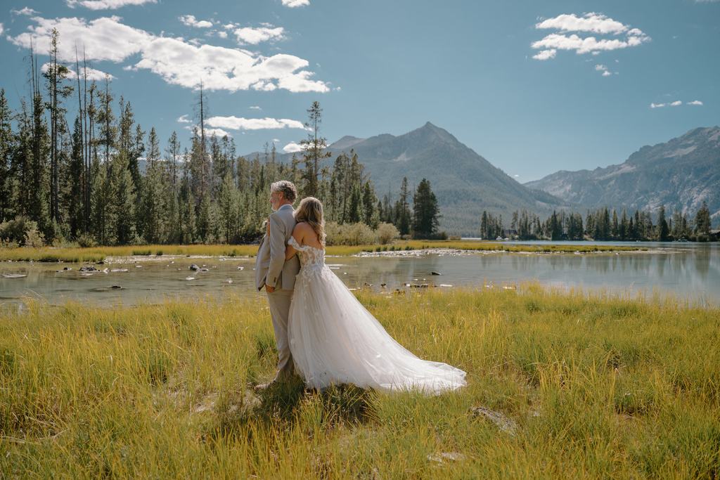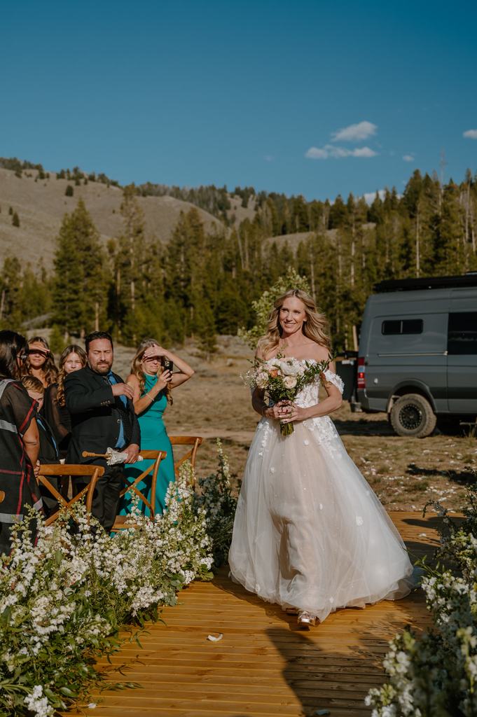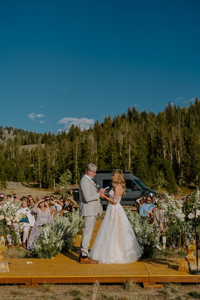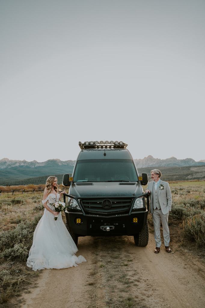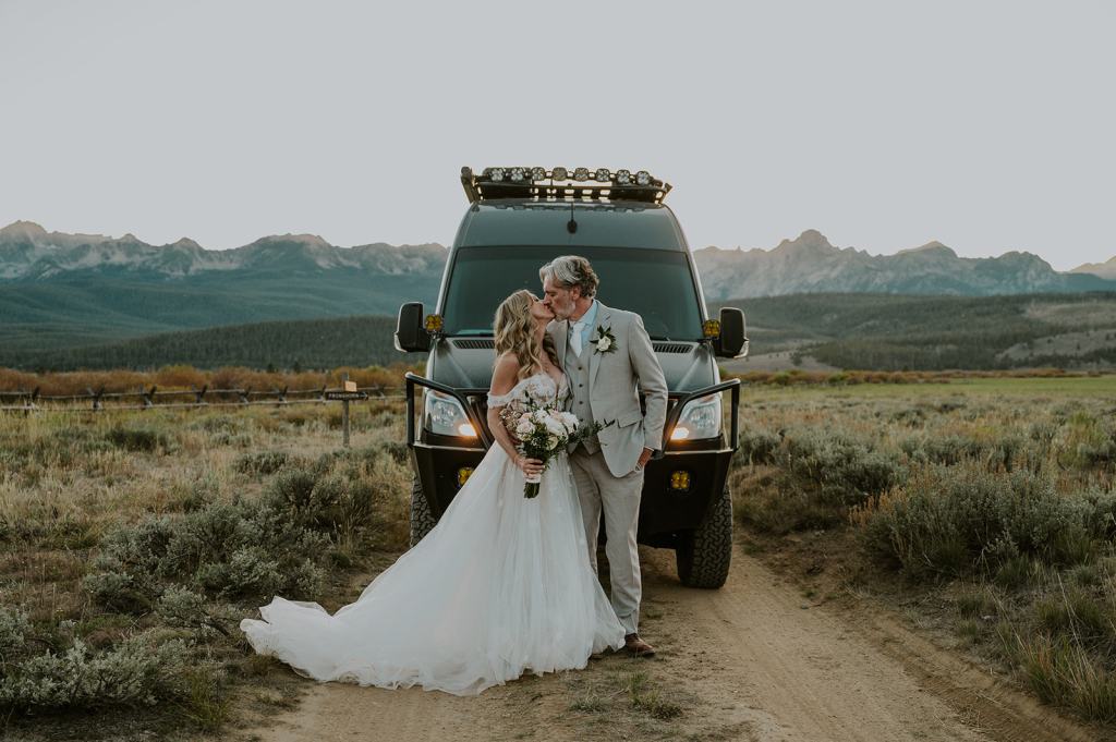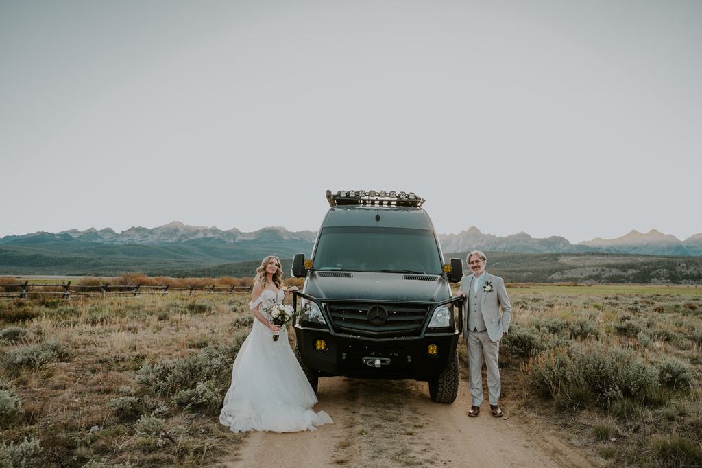 We planned a special first look at a stunning lake in the Sawtooths. Adventure is a huge part of Traci and Pilgrim’s love story. They asked me if we could incorporate their adventure van into their wedding day and I said of course. Pilgrim drove to the secret first look location in his van while I drove Traci. They saw each other for the first time on their wedding day on the lake shore of Redfish Lake. Once we finished their first look, Traci and Pilgrim got in their van together and drove away to their wedding ceremony.