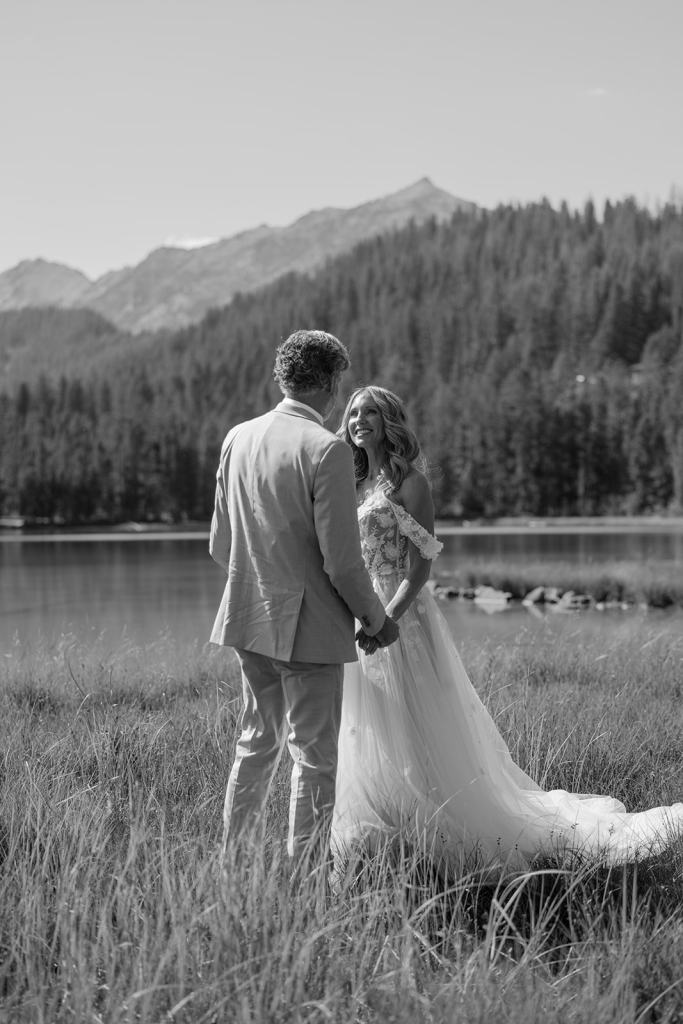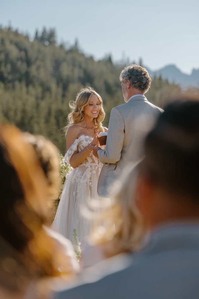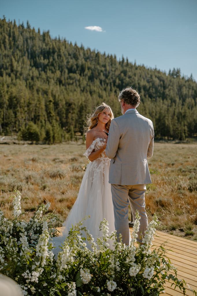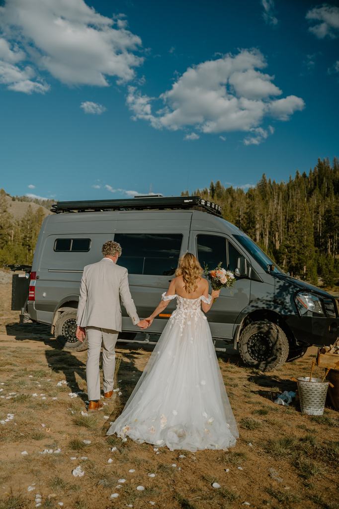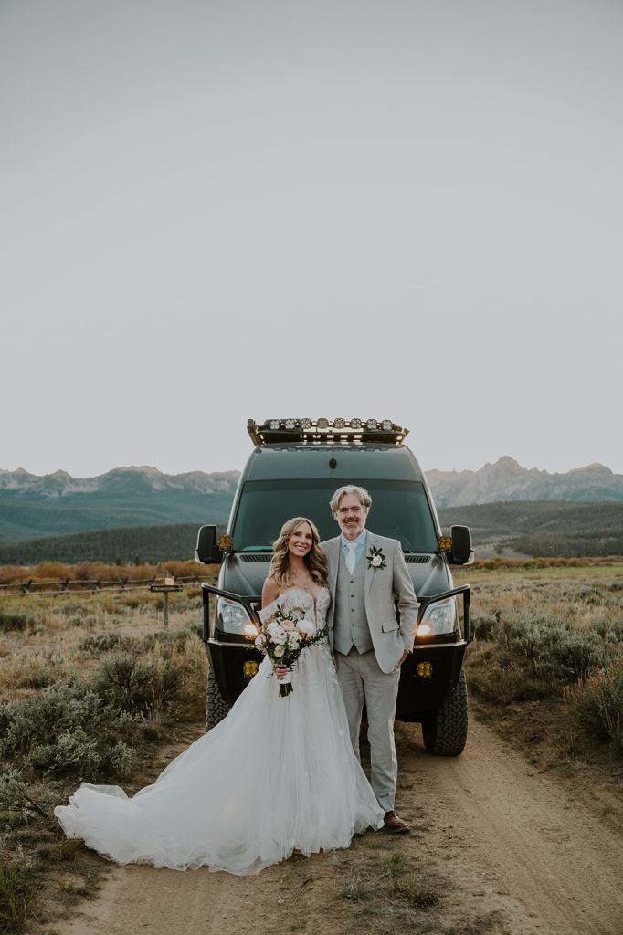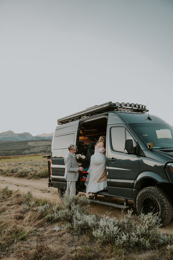 We planned a special first look at a stunning lake in the Sawtooths. Adventure is a huge part of Traci and Pilgrim’s love story. They asked me if we could incorporate their adventure van into their wedding day and I said of course. Pilgrim drove to the secret first look location in his van while I drove Traci. They saw each other for the first time on their wedding day on the lake shore of Redfish Lake. Once we finished their first look, Traci and Pilgrim got in their van together and drove away to their wedding ceremony.