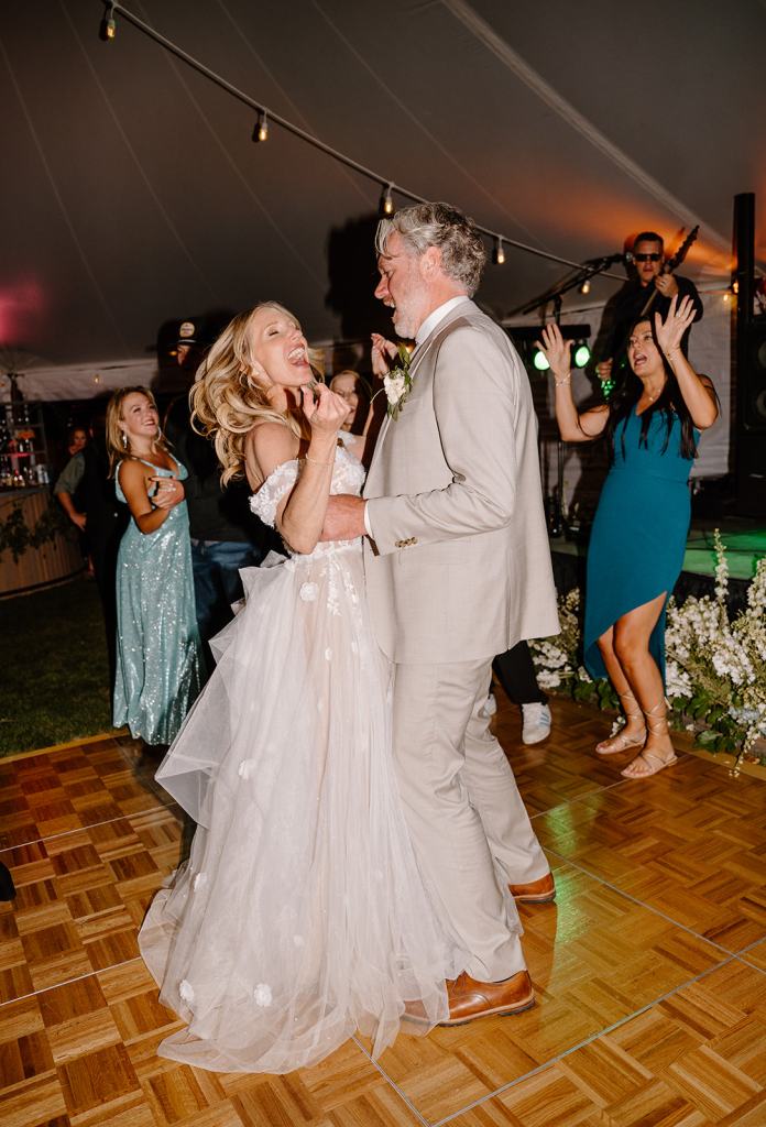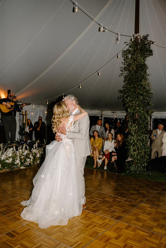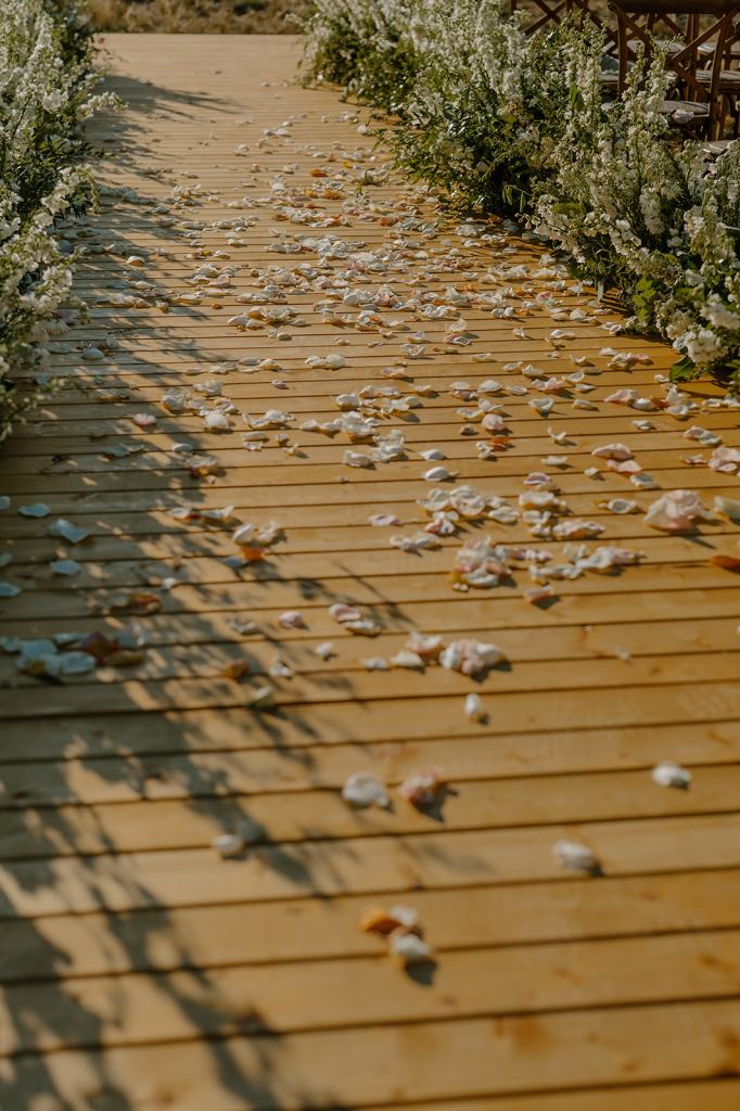 Working hard with Kelley from Blue Bottle Events, Traci and Pilgrim designed a dramatic wooden aisle flanked with overflowing white roses and flowers. Once all the guests were seated, Traci arrived at the wedding ceremony in their van. It was an incredible entrance.