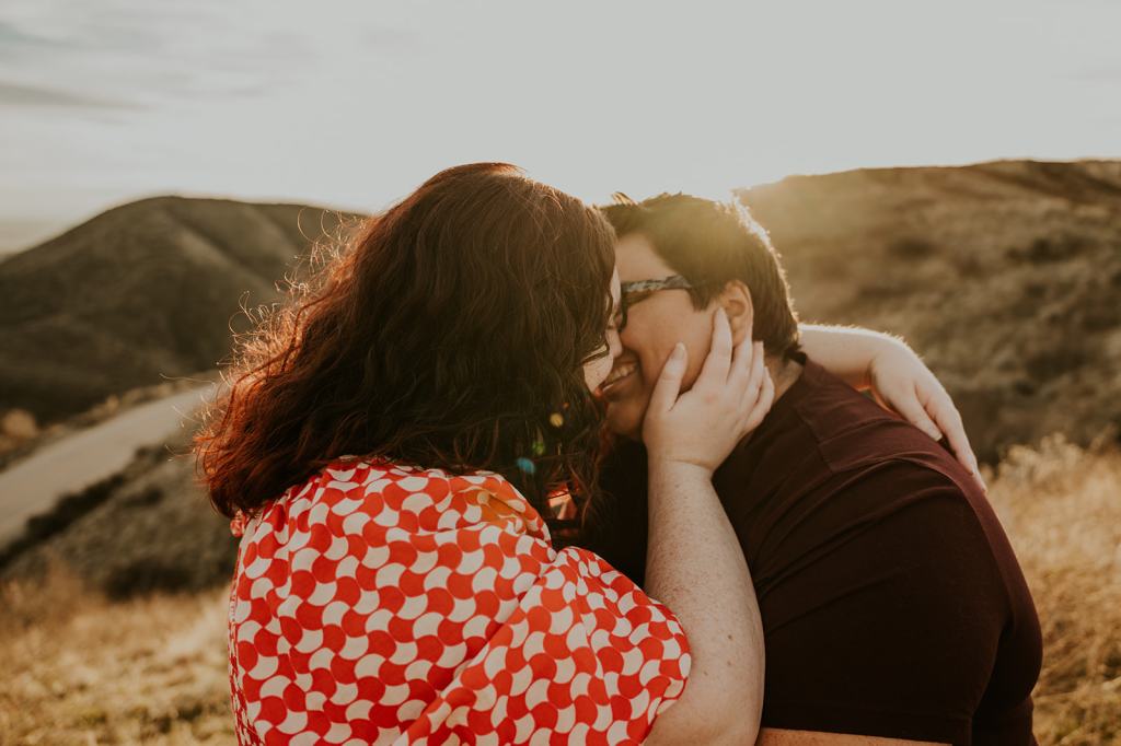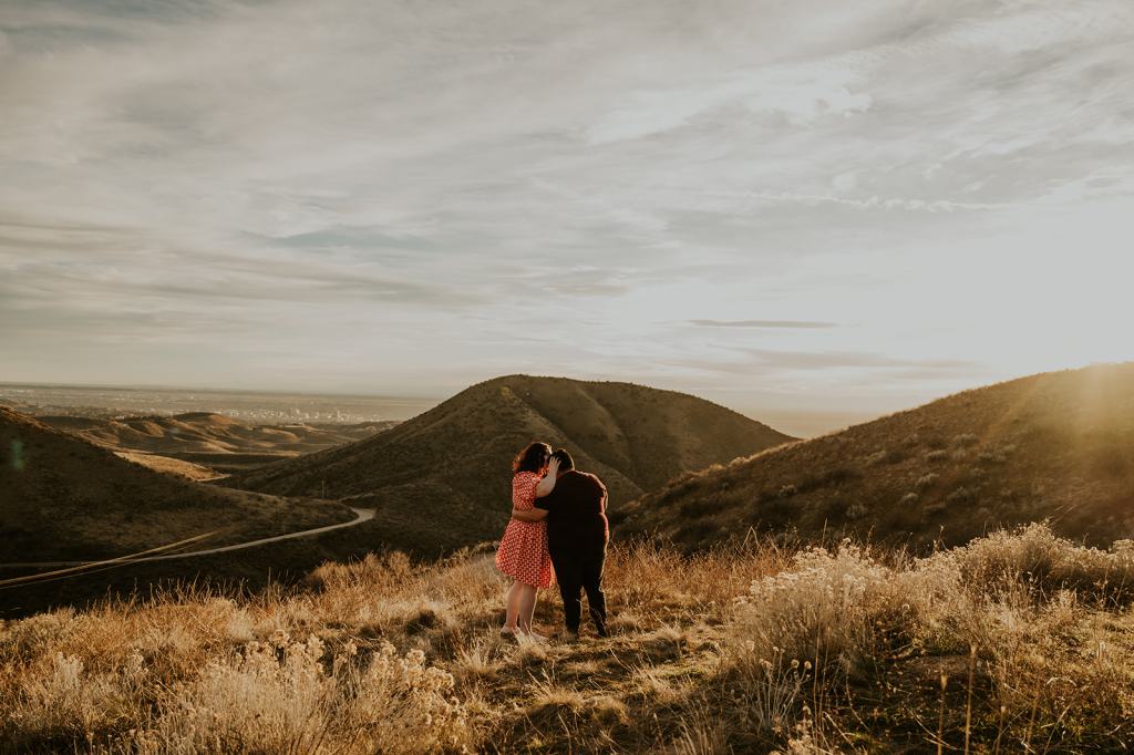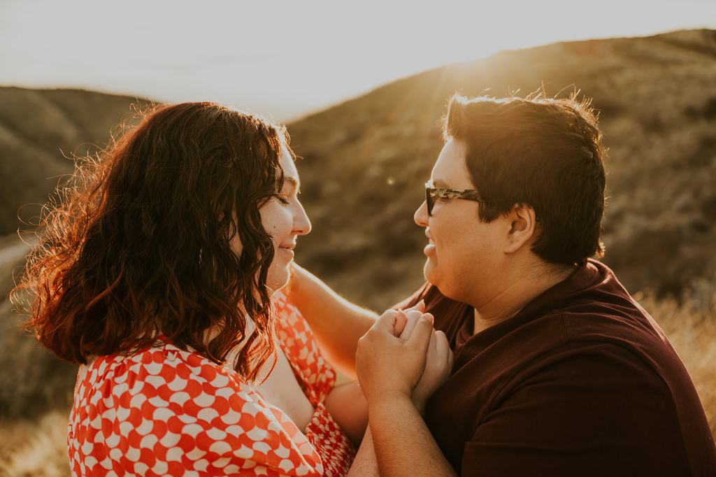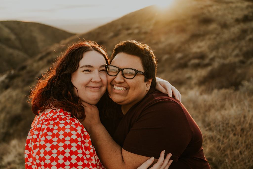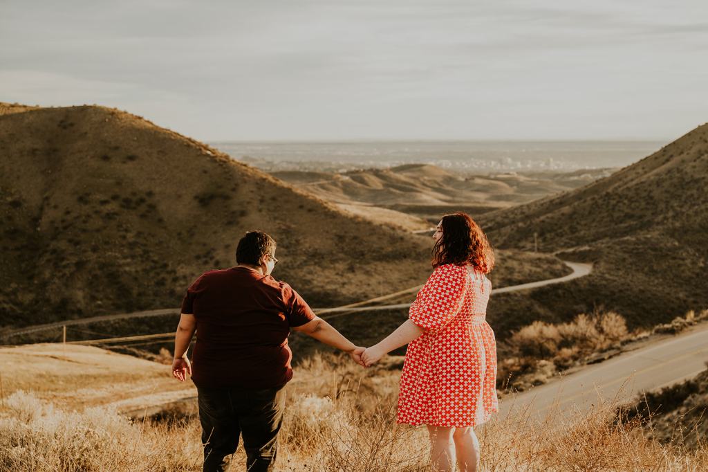 Hannah and Audree’s stunning LGBTQ Idaho Engagement Photos took place in the Boise Foothills on a beautiful spring day. You never know what you are going to get when you take photos outdoors in the springtime in Idaho, but luckily for us, we were treated with a beautiful golden hour. It almost felt like summer! Hannah and Audree are getting married in the spring of 2024. We planned their engagement photos in their hometown of Boise. I loved these two the moment we met. They carry such an infectious energy about them! These two are always smiling and have such a sweet, fun demeanor.