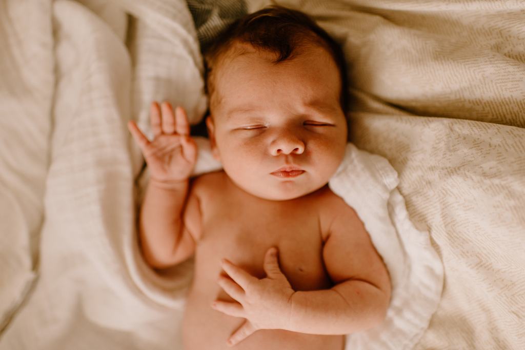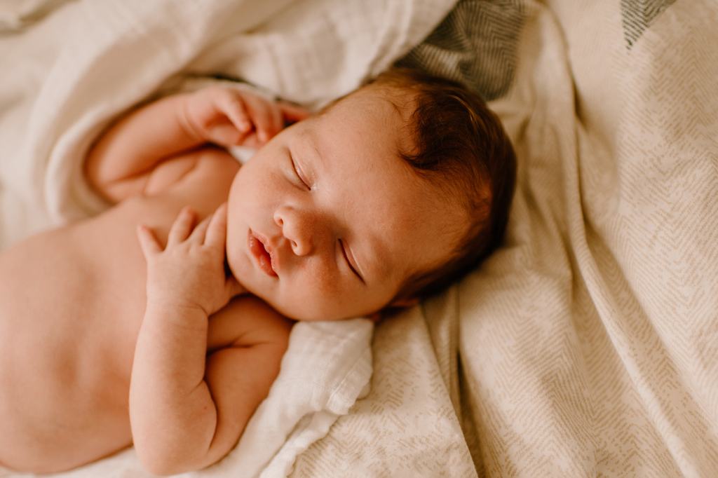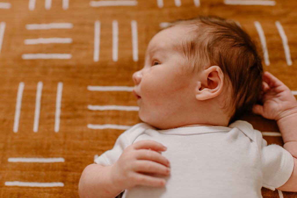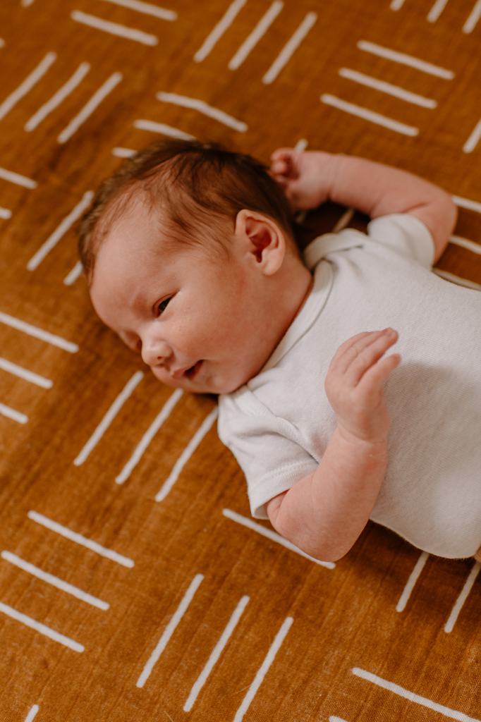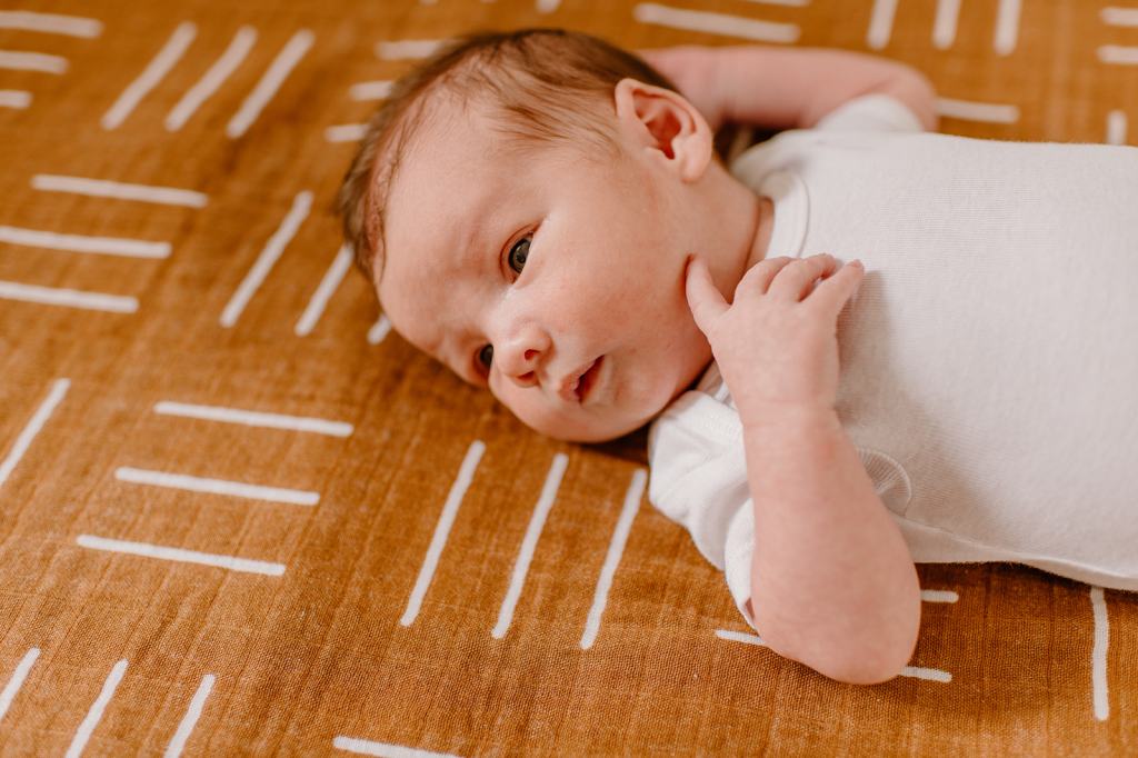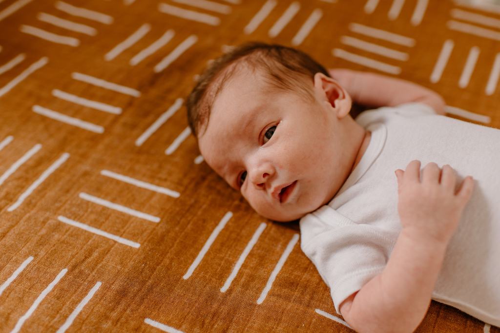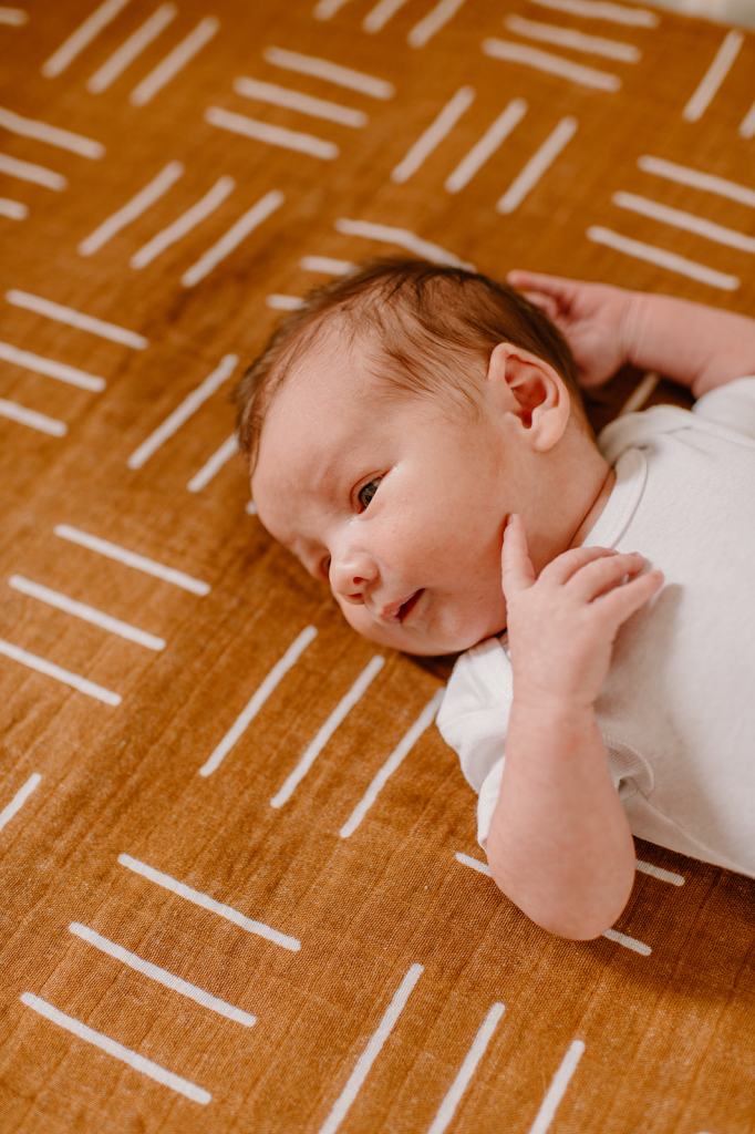 - If you don’t have one already, purchase a muslin blanket. Muslin and linen are the best textures on camera and are beautiful as a backdrop for lifestyle newborn photos. A muslin swaddle like this one is perfect.