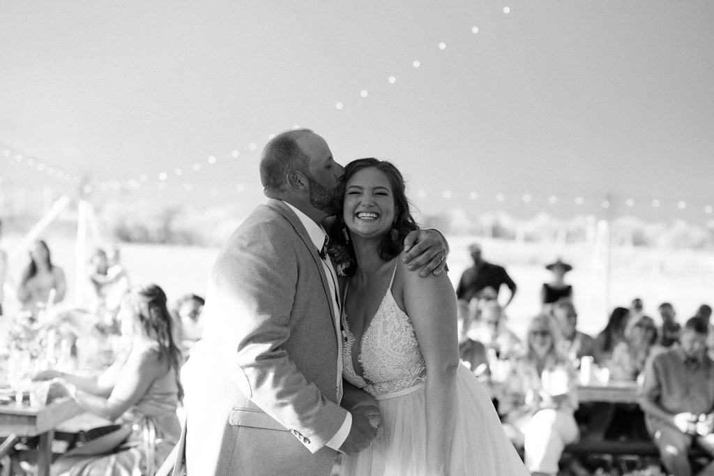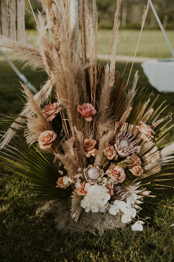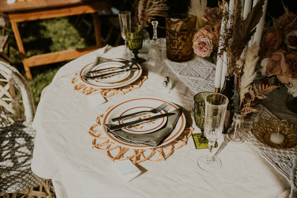 Aly is also an expert vintage collector and thrifter. Every detail of their wedding was handpicked and thrifted in the months leading up to their wedding. The plates she thrifted came from a local Salvation army. The boho rattan chargers came from Goodwill. To add a touch of whimsy, she added bright colored wildflowers to the table settings that matched her hair and wedding cake! The entire wedding felt boho and whimsical with a touch of western vibes.