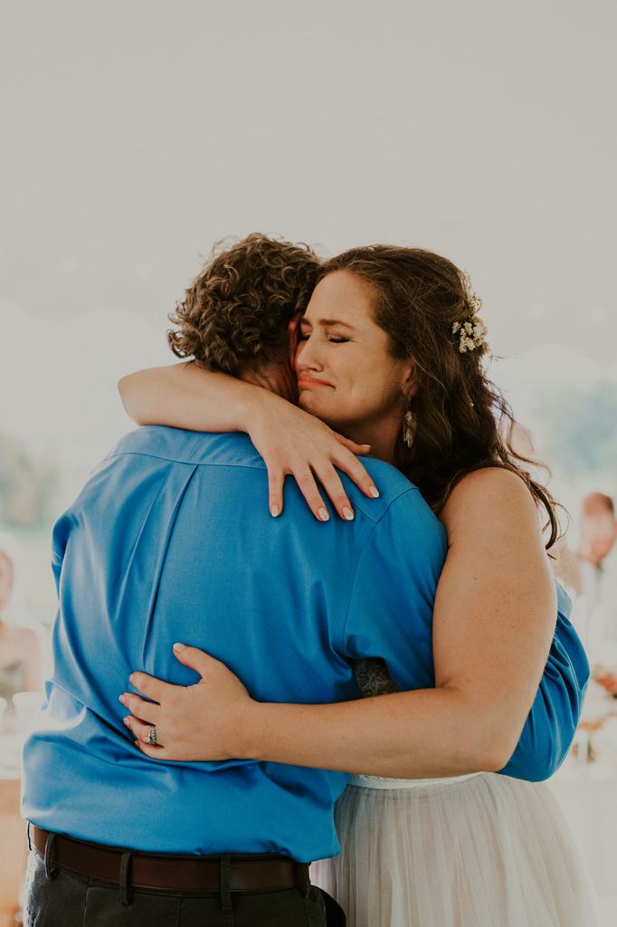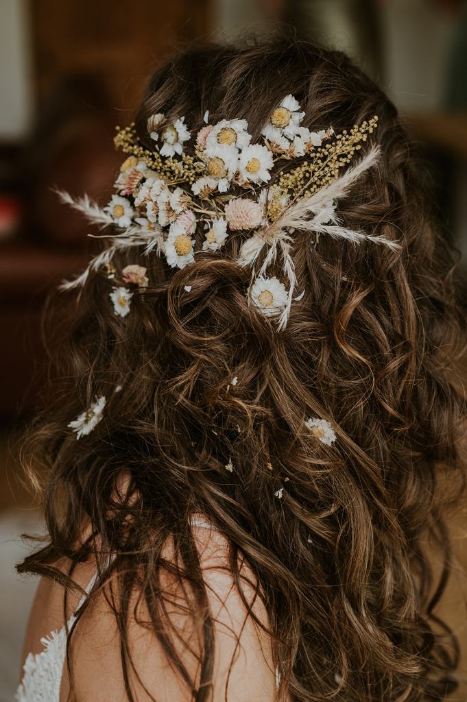 Aly loves wildflowers more than just about anything. She wanted the entire wedding to feel inspired by Idaho wildflowers. Using flower petals she dried in the weeks prior to their wedding, she glued wildflowers into her hair. They cascaded down her flowing brown hair. It was SO gorgeous. In addition to putting wildflowers in her hair, their wedding cake also had a wildflower theme with dried petals. Their flowers felt free, wild, and full of joyful early summer color!