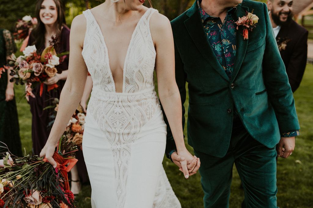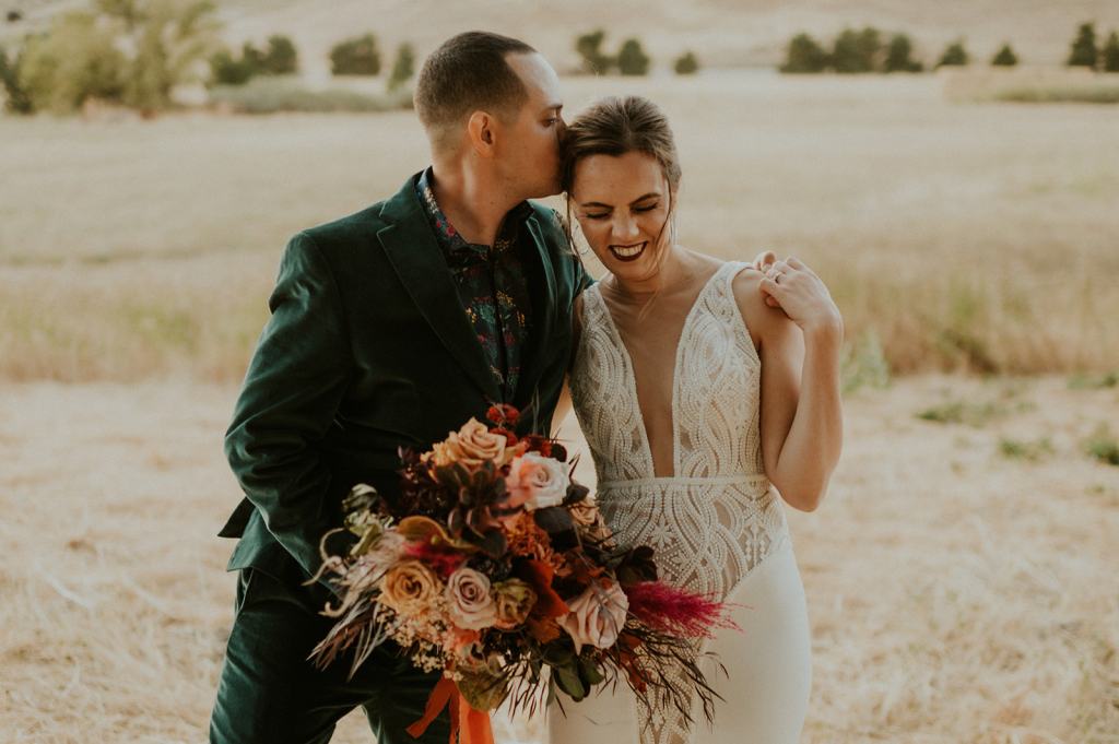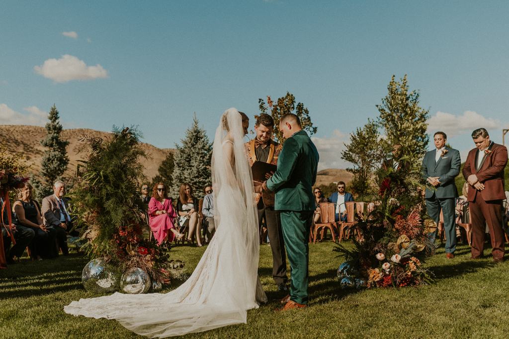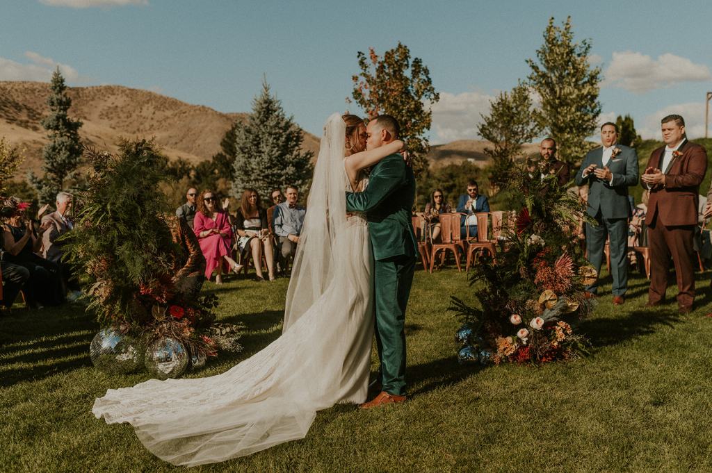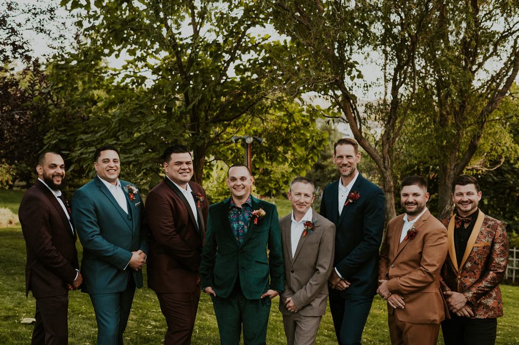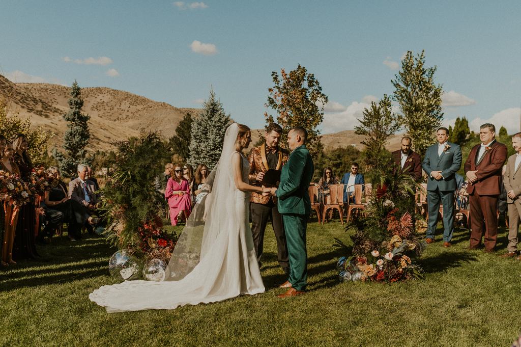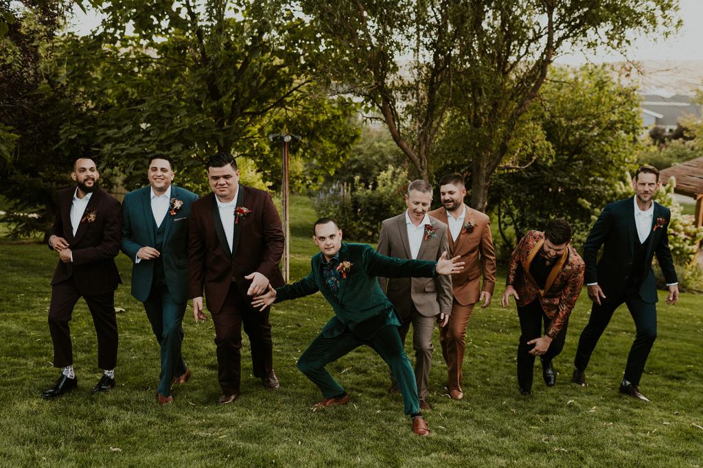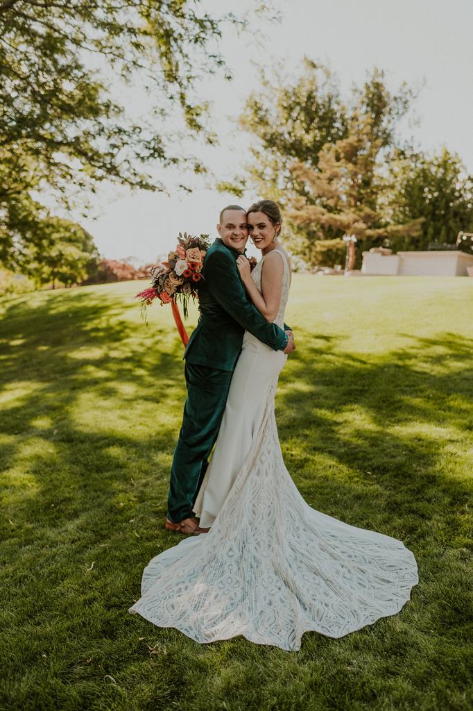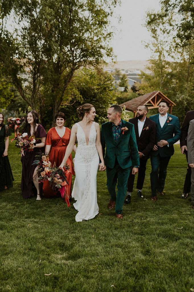 As I mentioned earlier, Evan and Erika LOVE dancing. They share a love for celebrating and a great party. Early on, Erika said the thing they were most excited about on their wedding day was just dancing. I laughed when they told me they would definitely be making it to their after party downtown once the wedding was over! I loved every detail that went into making their wedding feel like them. Evan wore a custom green velvet suit from Bespoke Boise. The colorful floral shirt underneath popped and felt so true to the retro 70 vibes they wanted! Erika wore a glam plunging neckline lace dress. Her makeup by Morgan couldn’t have been more perfect. She wanted dramatic cat eye liner and dark lipstick to match the overall fall aesthetic. As a Boise Wedding Photographer, it simply doesn’t get better than this.