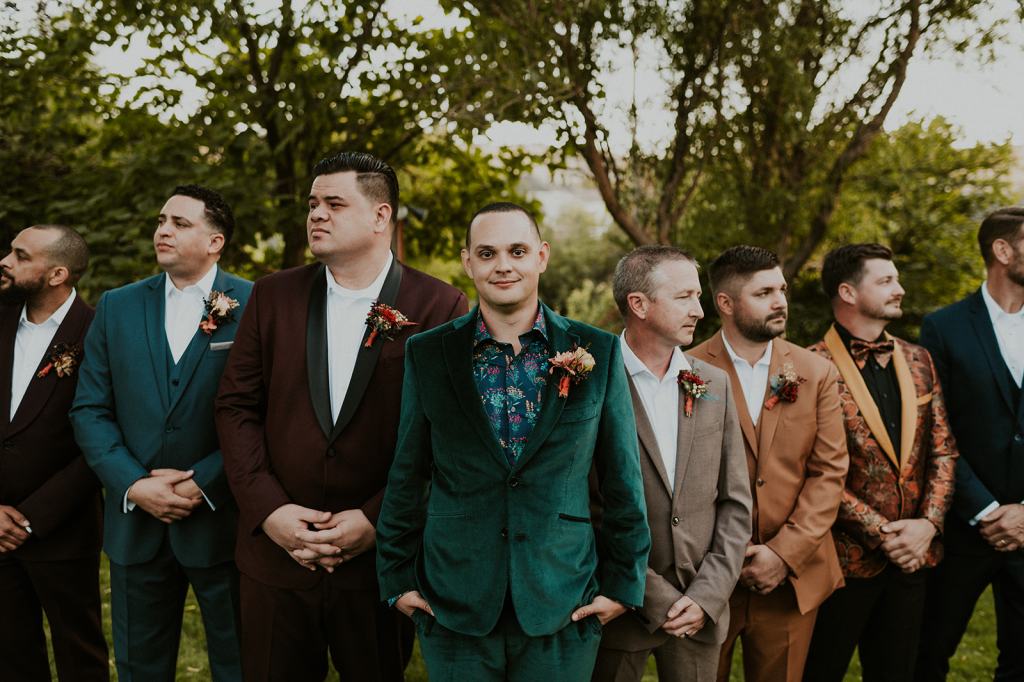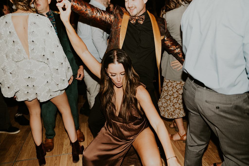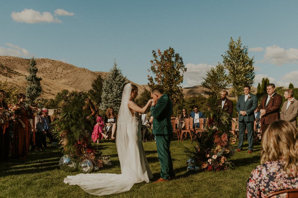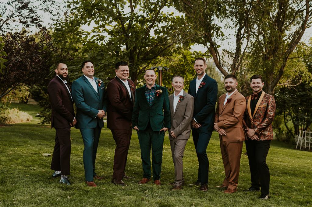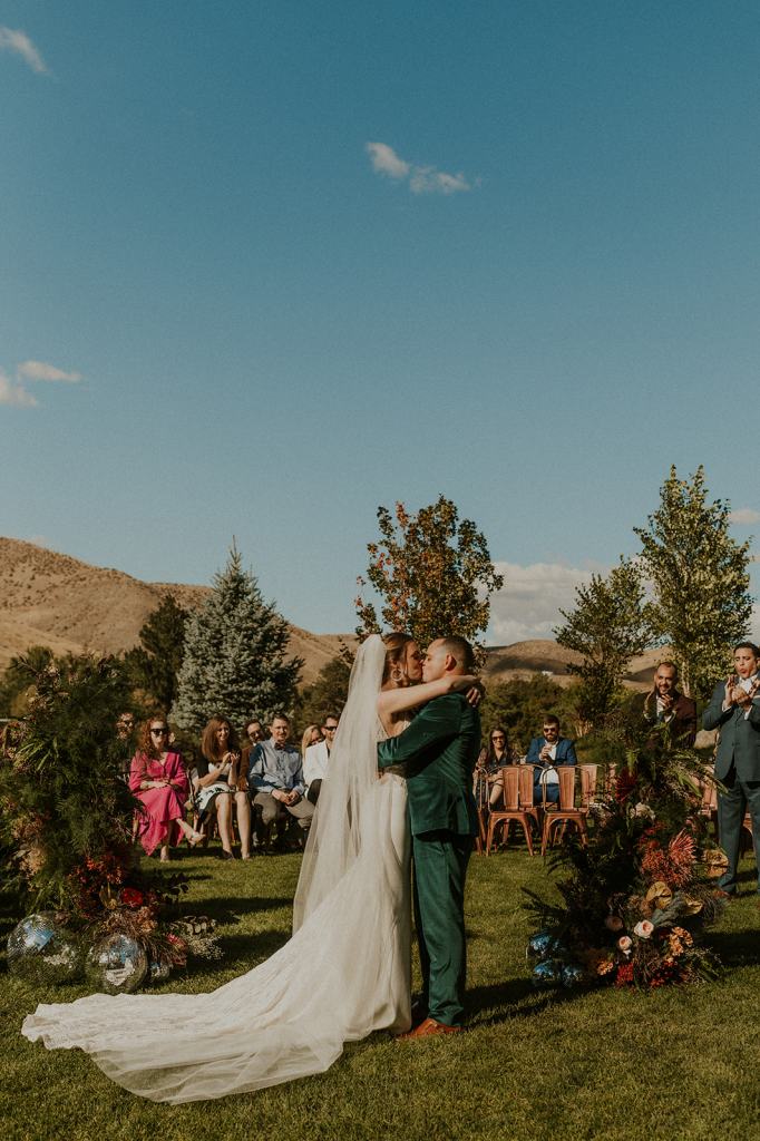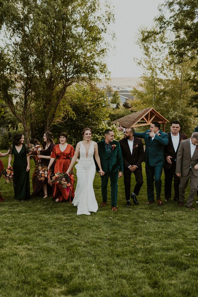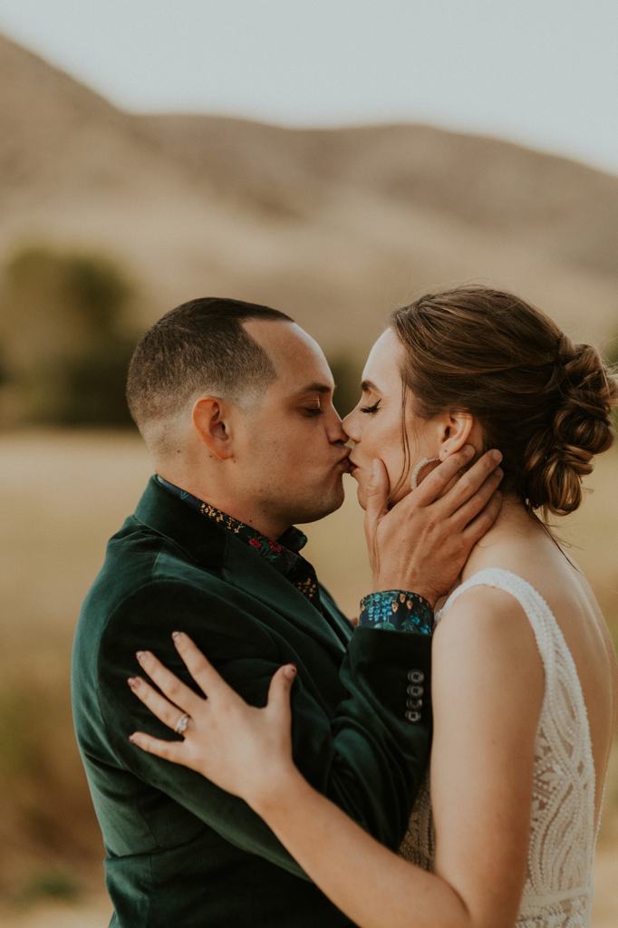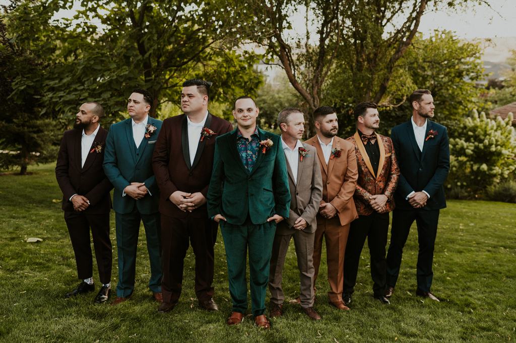 As I mentioned earlier, Evan and Erika LOVE dancing. They share a love for celebrating and a great party. Early on, Erika said the thing they were most excited about on their wedding day was just dancing. I laughed when they told me they would definitely be making it to their after party downtown once the wedding was over! I loved every detail that went into making their wedding feel like them. Evan wore a custom green velvet suit from Bespoke Boise. The colorful floral shirt underneath popped and felt so true to the retro 70 vibes they wanted! Erika wore a glam plunging neckline lace dress. Her makeup by Morgan couldn’t have been more perfect. She wanted dramatic cat eye liner and dark lipstick to match the overall fall aesthetic. As a Boise Wedding Photographer, it simply doesn’t get better than this.