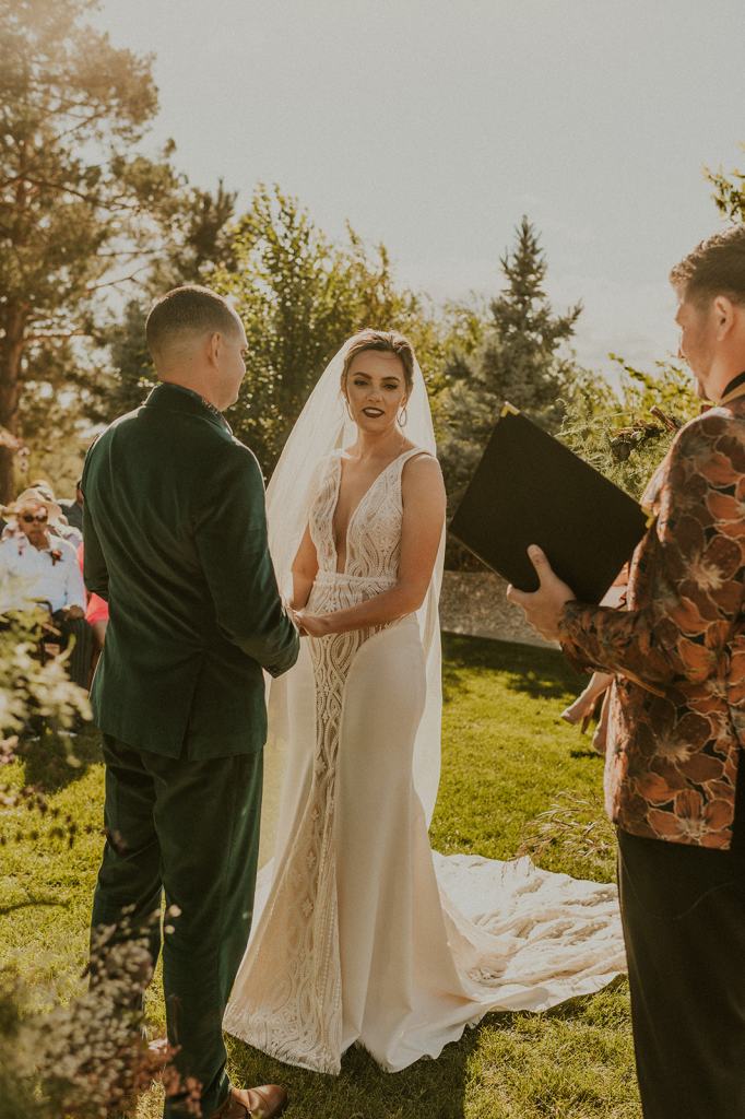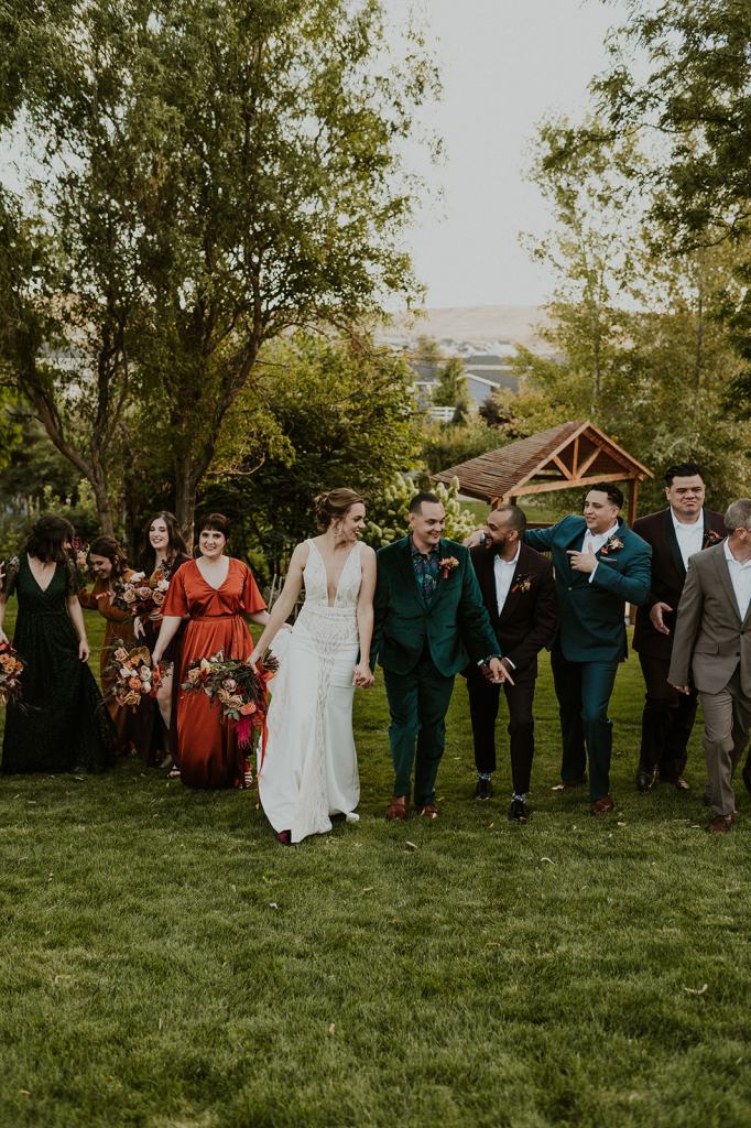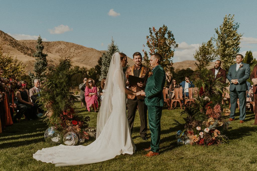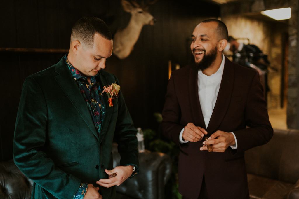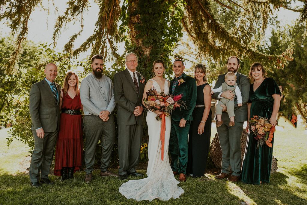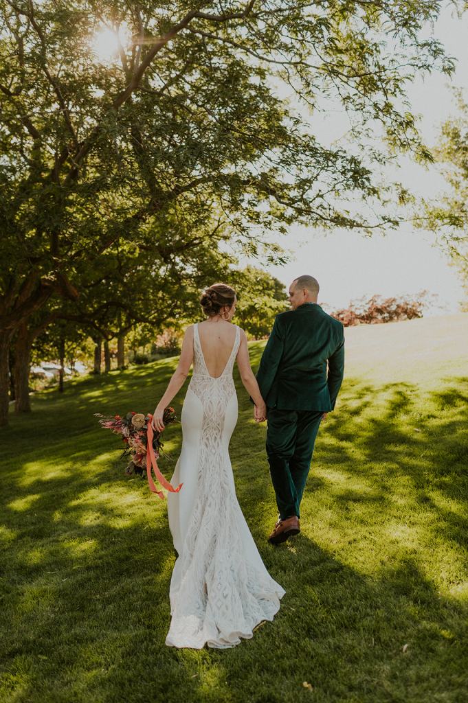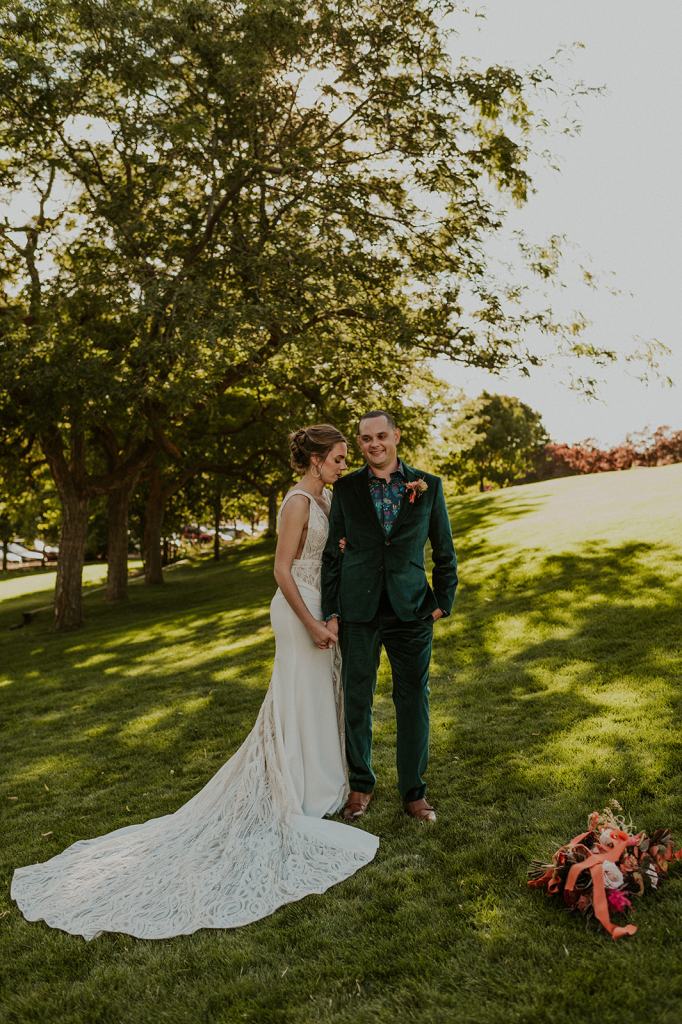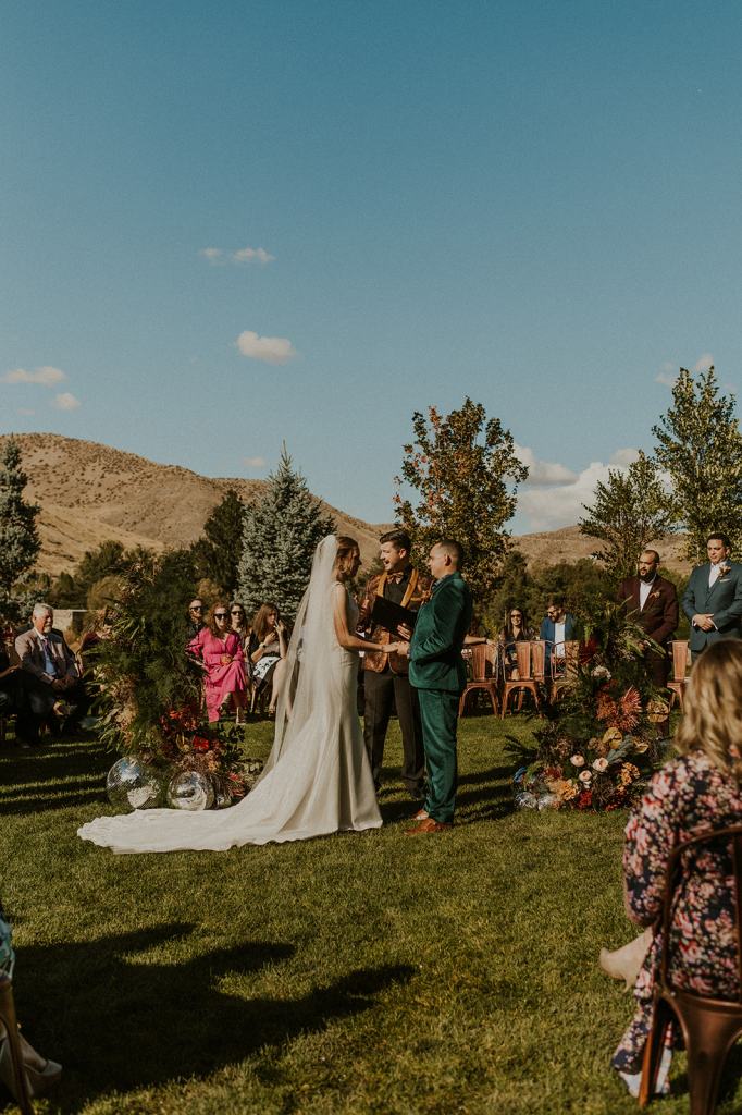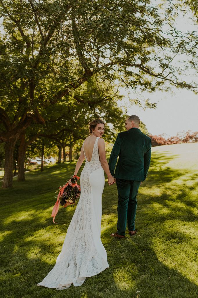 As I mentioned earlier, Evan and Erika LOVE dancing. They share a love for celebrating and a great party. Early on, Erika said the thing they were most excited about on their wedding day was just dancing. I laughed when they told me they would definitely be making it to their after party downtown once the wedding was over! I loved every detail that went into making their wedding feel like them. Evan wore a custom green velvet suit from Bespoke Boise. The colorful floral shirt underneath popped and felt so true to the retro 70 vibes they wanted! Erika wore a glam plunging neckline lace dress. Her makeup by Morgan couldn’t have been more perfect. She wanted dramatic cat eye liner and dark lipstick to match the overall fall aesthetic. As a Boise Wedding Photographer, it simply doesn’t get better than this.