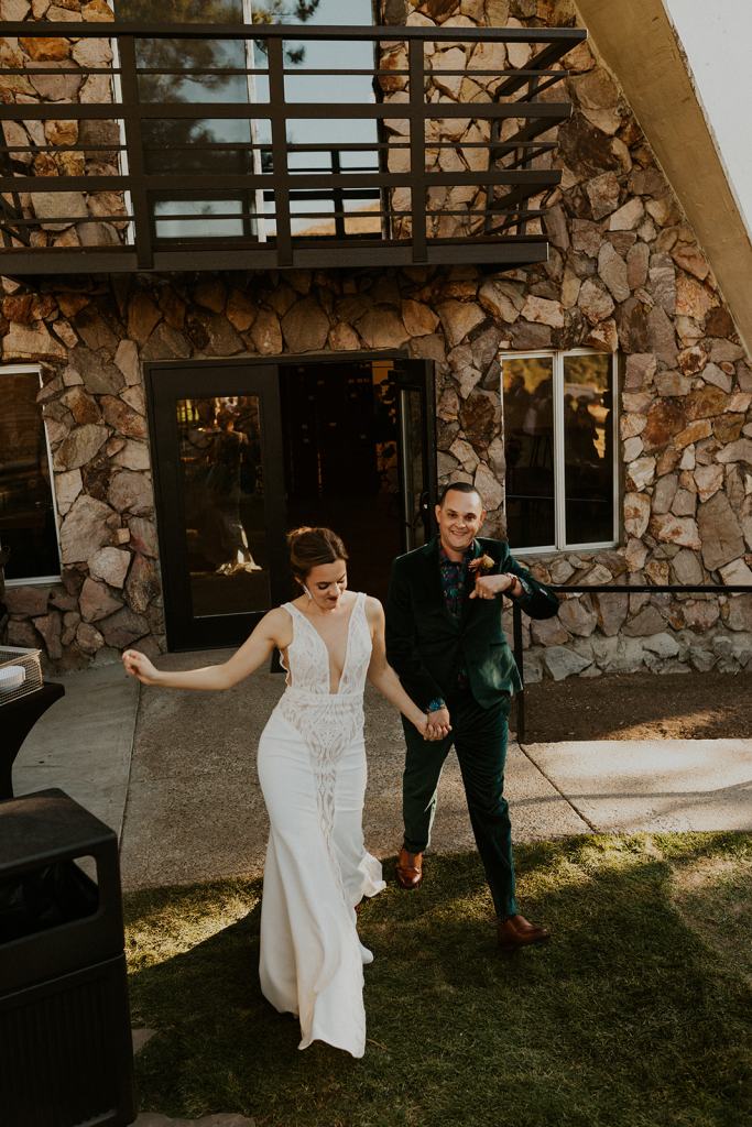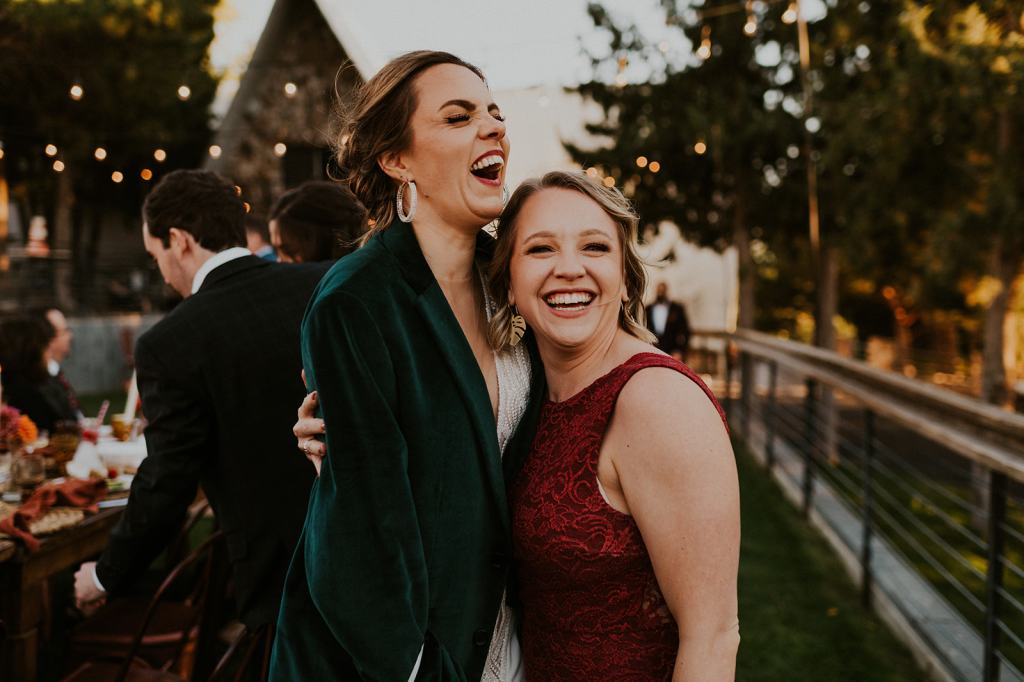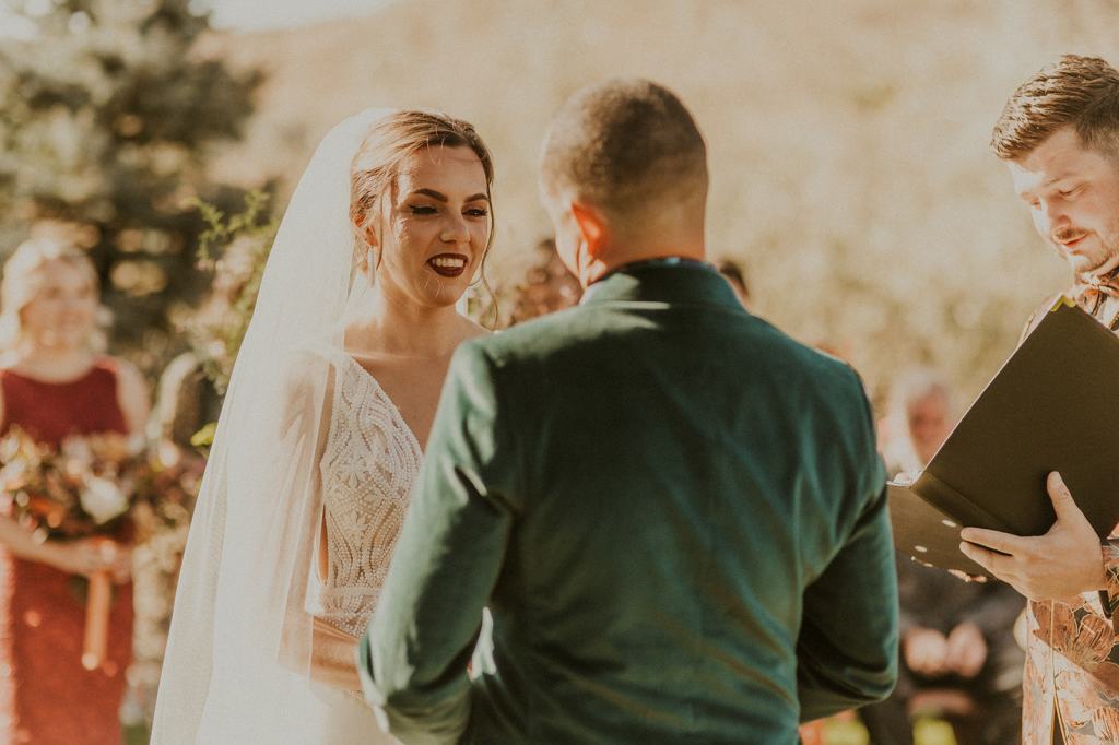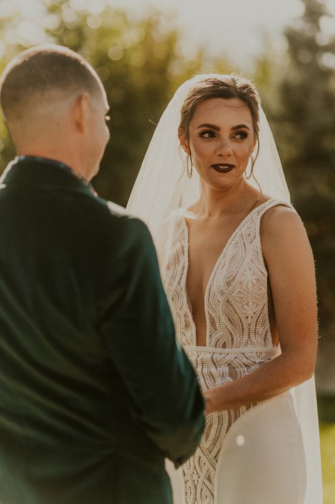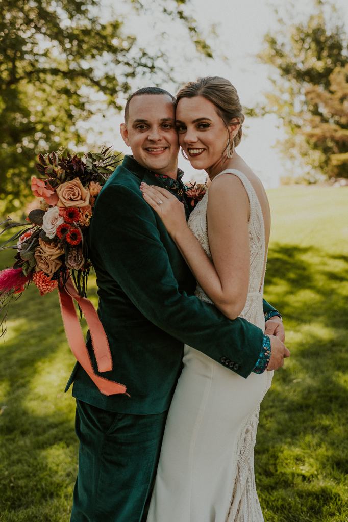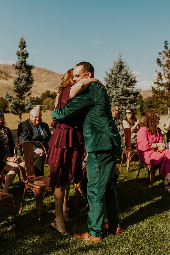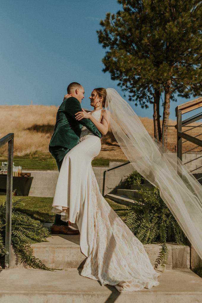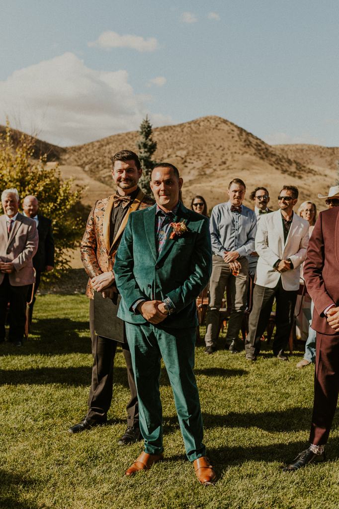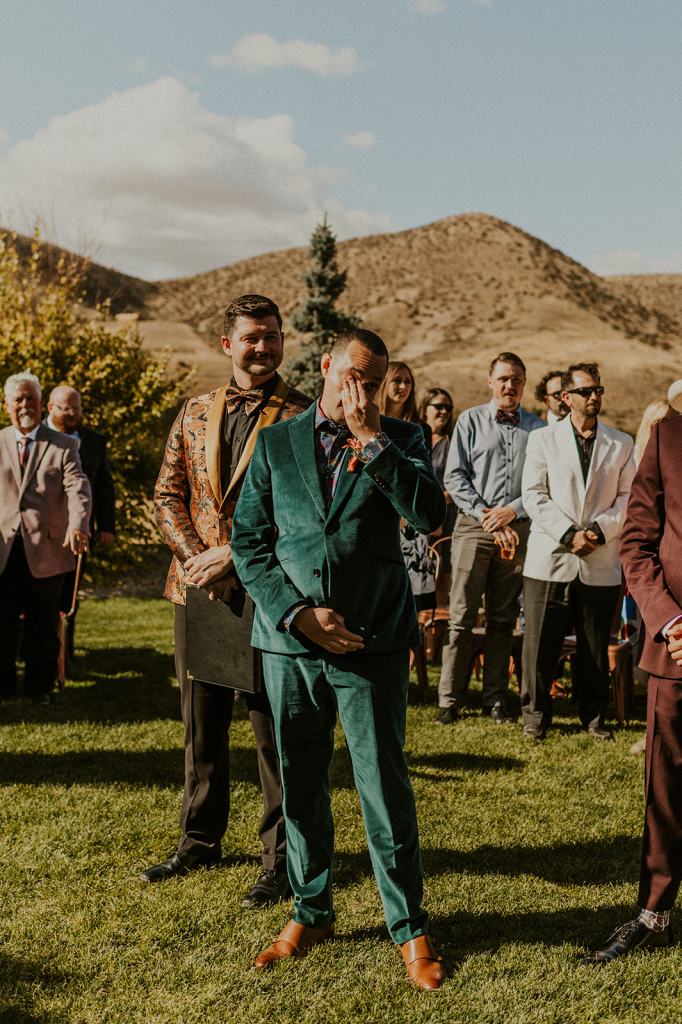 As I mentioned earlier, Evan and Erika LOVE dancing. They share a love for celebrating and a great party. Early on, Erika said the thing they were most excited about on their wedding day was just dancing. I laughed when they told me they would definitely be making it to their after party downtown once the wedding was over! I loved every detail that went into making their wedding feel like them. Evan wore a custom green velvet suit from Bespoke Boise. The colorful floral shirt underneath popped and felt so true to the retro 70 vibes they wanted! Erika wore a glam plunging neckline lace dress. Her makeup by Morgan couldn’t have been more perfect. She wanted dramatic cat eye liner and dark lipstick to match the overall fall aesthetic. As a Boise Wedding Photographer, it simply doesn’t get better than this.