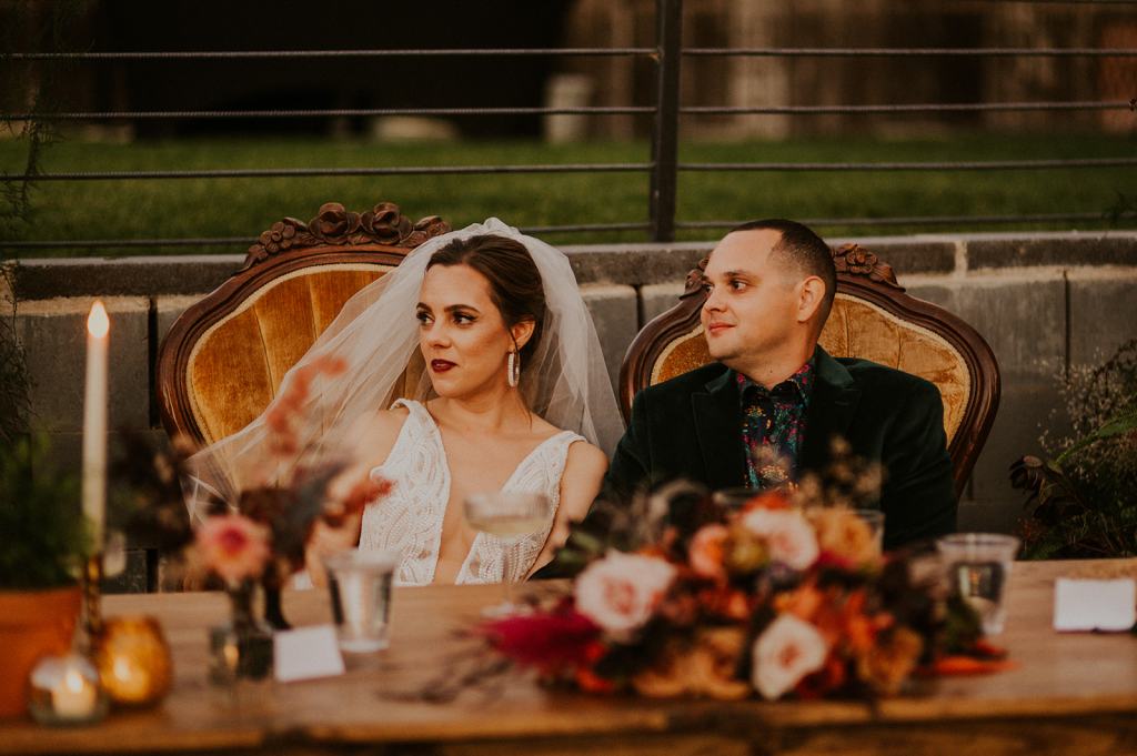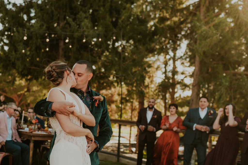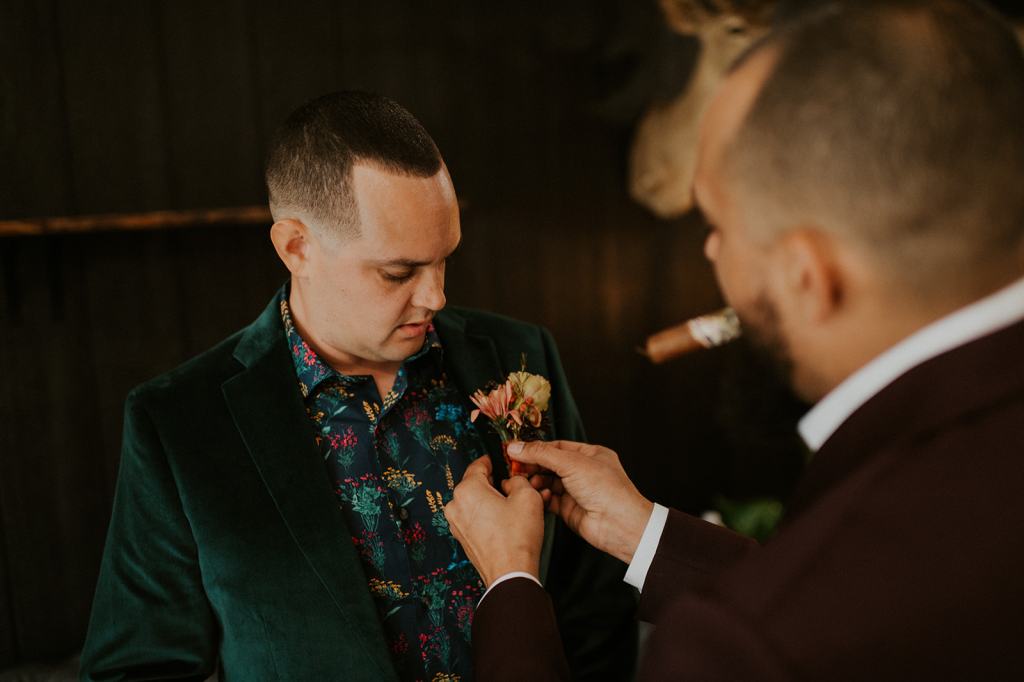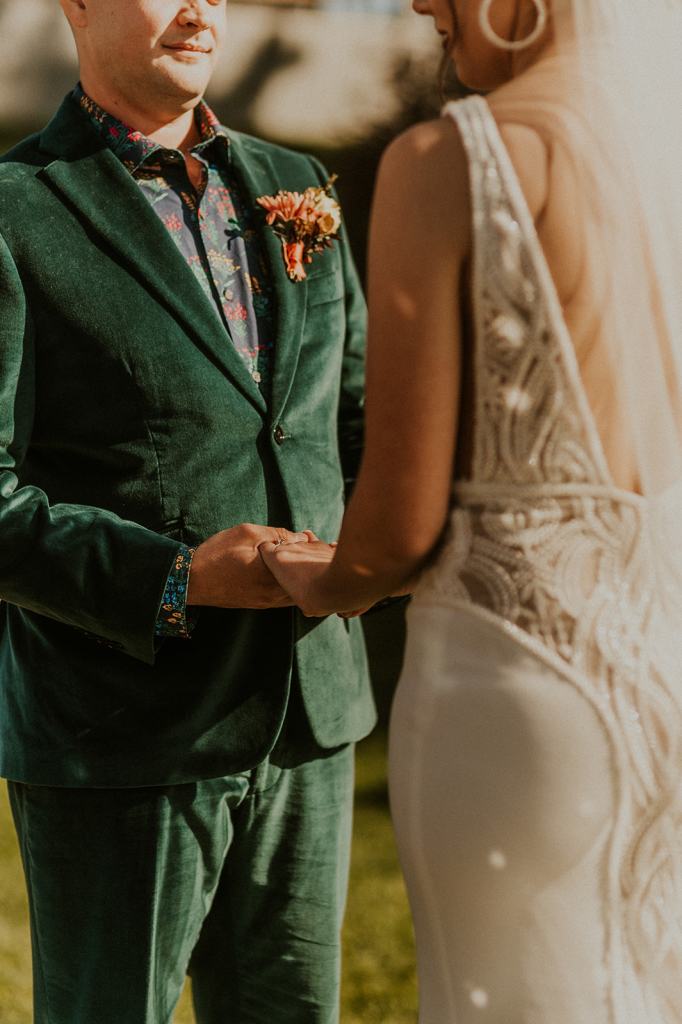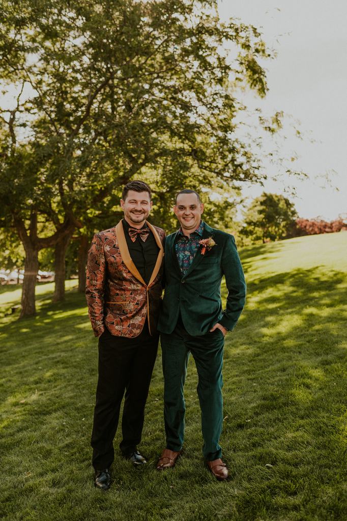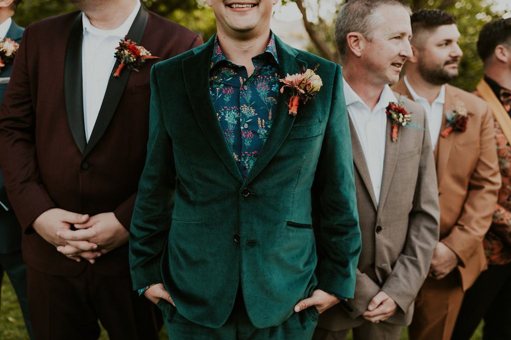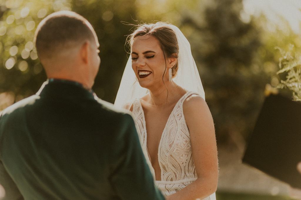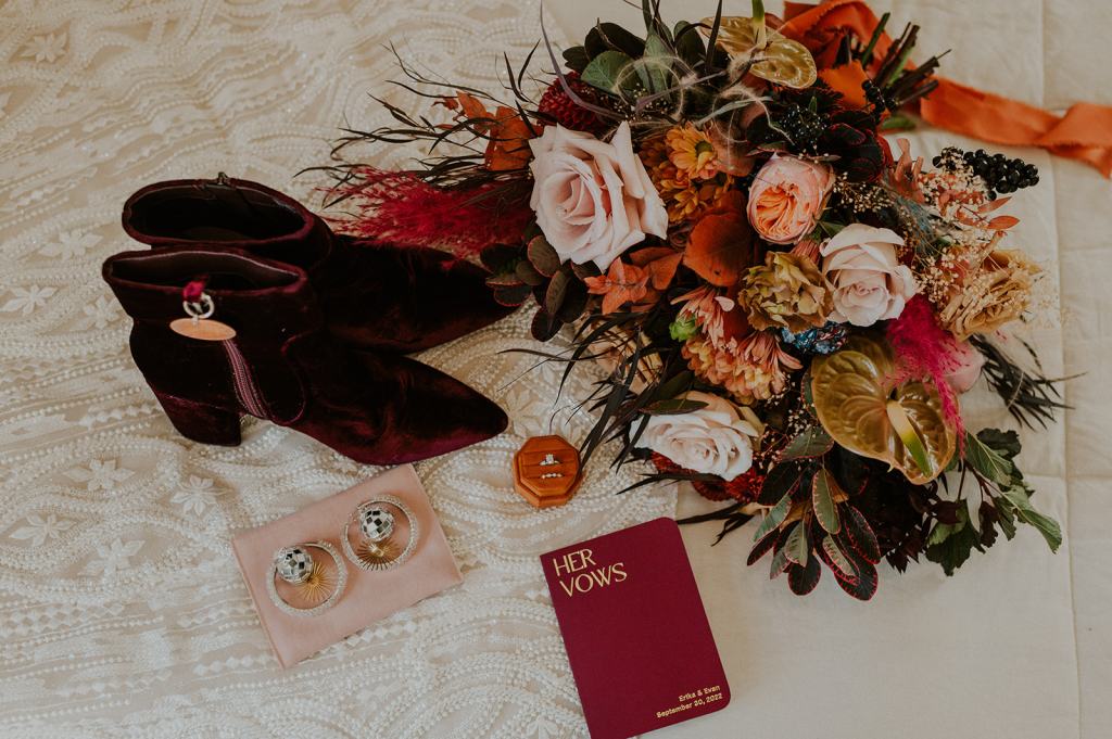 As I mentioned earlier, Evan and Erika LOVE dancing. They share a love for celebrating and a great party. Early on, Erika said the thing they were most excited about on their wedding day was just dancing. I laughed when they told me they would definitely be making it to their after party downtown once the wedding was over! I loved every detail that went into making their wedding feel like them. Evan wore a custom green velvet suit from Bespoke Boise. The colorful floral shirt underneath popped and felt so true to the retro 70 vibes they wanted! Erika wore a glam plunging neckline lace dress. Her makeup by Morgan couldn’t have been more perfect. She wanted dramatic cat eye liner and dark lipstick to match the overall fall aesthetic. As a Boise Wedding Photographer, it simply doesn’t get better than this.