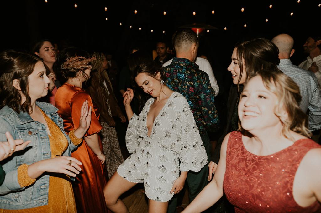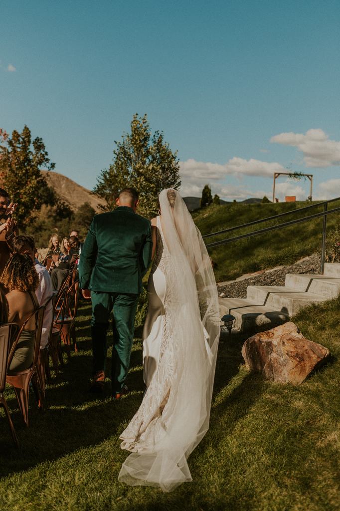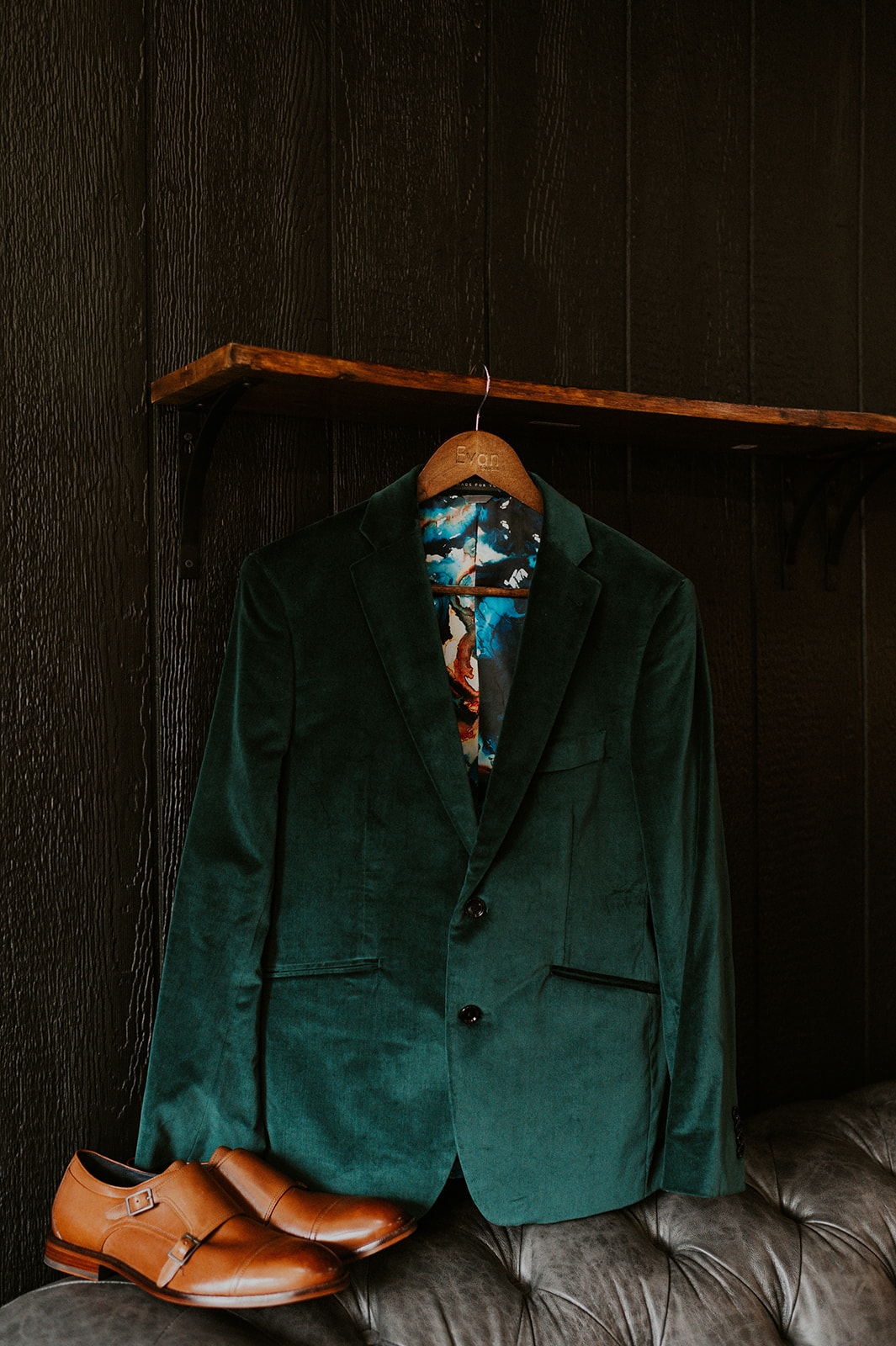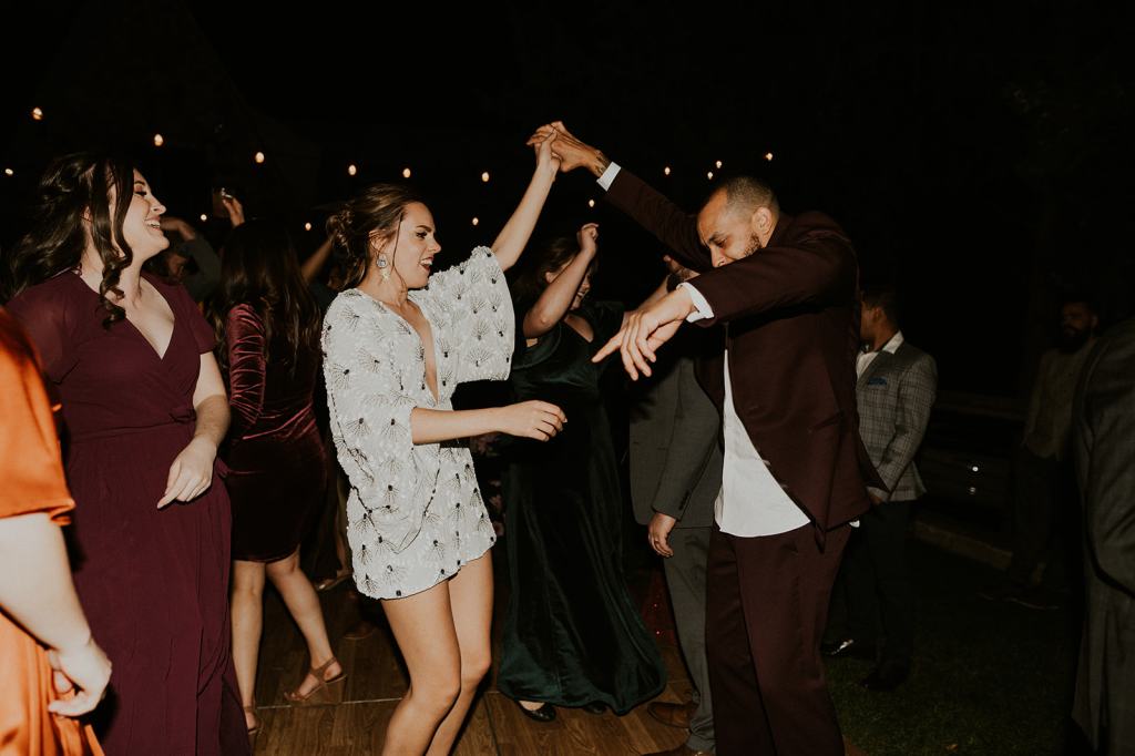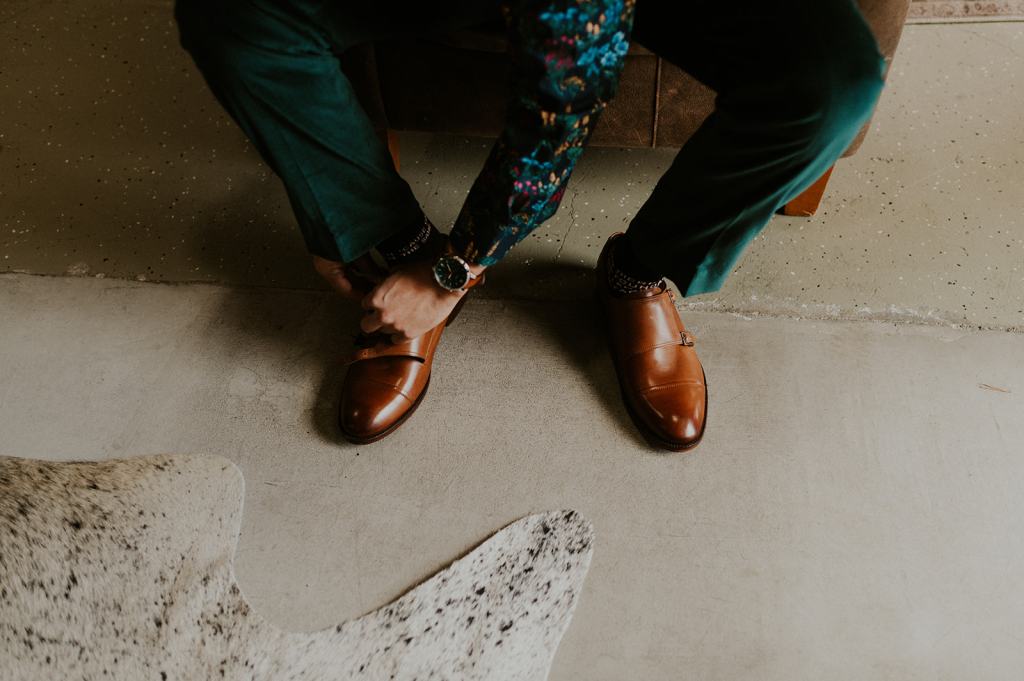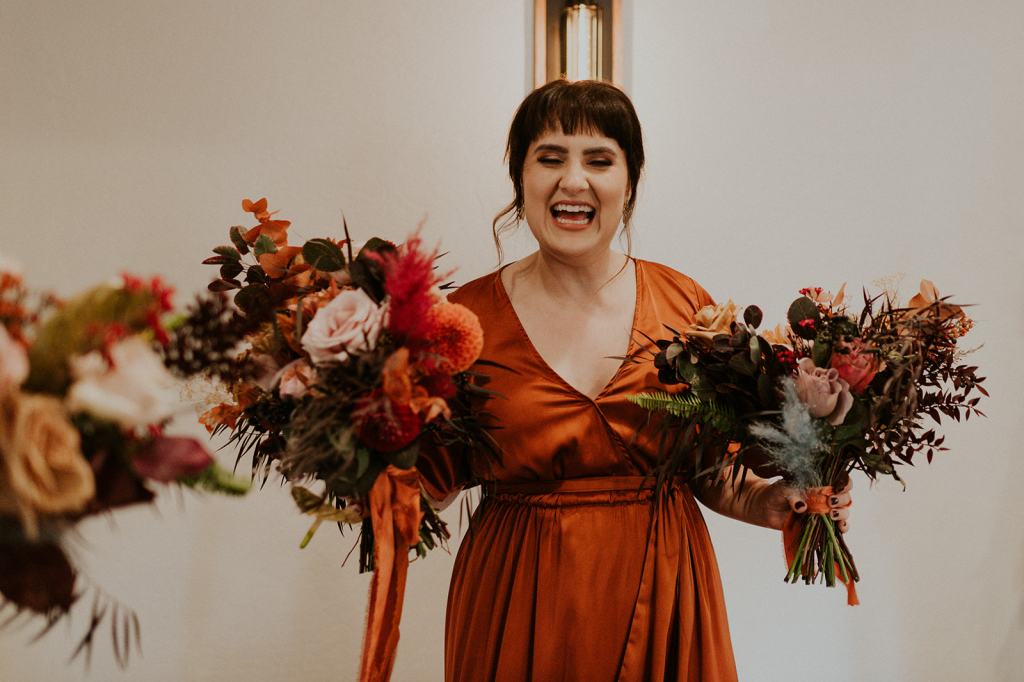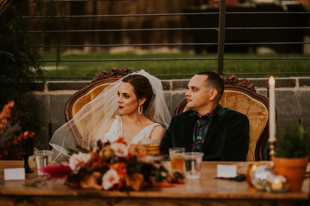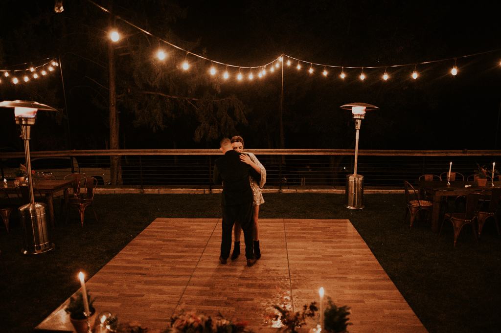 As I mentioned earlier, Evan and Erika LOVE dancing. They share a love for celebrating and a great party. Early on, Erika said the thing they were most excited about on their wedding day was just dancing. I laughed when they told me they would definitely be making it to their after party downtown once the wedding was over! I loved every detail that went into making their wedding feel like them. Evan wore a custom green velvet suit from Bespoke Boise. The colorful floral shirt underneath popped and felt so true to the retro 70 vibes they wanted! Erika wore a glam plunging neckline lace dress. Her makeup by Morgan couldn’t have been more perfect. She wanted dramatic cat eye liner and dark lipstick to match the overall fall aesthetic. As a Boise Wedding Photographer, it simply doesn’t get better than this.