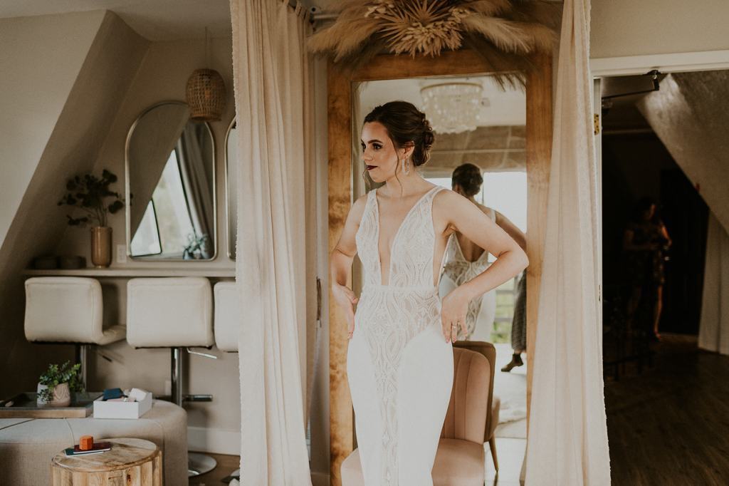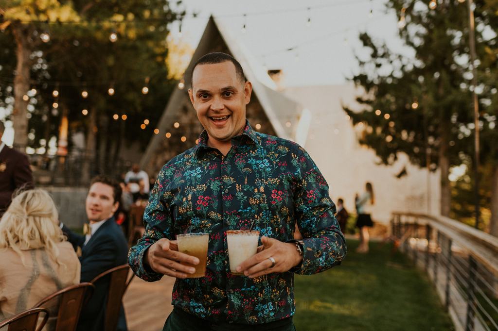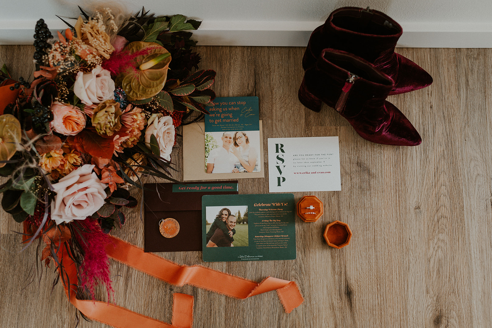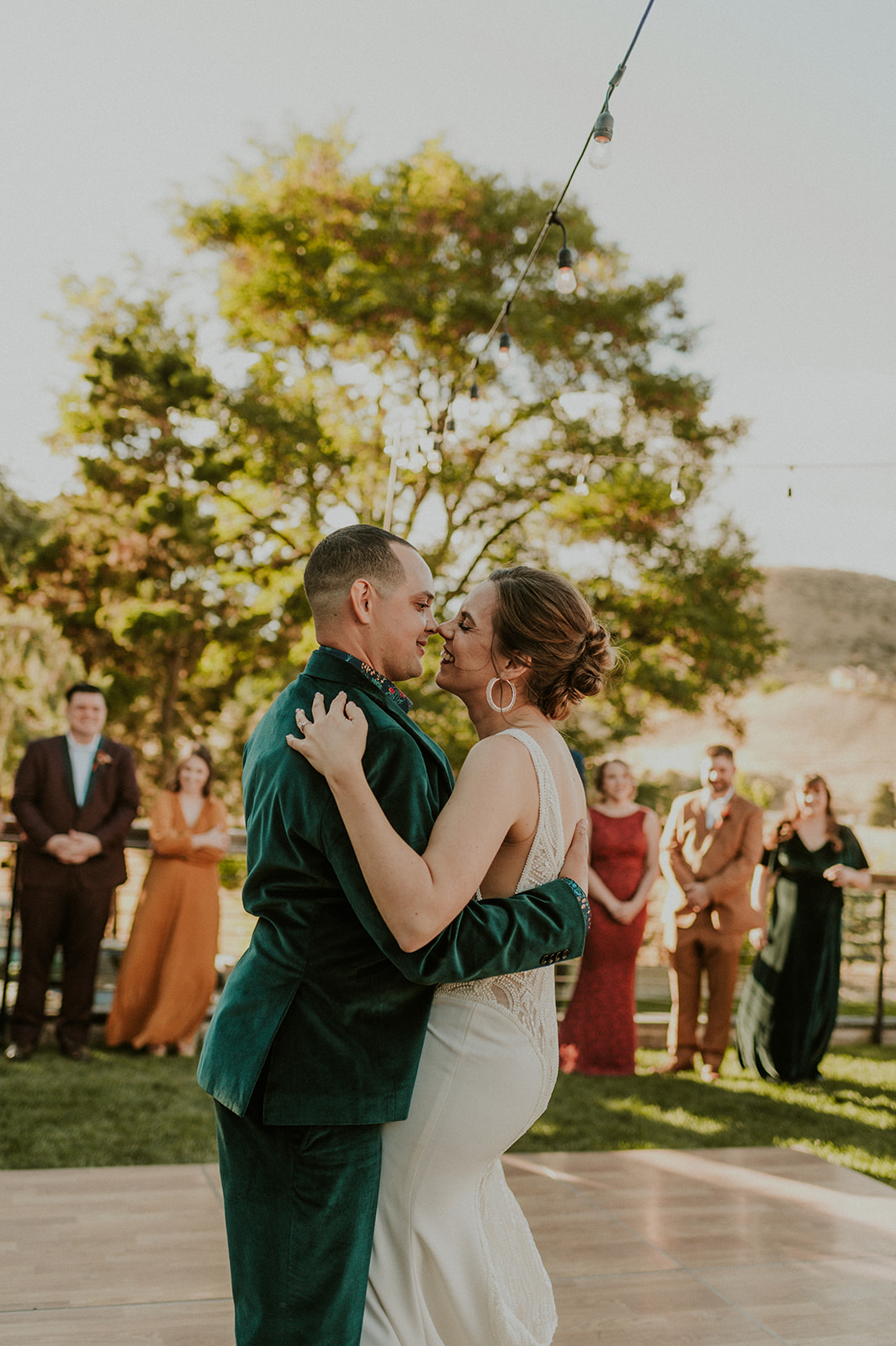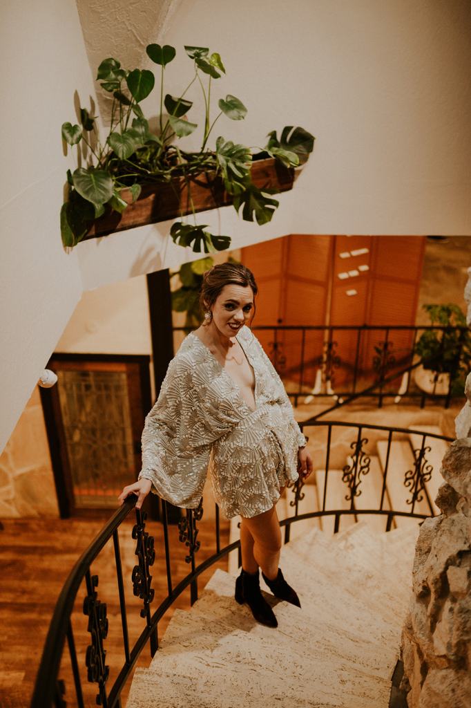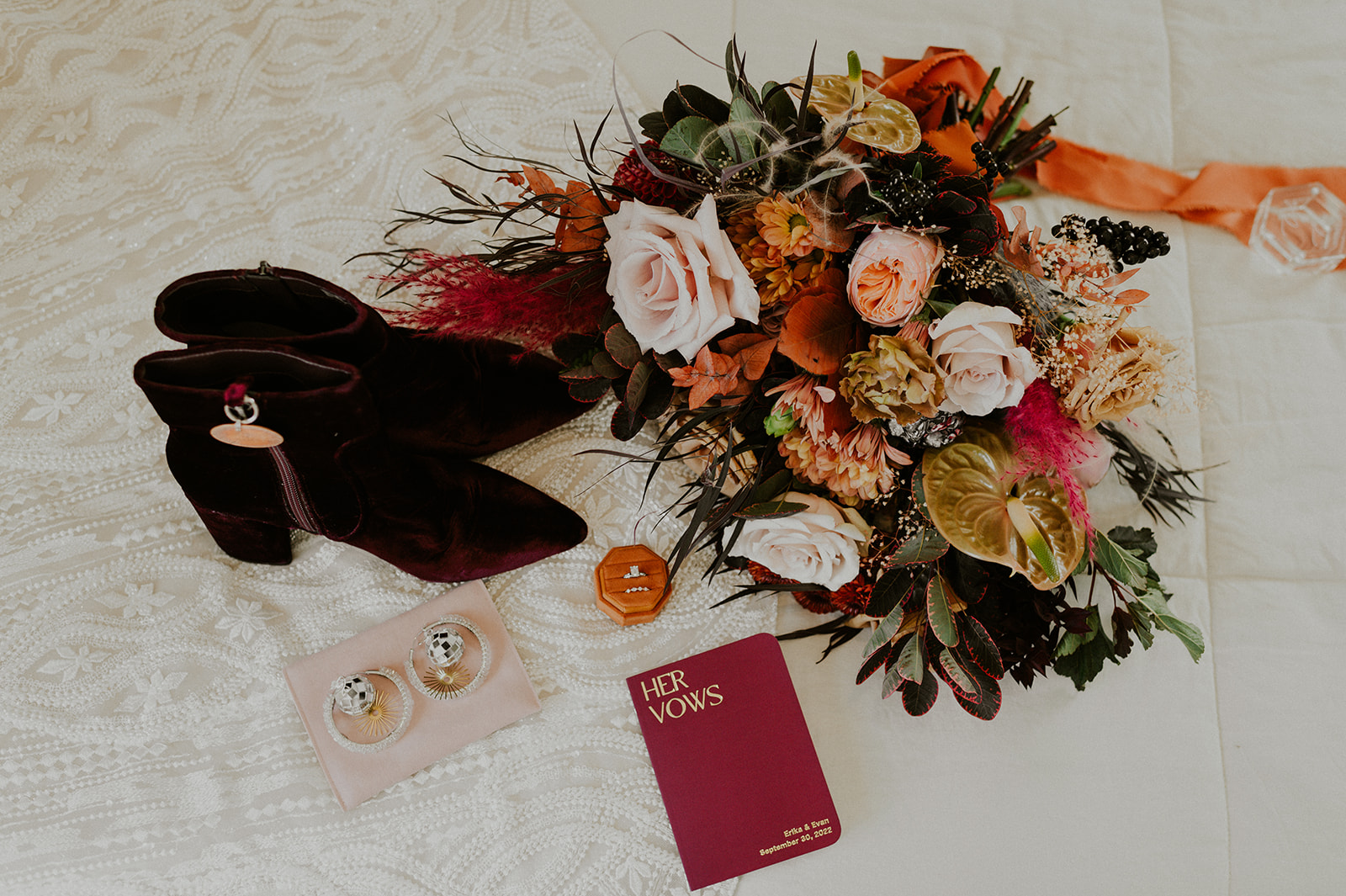 As I mentioned earlier, Evan and Erika LOVE dancing. They share a love for celebrating and a great party. Early on, Erika said the thing they were most excited about on their wedding day was just dancing. I laughed when they told me they would definitely be making it to their after party downtown once the wedding was over! I loved every detail that went into making their wedding feel like them. Evan wore a custom green velvet suit from Bespoke Boise. The colorful floral shirt underneath popped and felt so true to the retro 70 vibes they wanted! Erika wore a glam plunging neckline lace dress. Her makeup by Morgan couldn’t have been more perfect. She wanted dramatic cat eye liner and dark lipstick to match the overall fall aesthetic. As a Boise Wedding Photographer, it simply doesn’t get better than this.