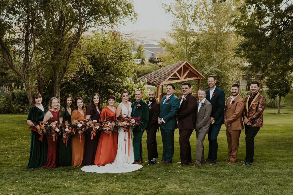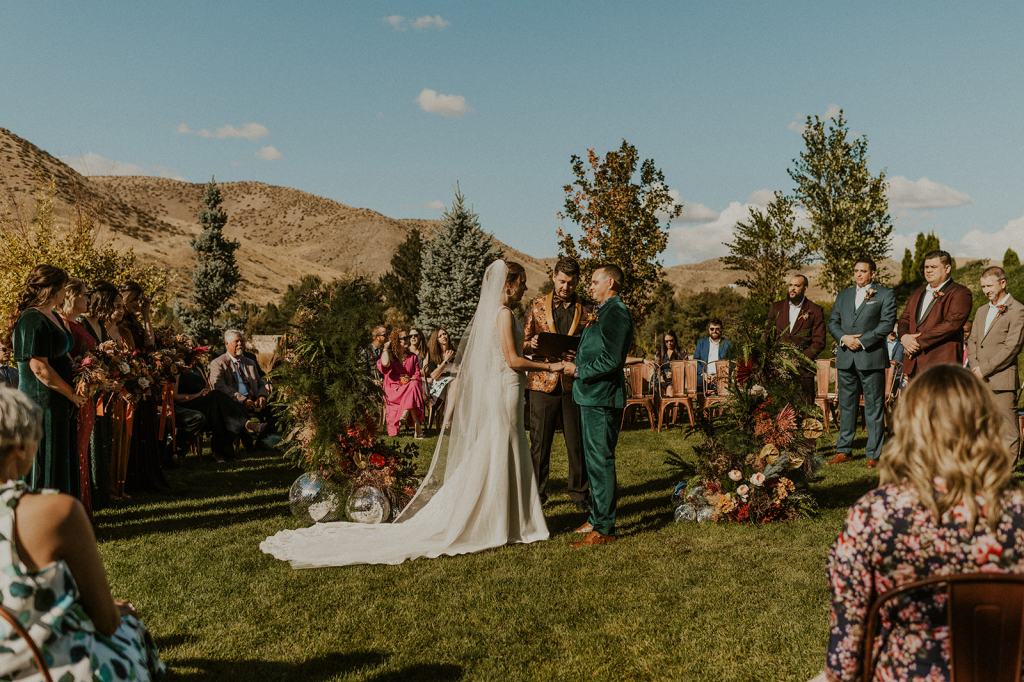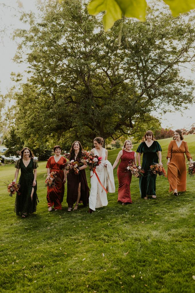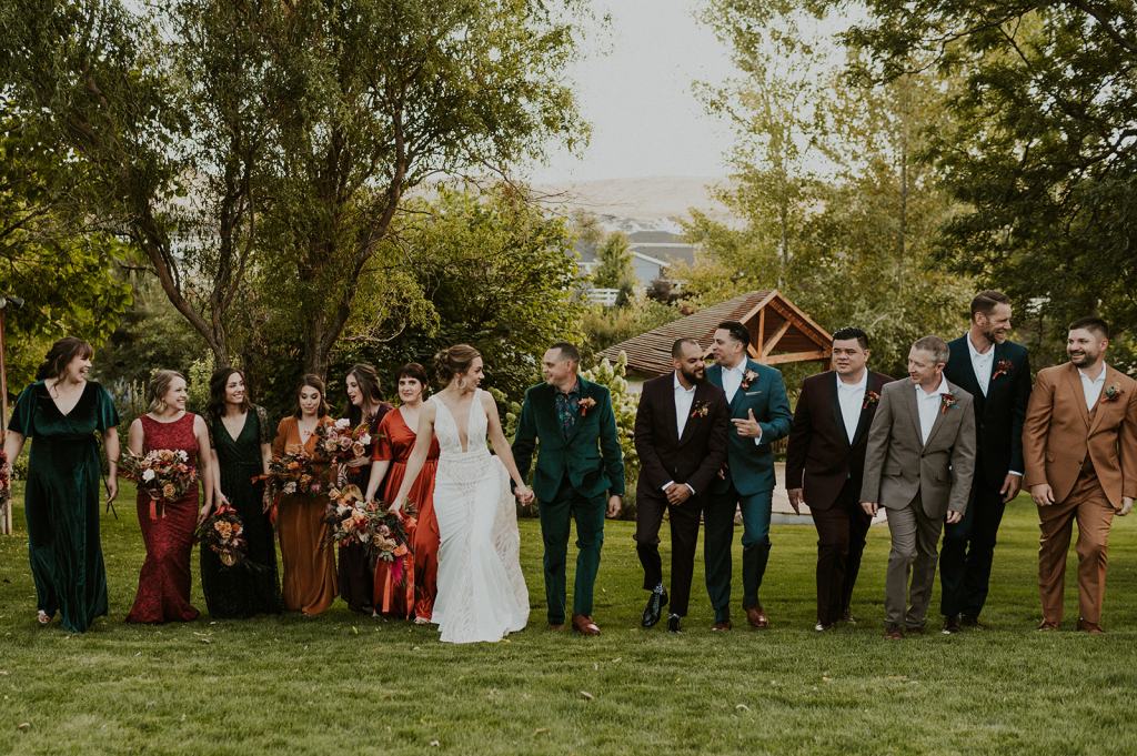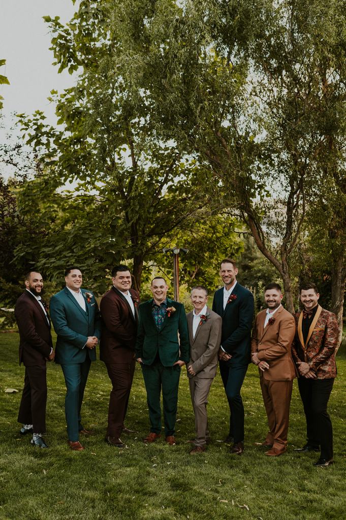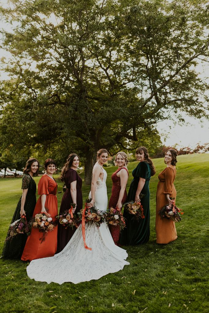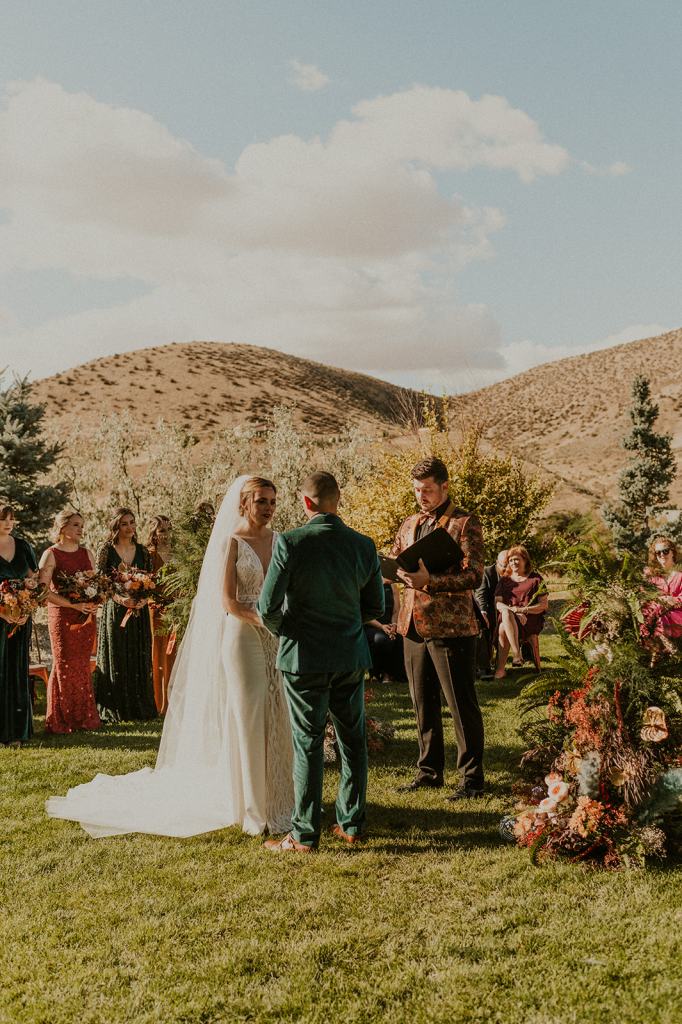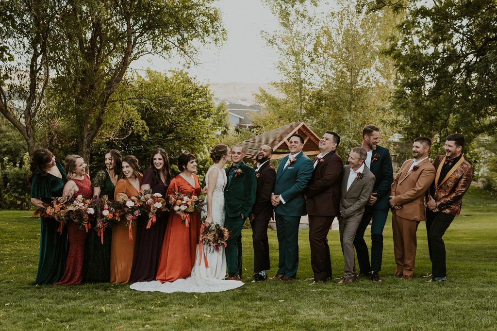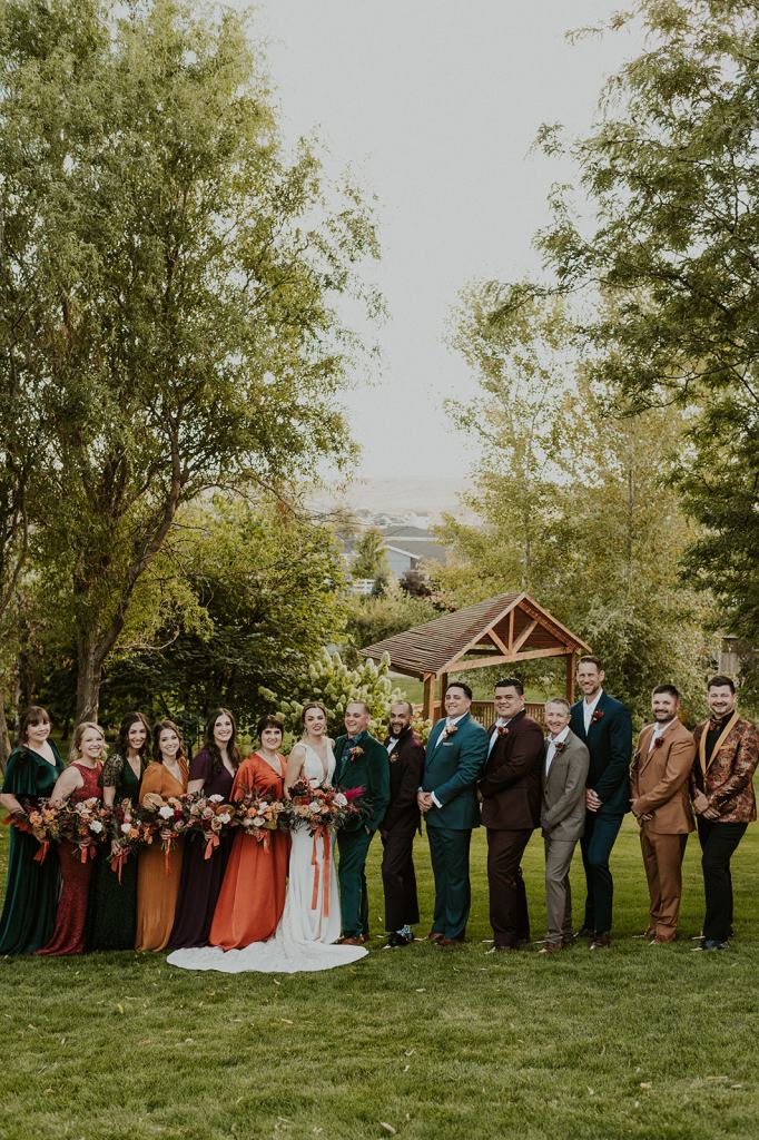 The details by Foxx and Fern were also unbelievable. I have worked with Caitlin before in McCall for Lyndsey and Brett’s Lavish Elopement and her eye for design blows me away. The custom seating chart with jewel toned tassels were adorable. Custom retro designed signage added personality to every table. I couldn’t get over the gorgeous cigar lounge designed for their cocktail hour with a neon sign reading “to the moon and back”. Also, the mismatched jewel toned bridesmaids dresses were incredible! If you love this Stone Crossing Boise Wedding, check out my link’s below 🙂