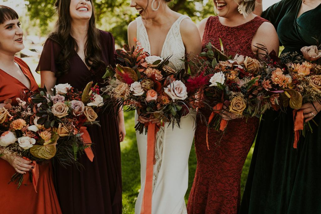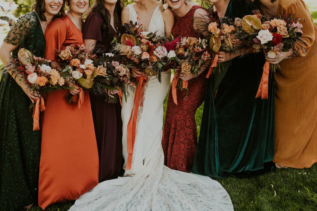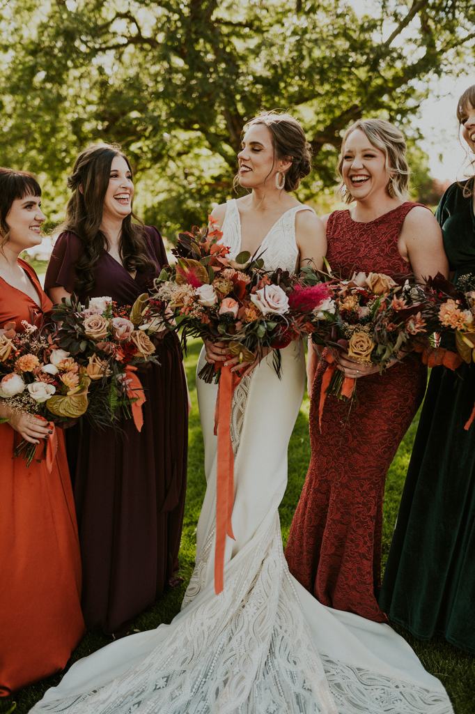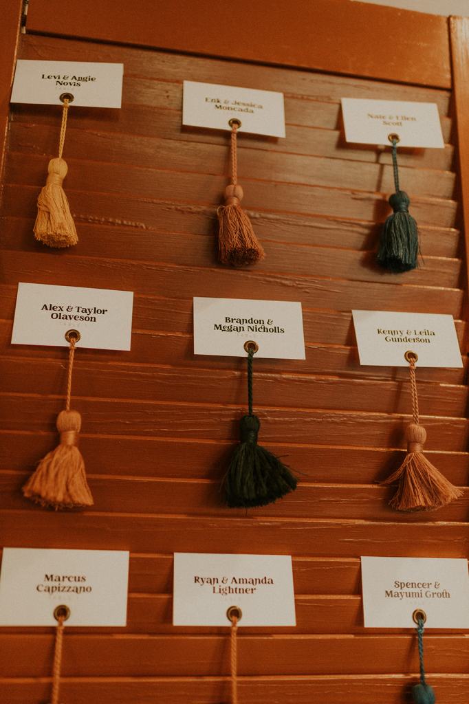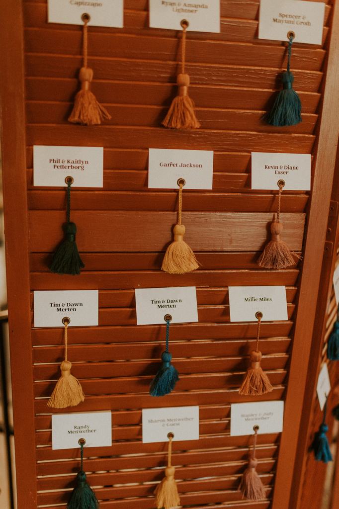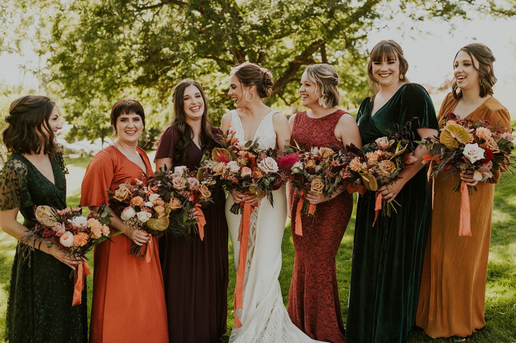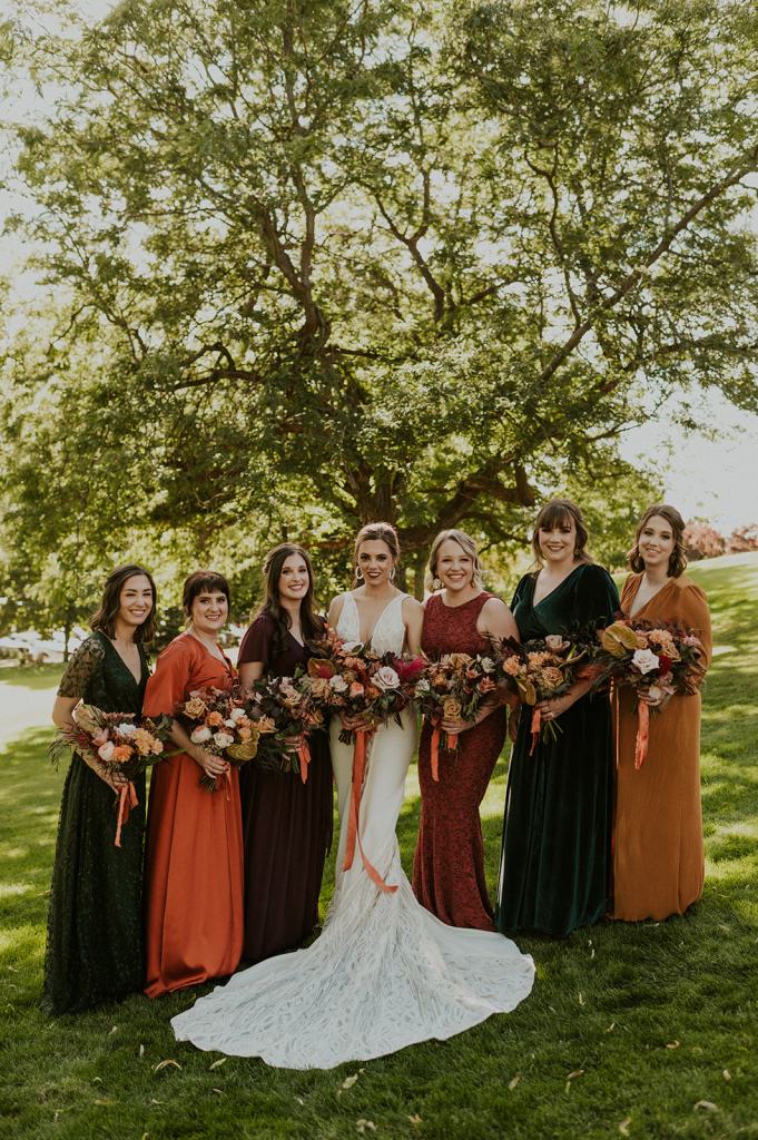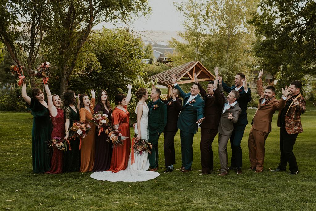 The details by Foxx and Fern were also unbelievable. I have worked with Caitlin before in McCall for Lyndsey and Brett’s Lavish Elopement and her eye for design blows me away. The custom seating chart with jewel toned tassels were adorable. Custom retro designed signage added personality to every table. I couldn’t get over the gorgeous cigar lounge designed for their cocktail hour with a neon sign reading “to the moon and back”. Also, the mismatched jewel toned bridesmaids dresses were incredible! If you love this Stone Crossing Boise Wedding, check out my link’s below 🙂