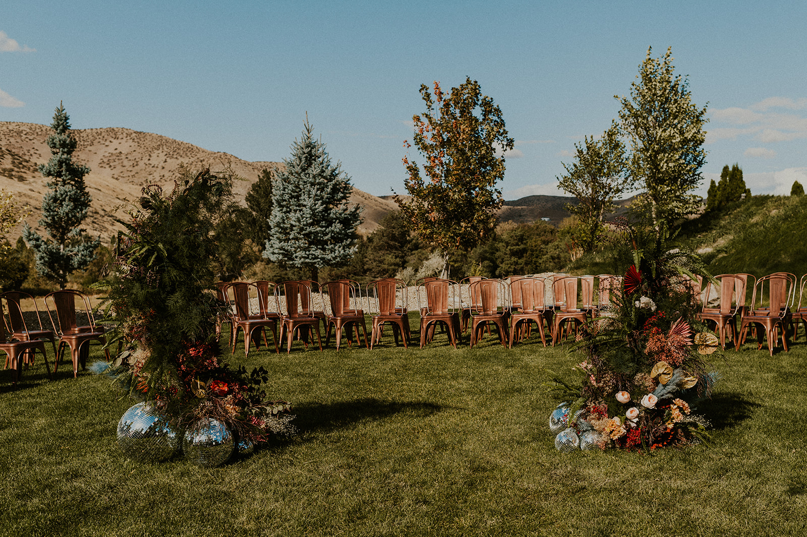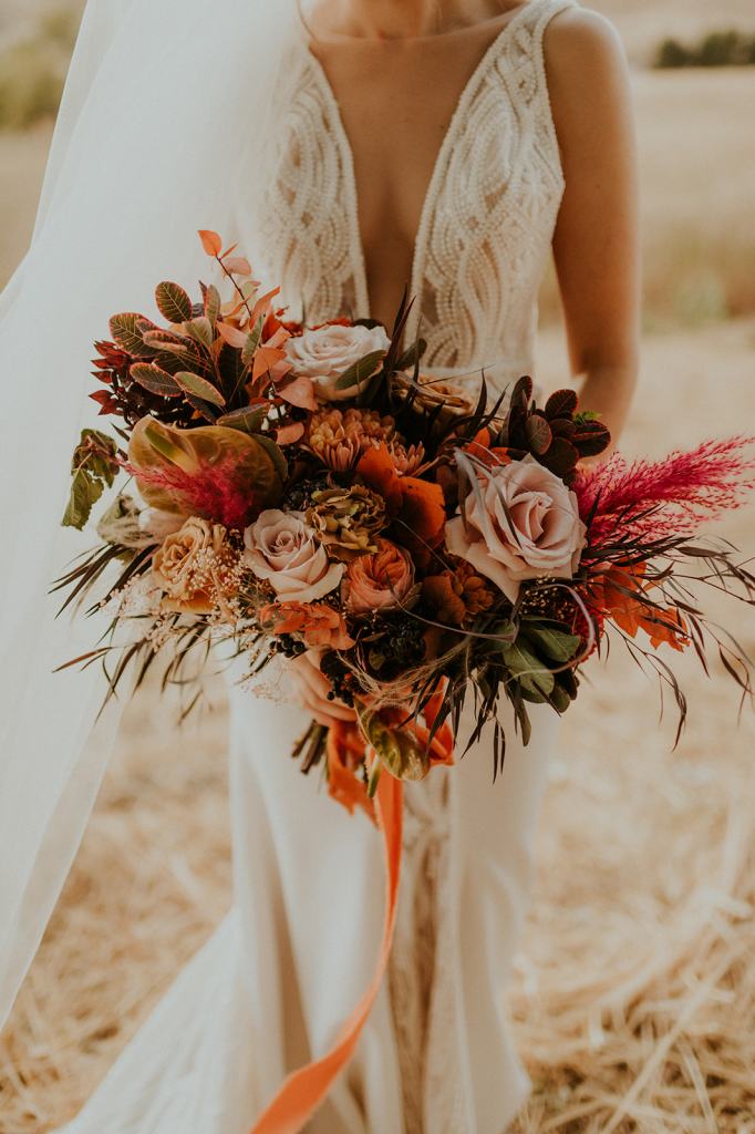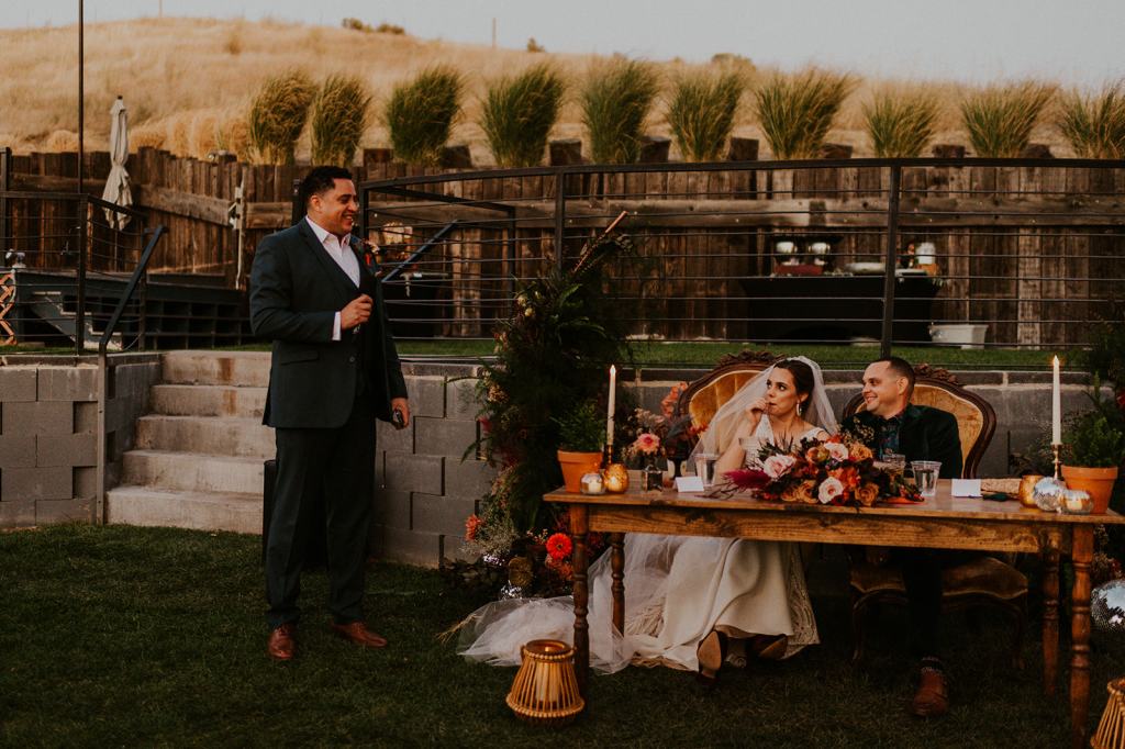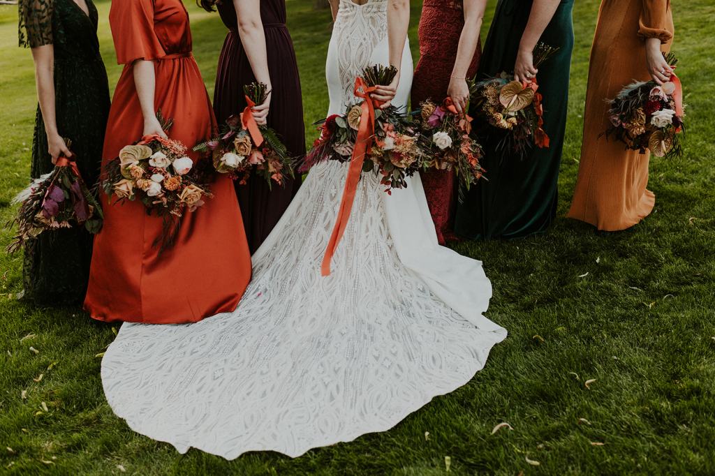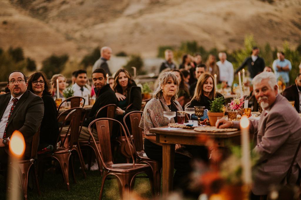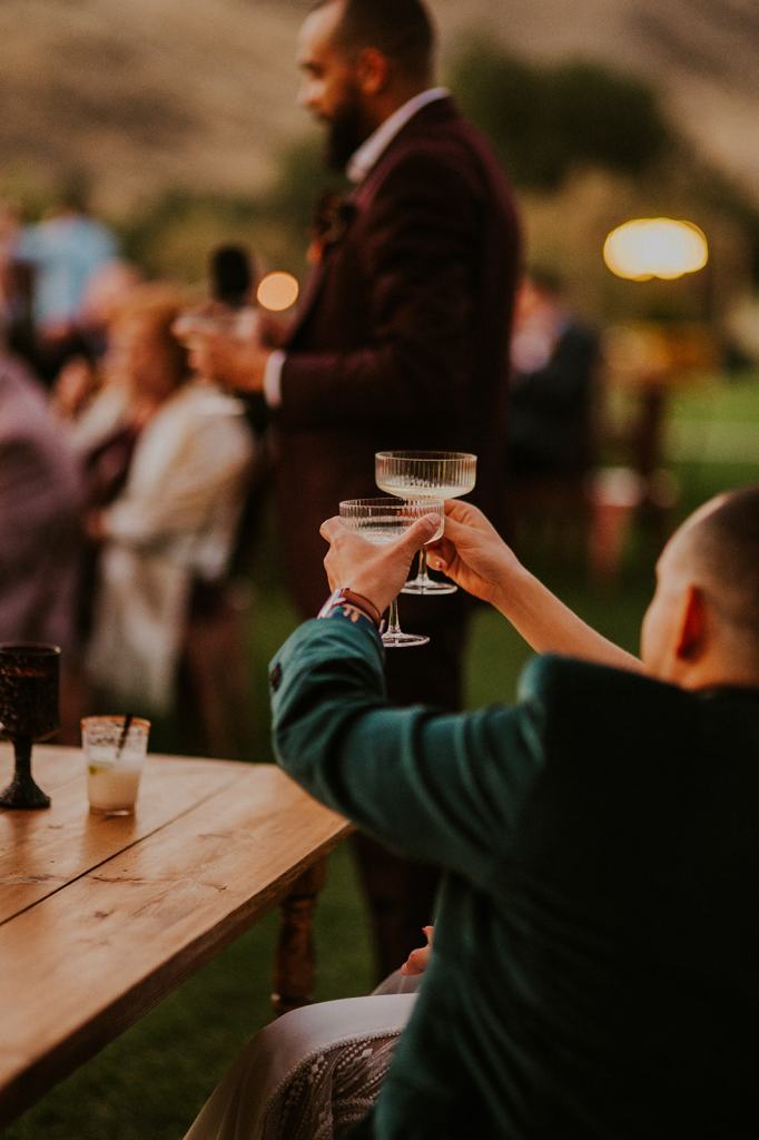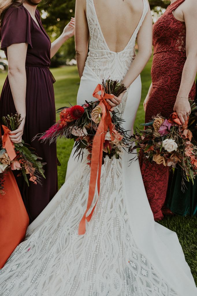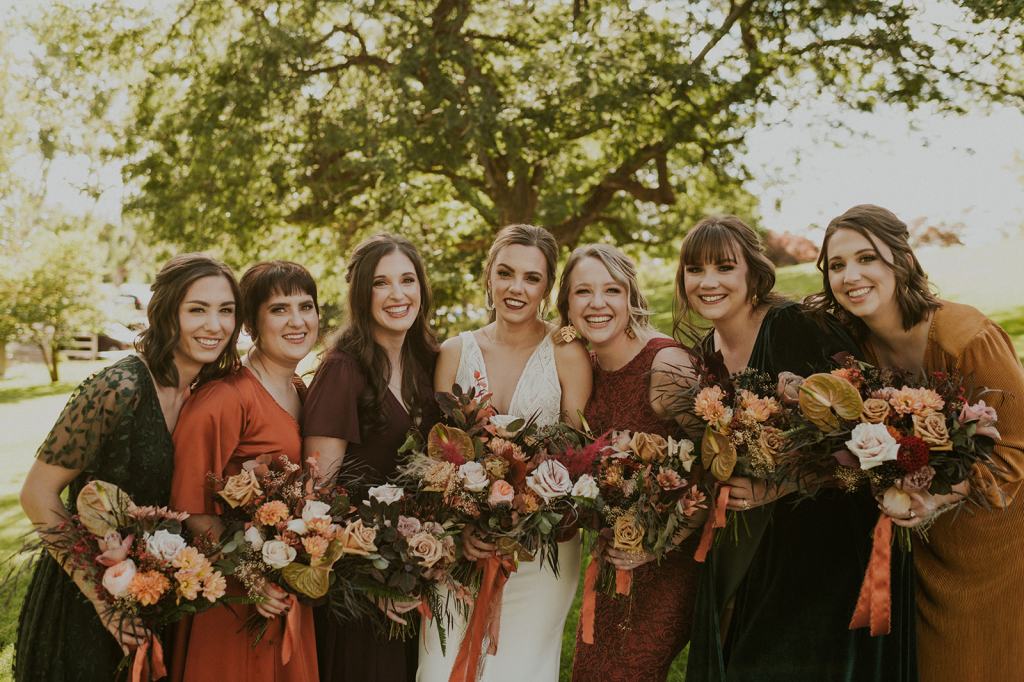 The details by Foxx and Fern were also unbelievable. I have worked with Caitlin before in McCall for Lyndsey and Brett’s Lavish Elopement and her eye for design blows me away. The custom seating chart with jewel toned tassels were adorable. Custom retro designed signage added personality to every table. I couldn’t get over the gorgeous cigar lounge designed for their cocktail hour with a neon sign reading “to the moon and back”. Also, the mismatched jewel toned bridesmaids dresses were incredible! If you love this Stone Crossing Boise Wedding, check out my link’s below 🙂